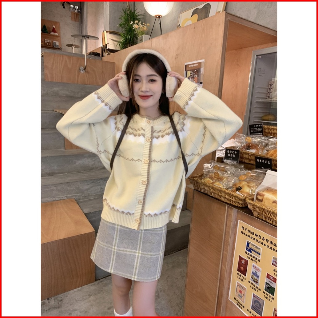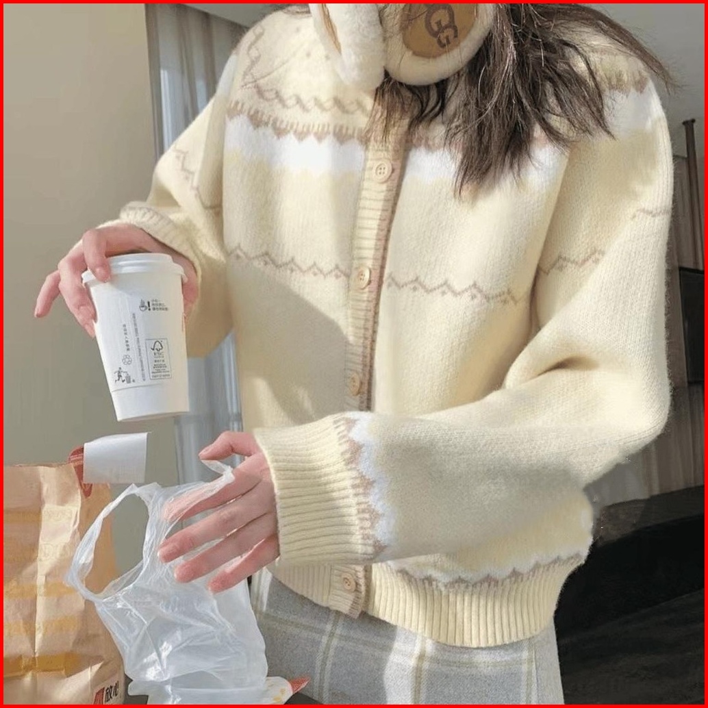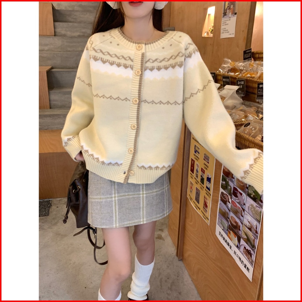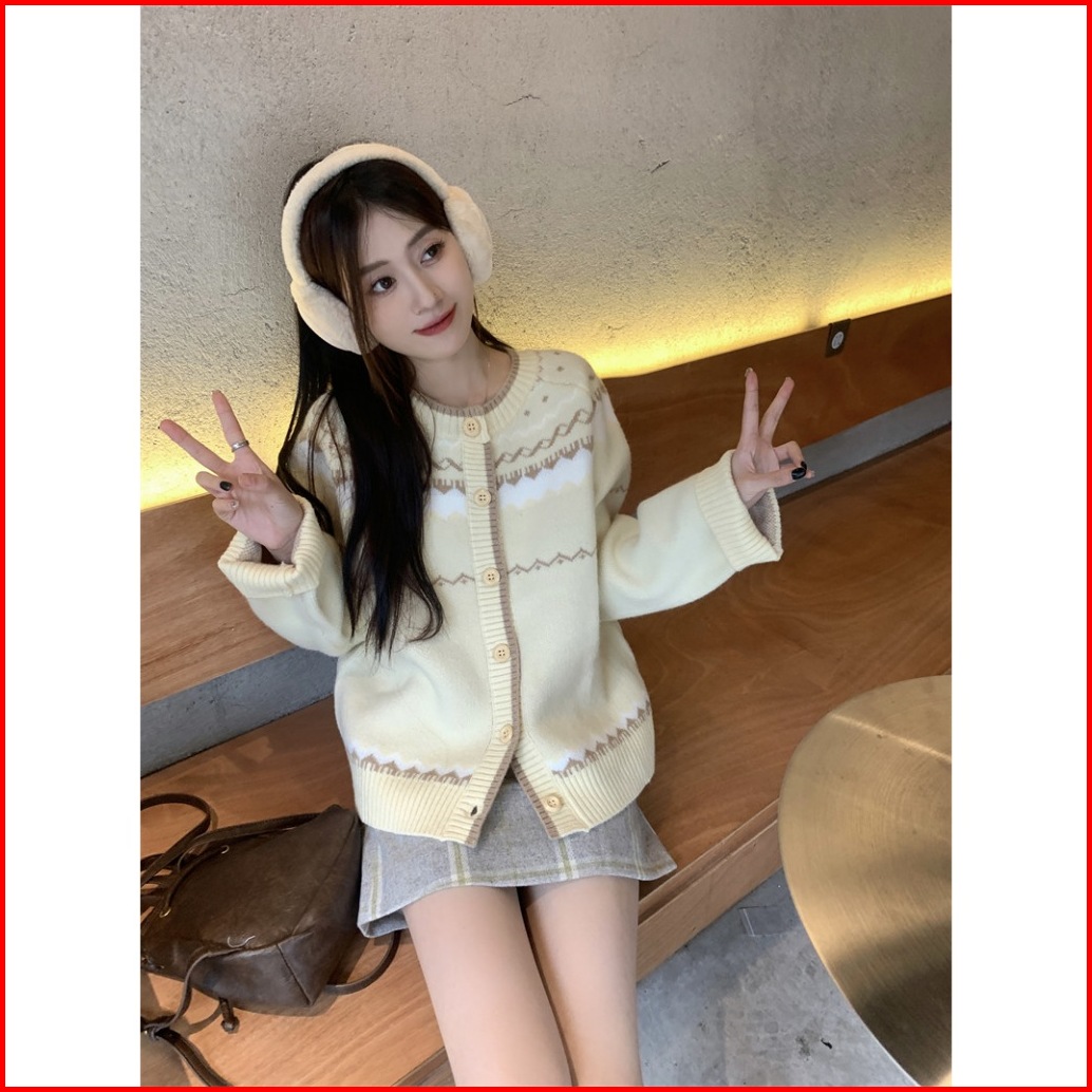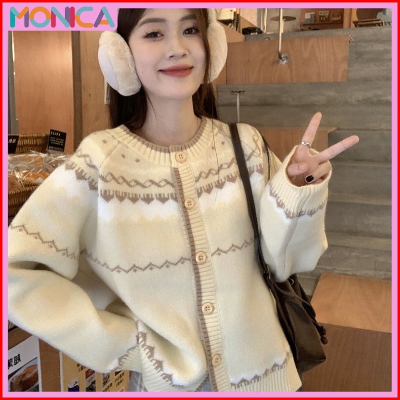 Monica Cardigan Imut Motif Zig Zag Beige Halus Knitwear Santai Wol Outer