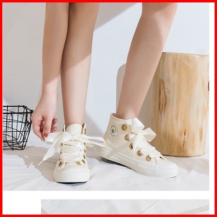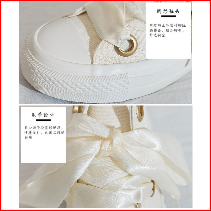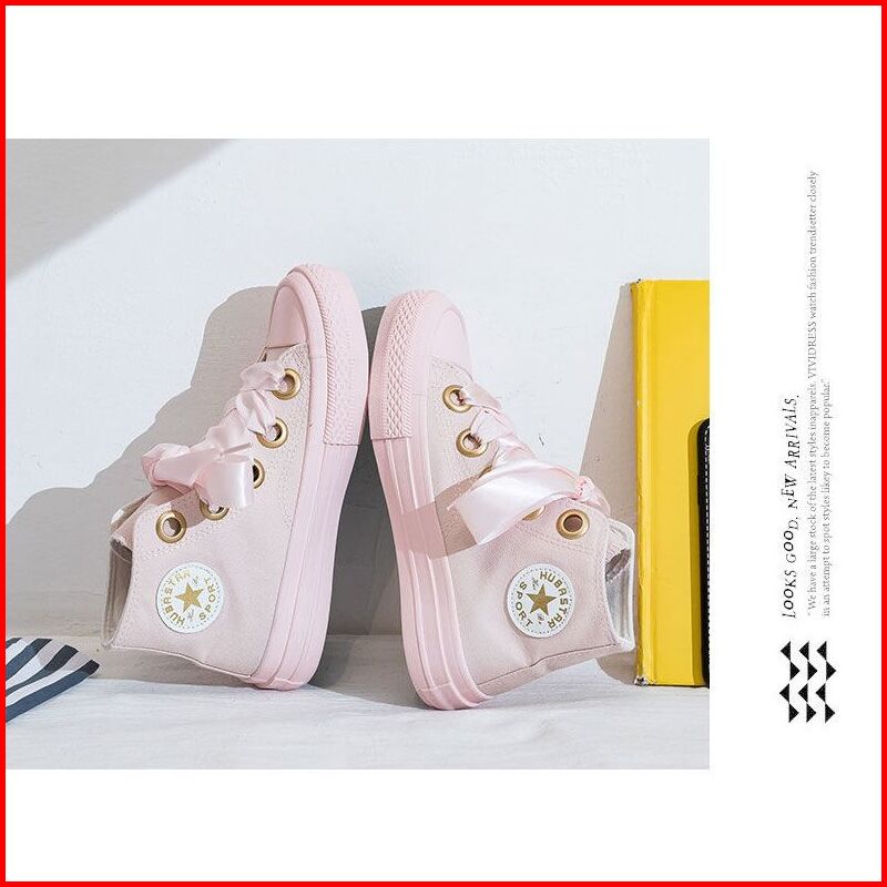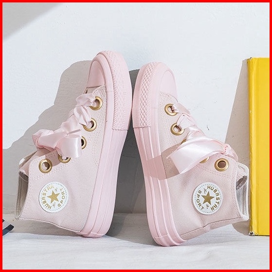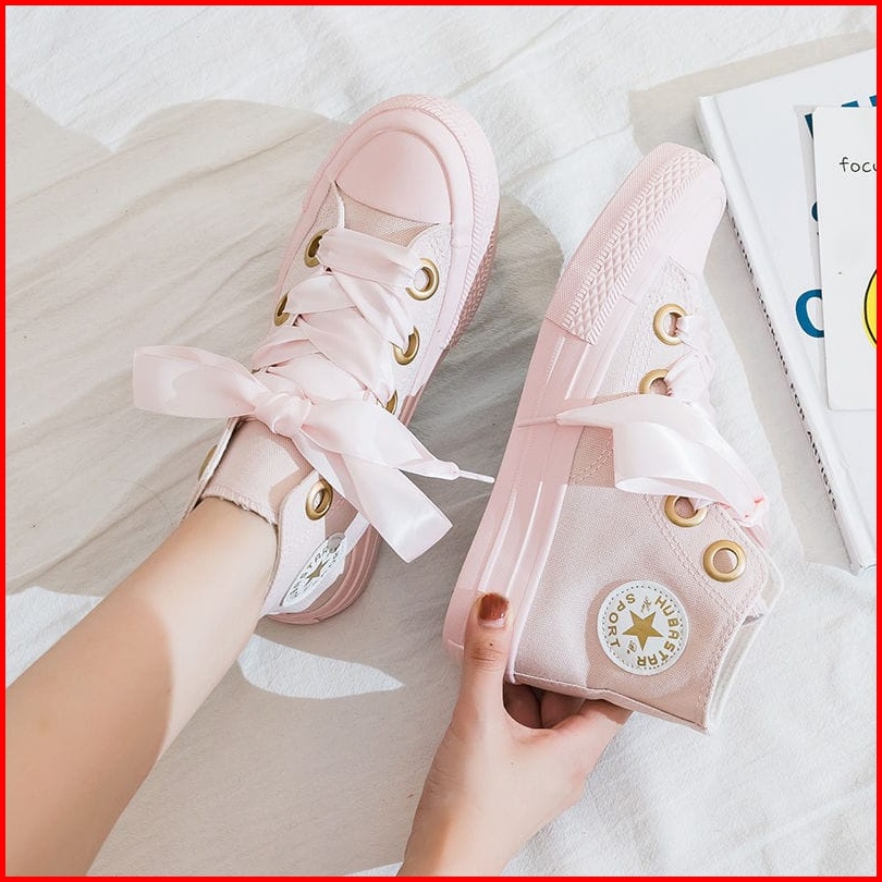 Idealife40 Sepatu Pita Satin High Top Wanita Sneaker Kanvas Cewek Pink Dan Cream