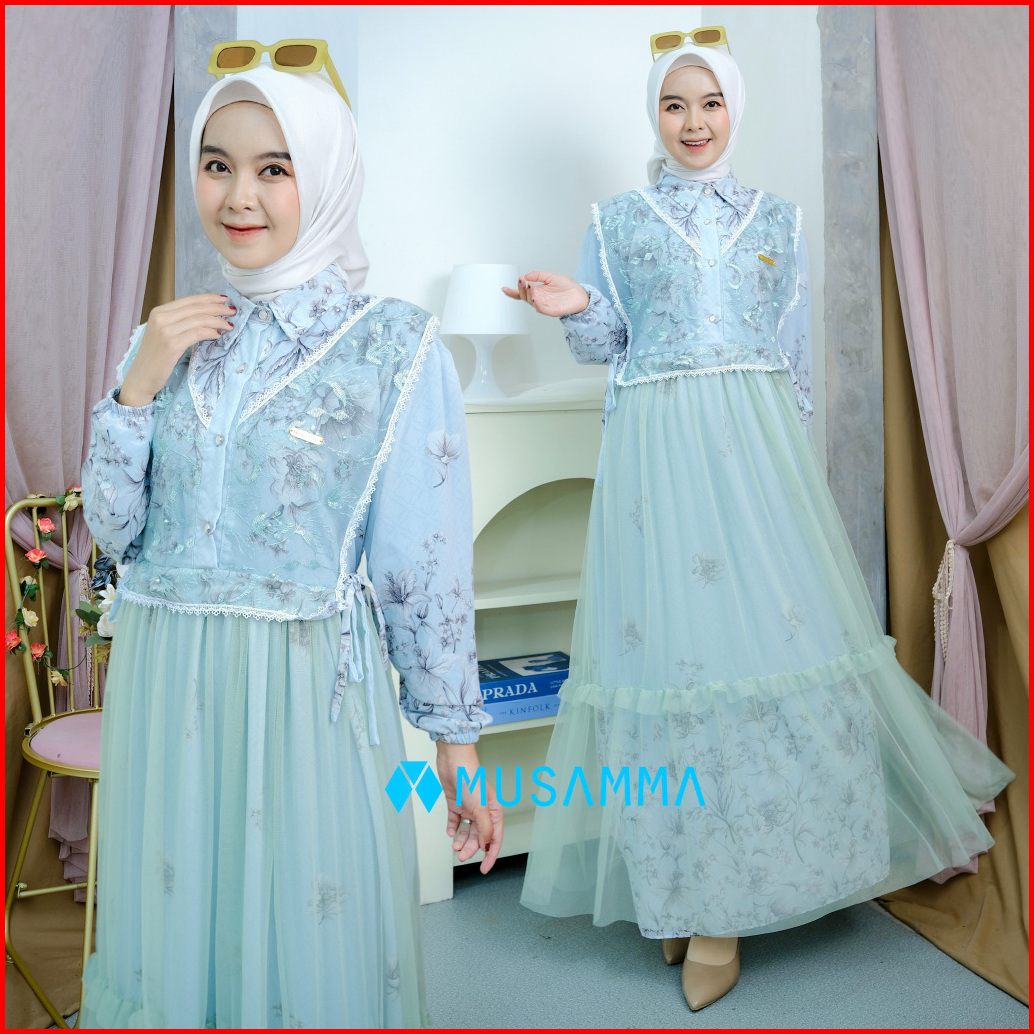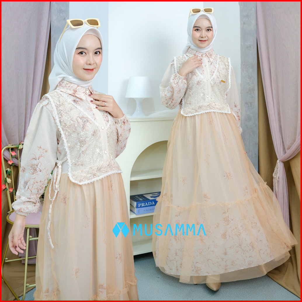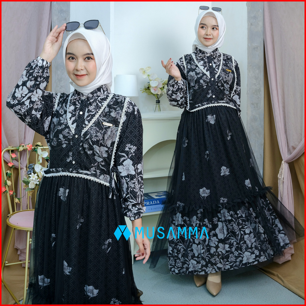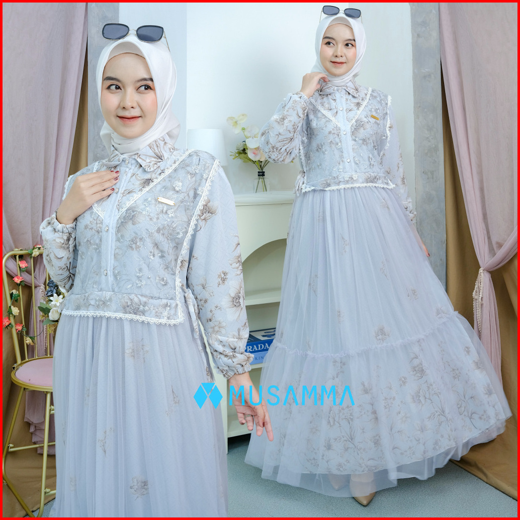 Ghina Dress - Gamis Ceruty Print Full Furing Mix Tile Renda Busui Dan Wudhu Friendly