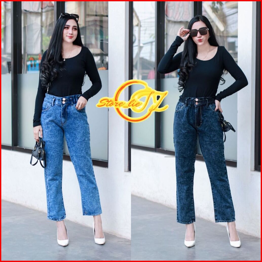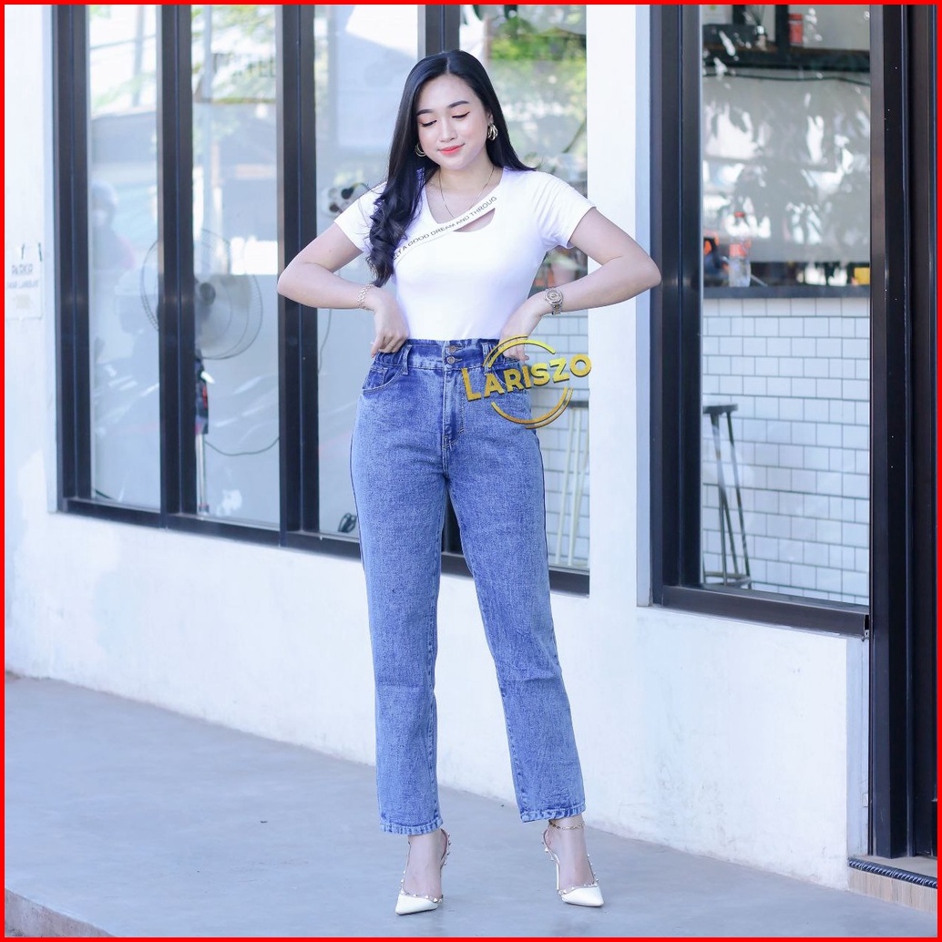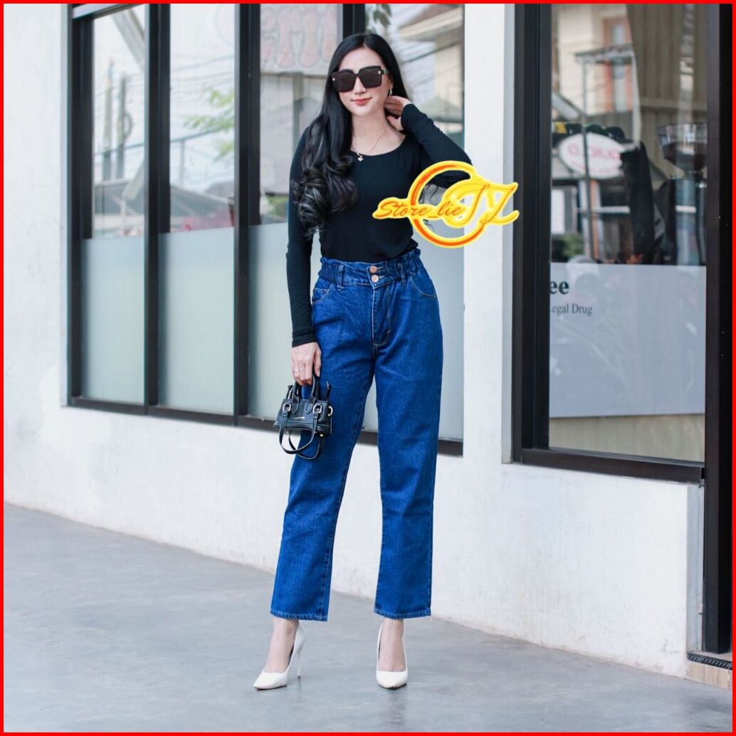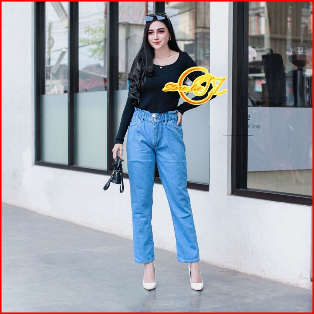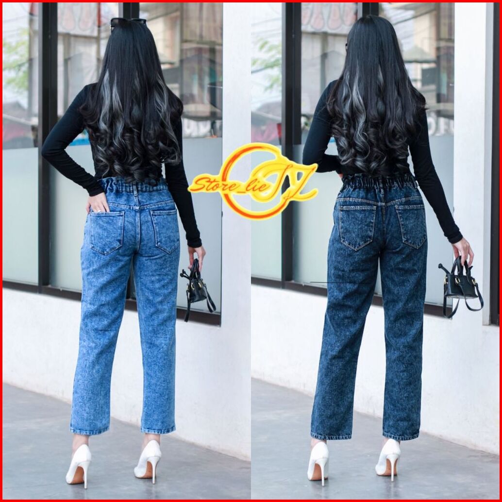 Boyfriend Higwaist Jeans Pinggang Karet Kerut Kancing 2 Celana Jeans Wanita Kekinian Real Pict