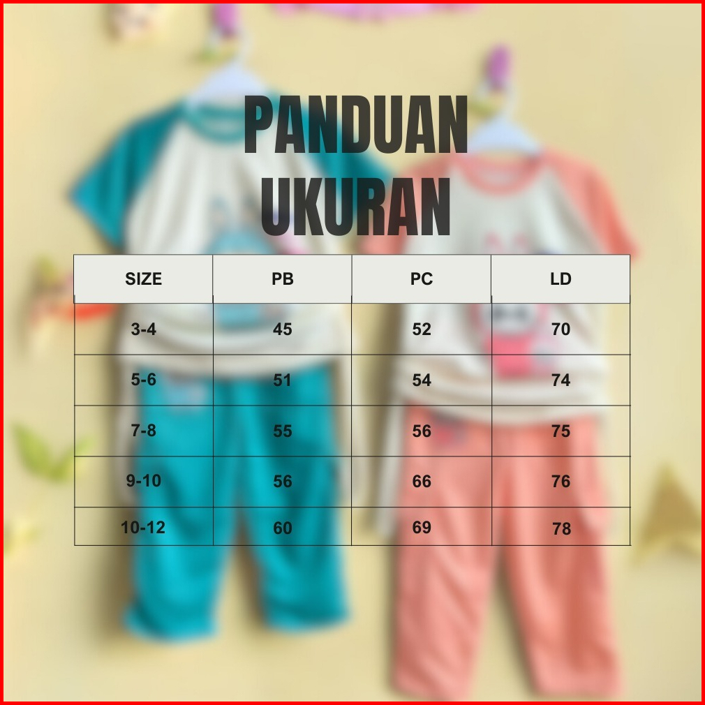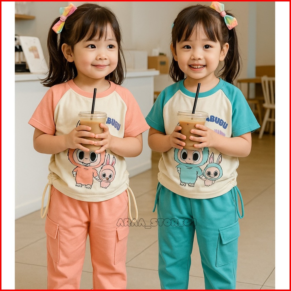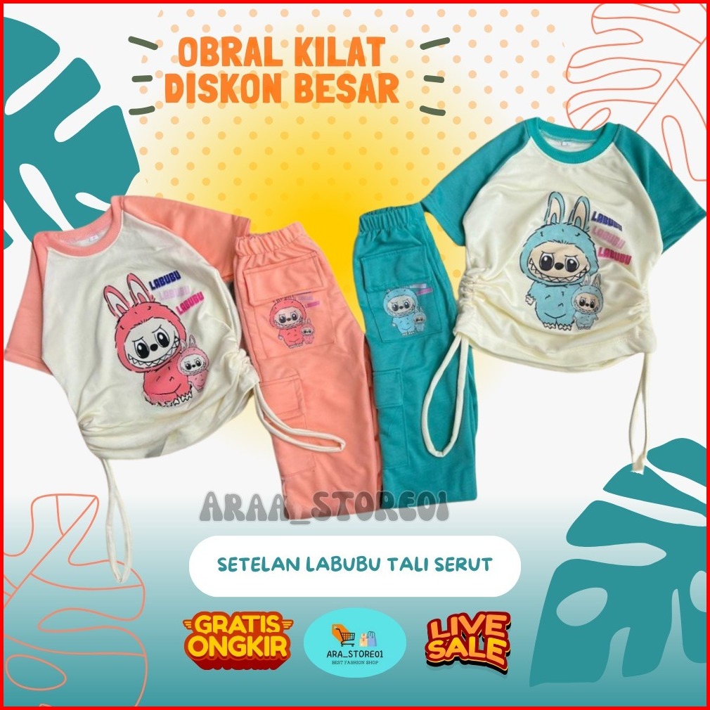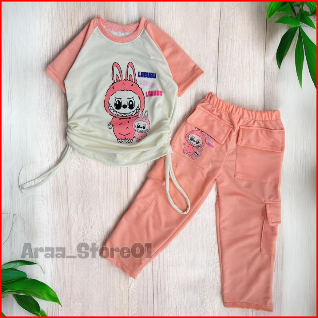 Baju Setelan Labubu Tali Serut Anak Perempuan Celana Kargo Usia 3 Sampai 12 Tahun