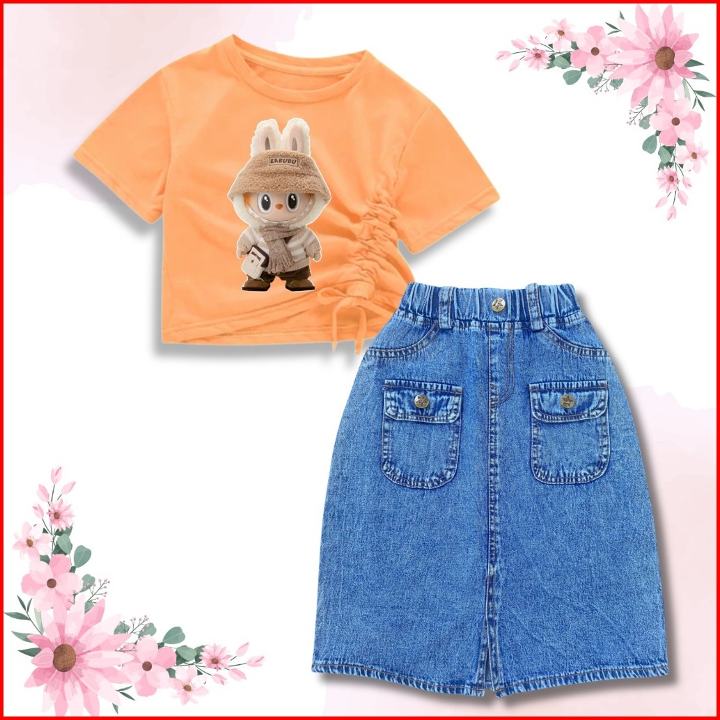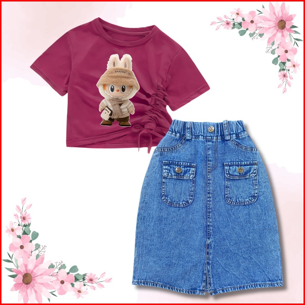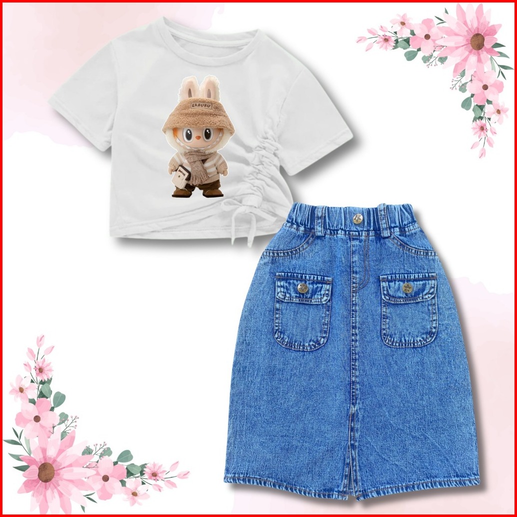 Setelan Rok Jeans Panjang Saku Depan Anak Perempuan 1-12 Tahun