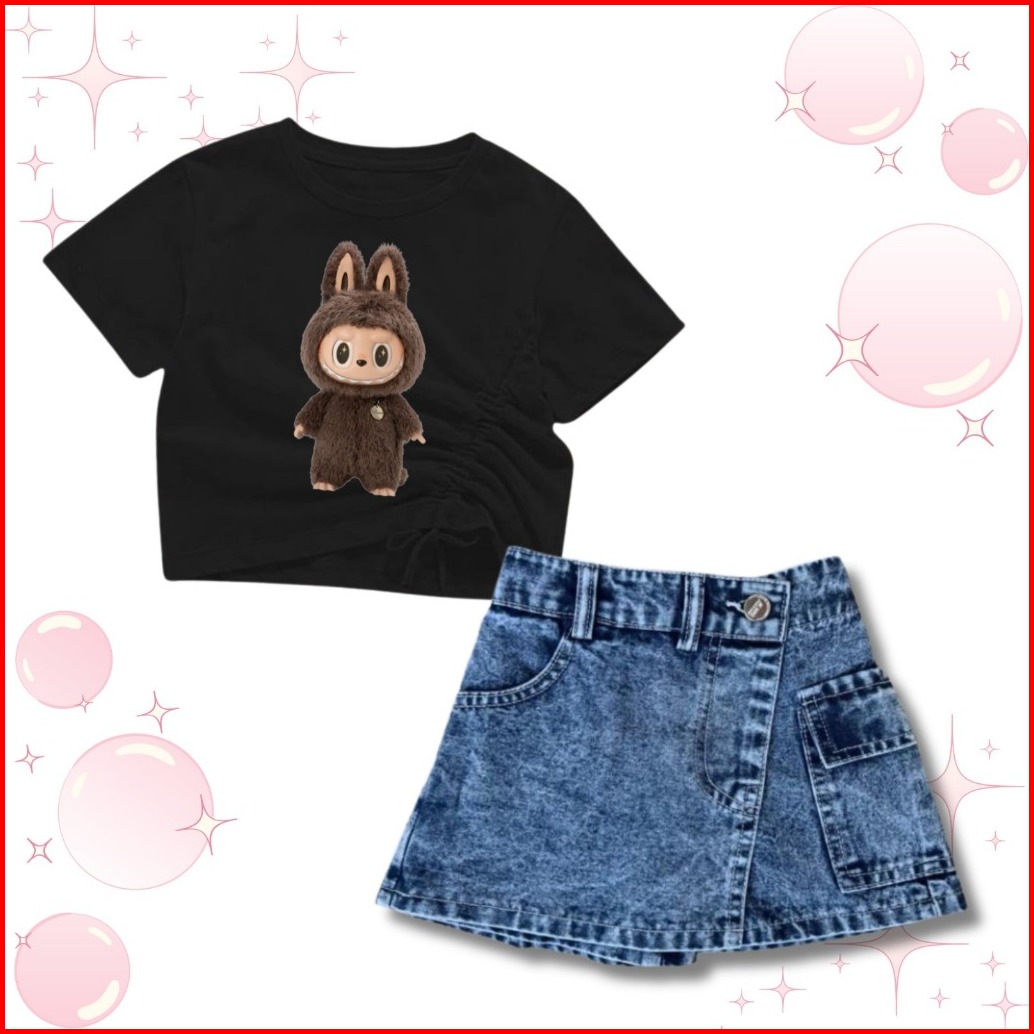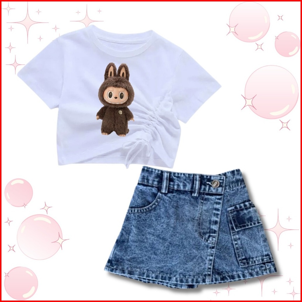 Setelan Rok Kargo Jeans Rokcel Anak Perempuan Motif Labubu
