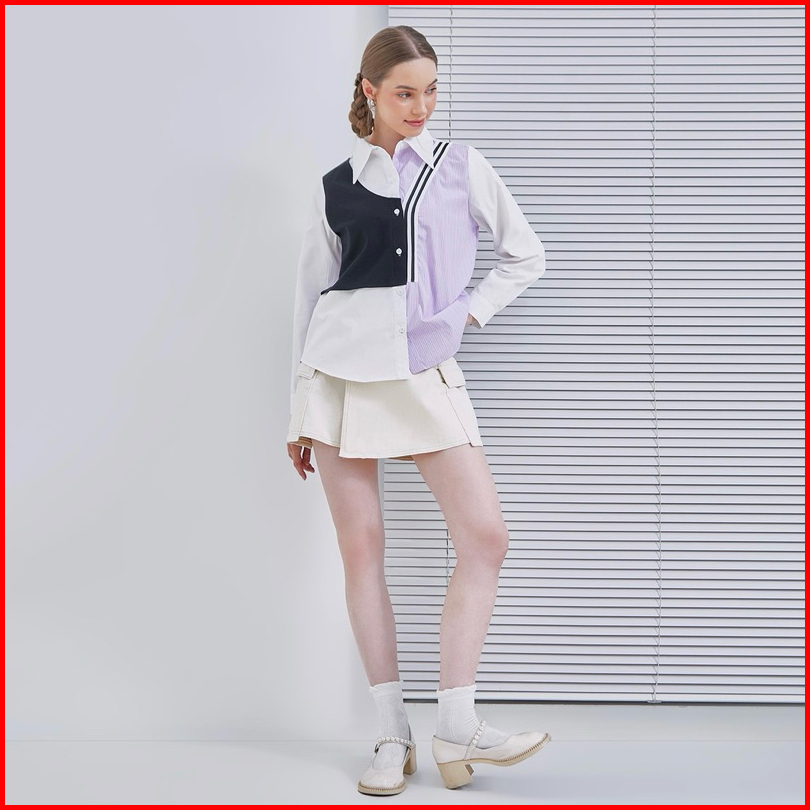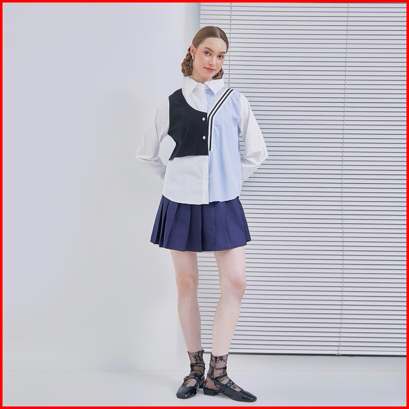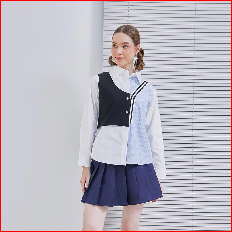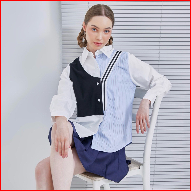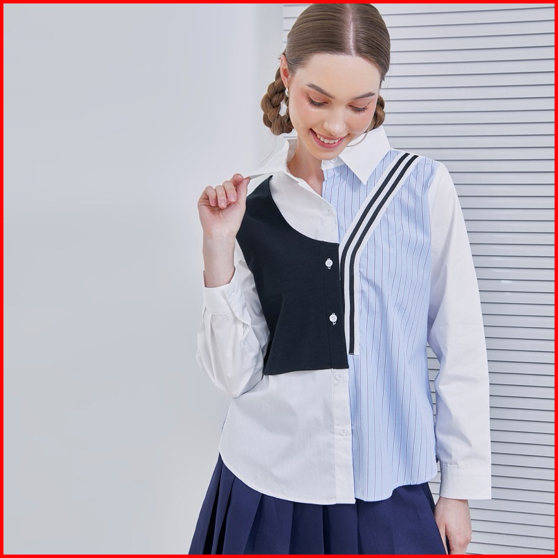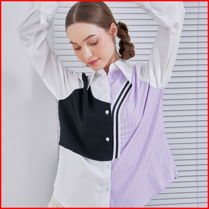 Senchi - Shima Stripes Combination Shirt Atasan Kemeja Wanita Kemeja Wanita Style Jepang Korea Atasan Wanita Kombinasi S