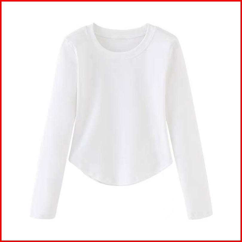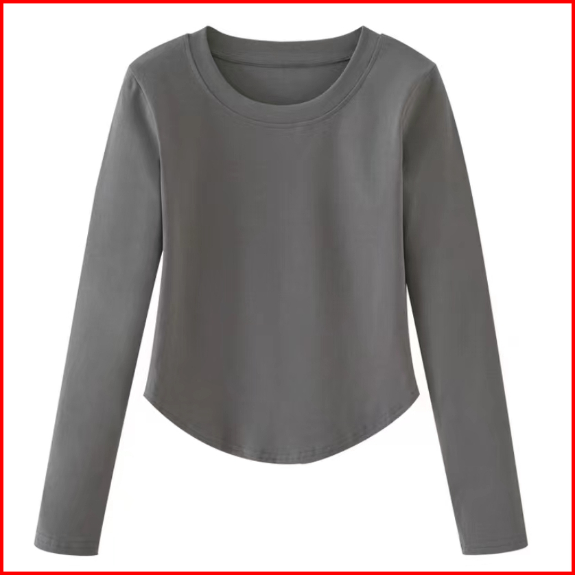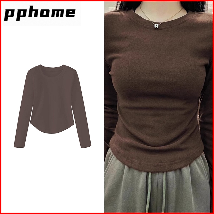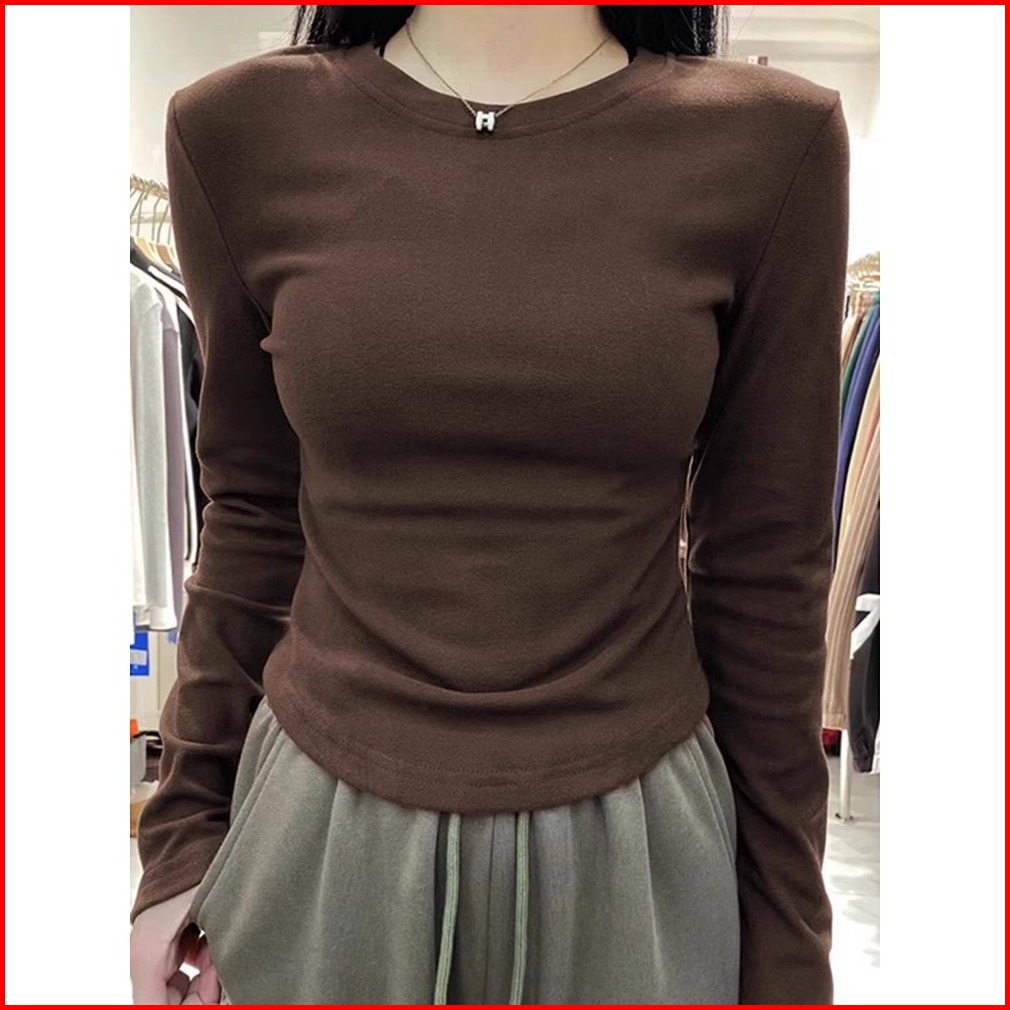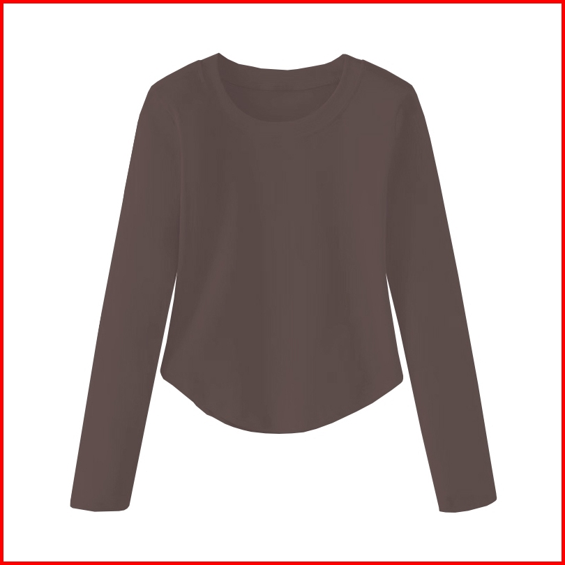 Atasan T-shirt Lengan Panjang Wanita Ramping Dengan Ujung Melengkung Leher Bulat Berwarna Coklat