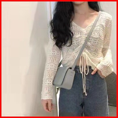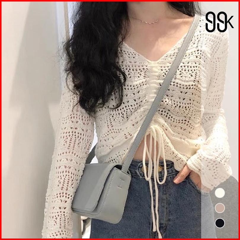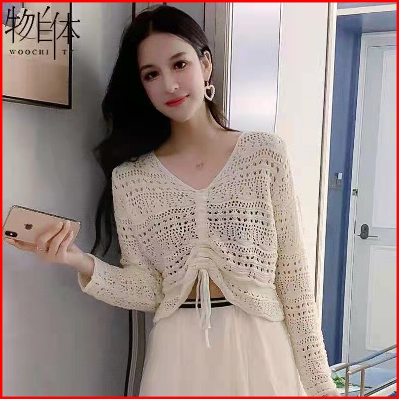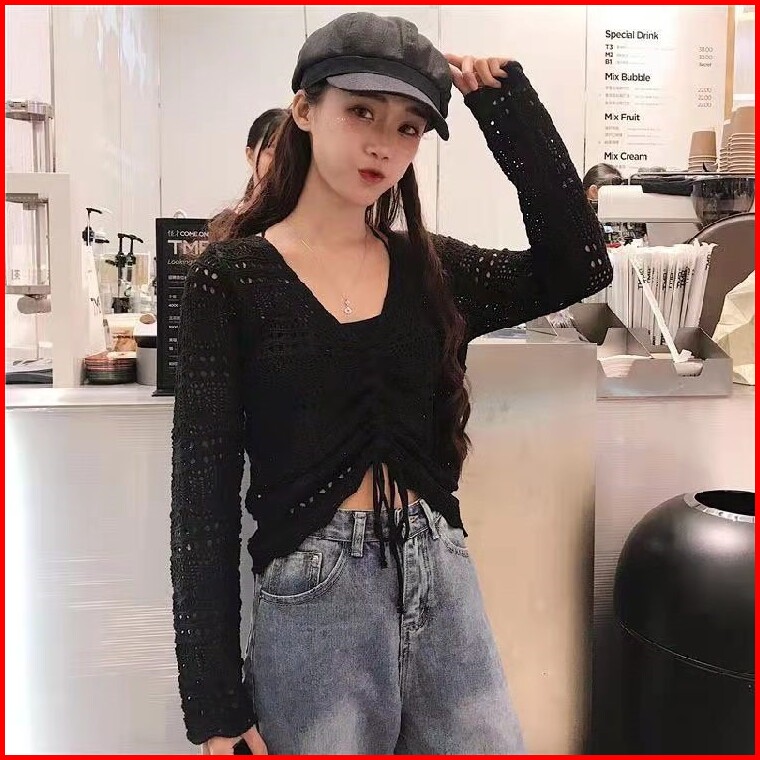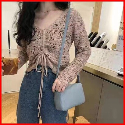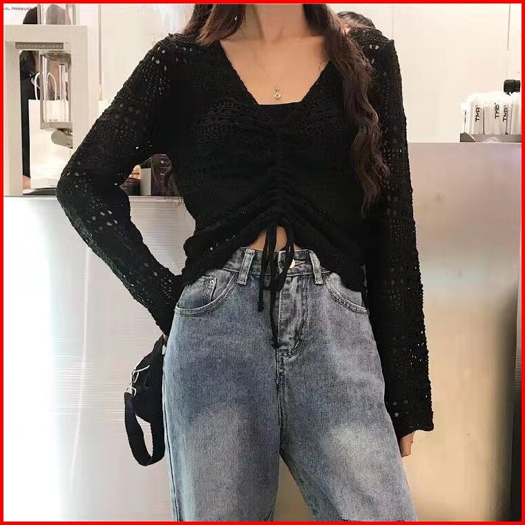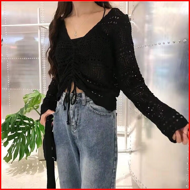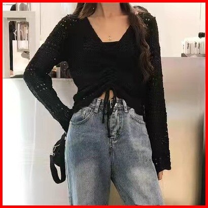 Long Sleeve Drawstring Front Crochet Knit Top 2151