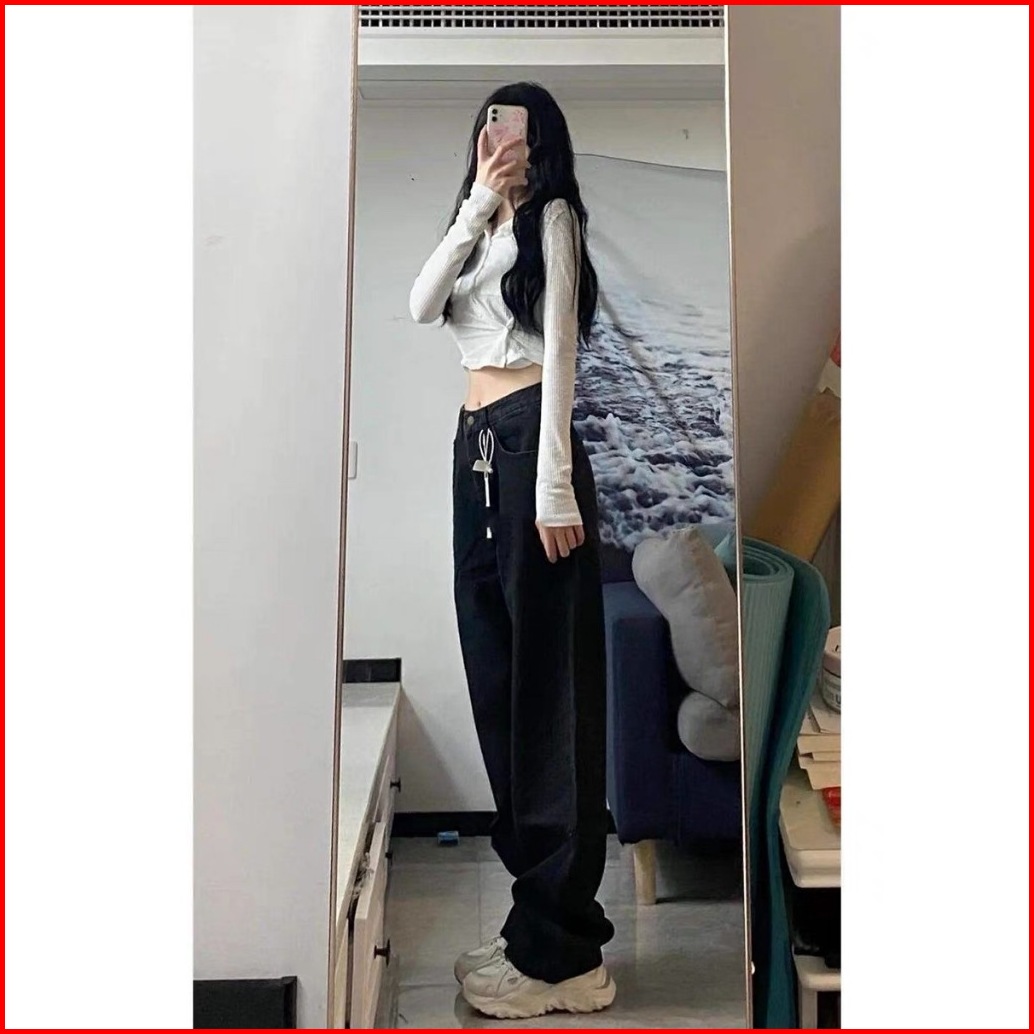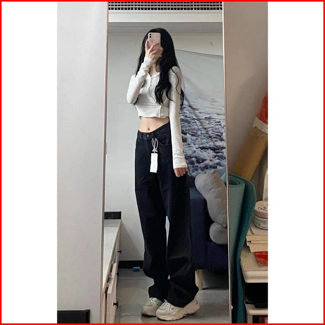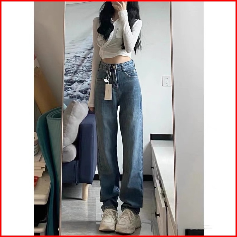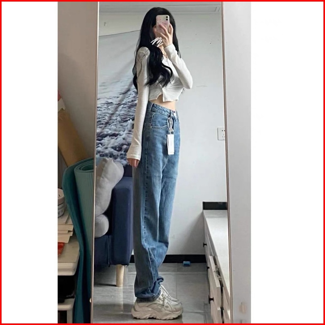 Celana Jeans High Waist Wanita Korean Style Jeans Baggy Pants Serbaguna Kasual Biru Retro