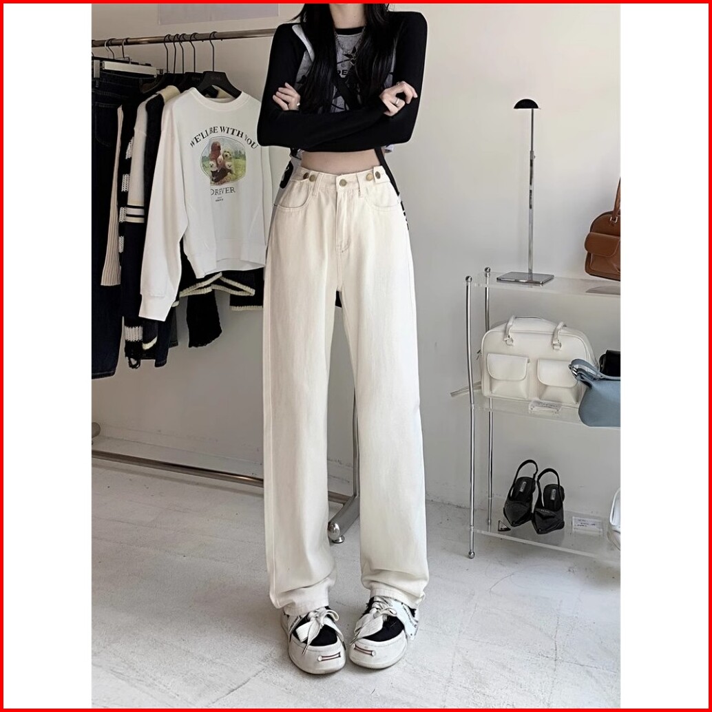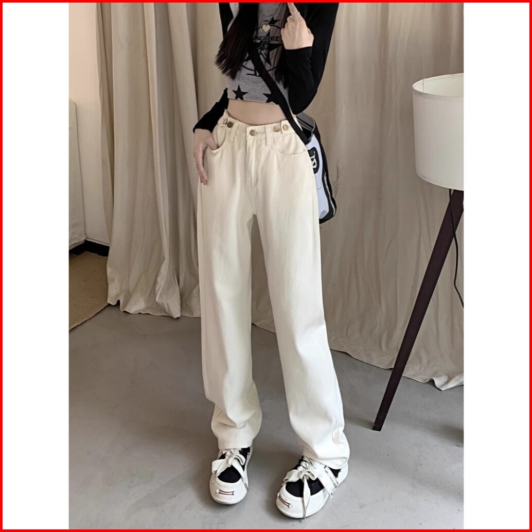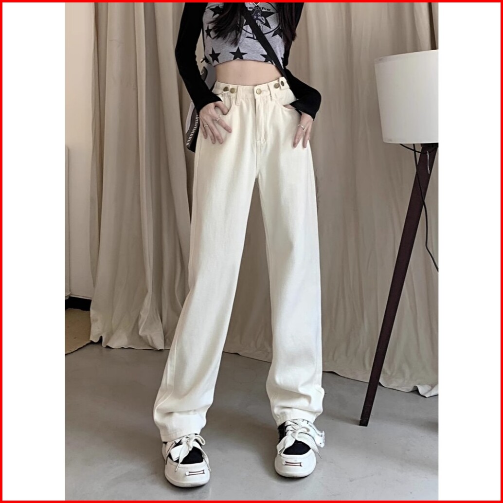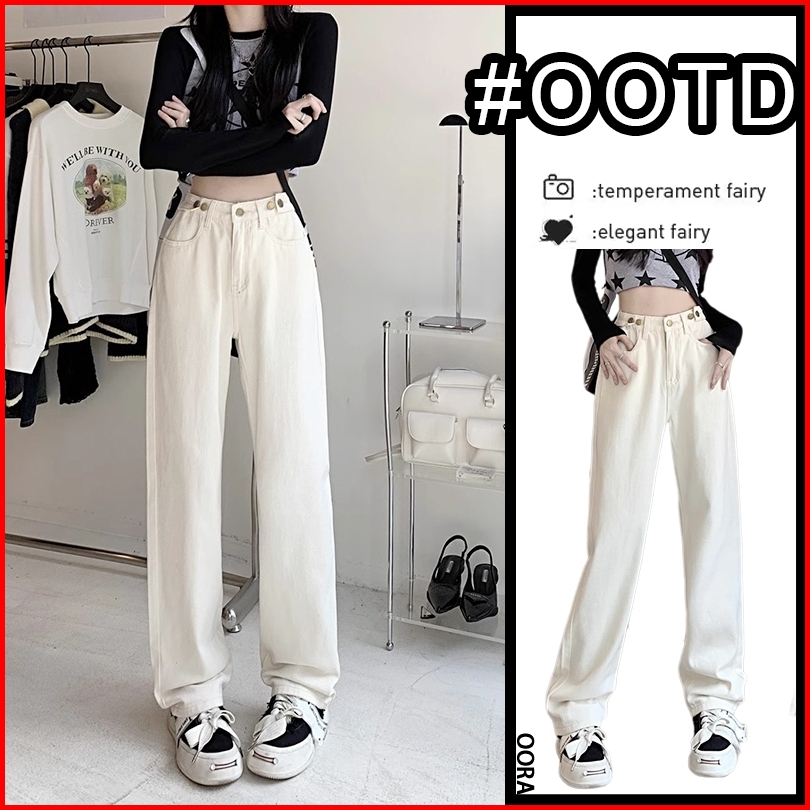 Oora Korean Style Celana Jeans Putih Wanita High Waist Kaki Lebar Pinggang Tinggi Celana Lurus Versatile Jins Celana Wan