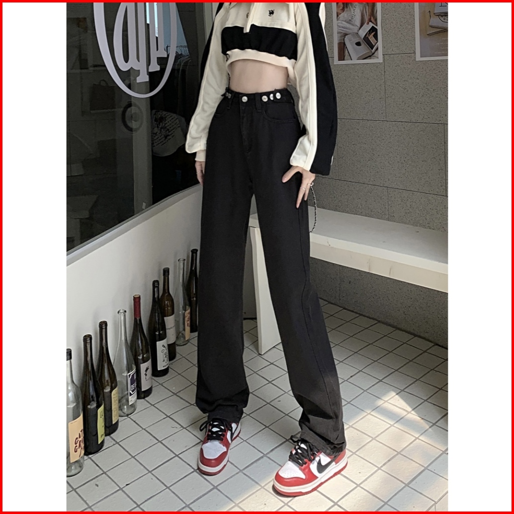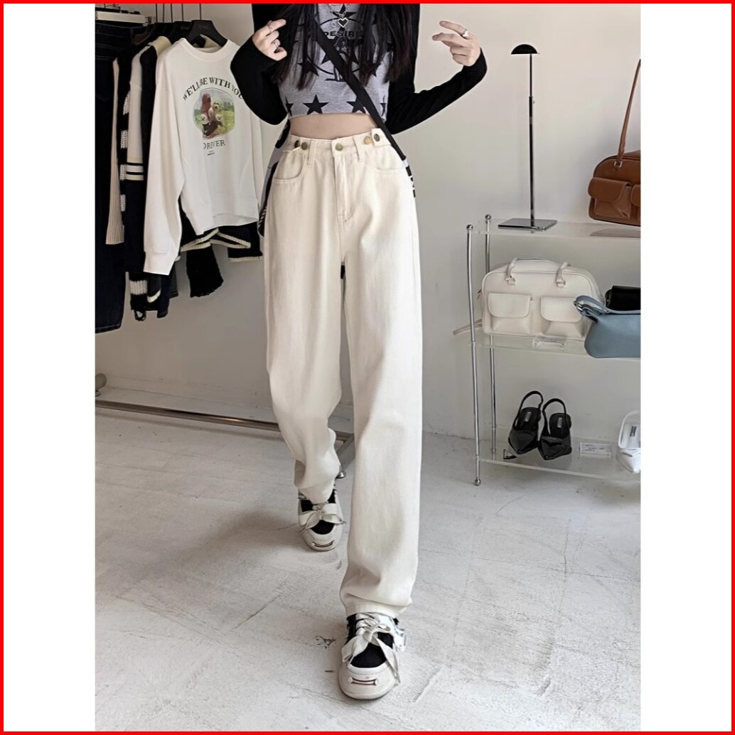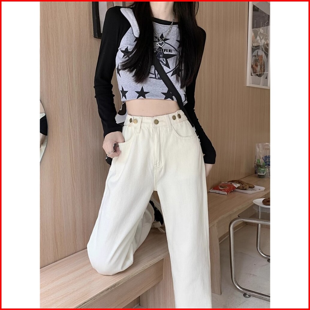 Oora Korean Style Celana Jeans Putih Wanita High Waist Kaki Lebar Pinggang Tinggi Celana Lurus Versatile Jins Celana Wan