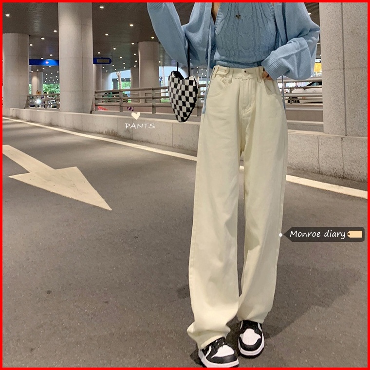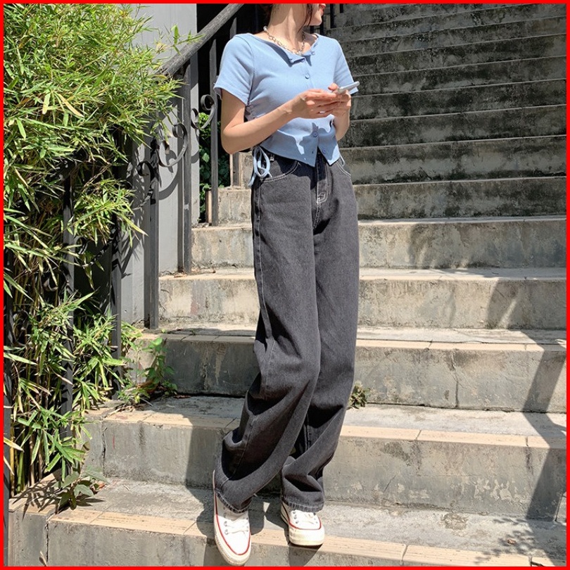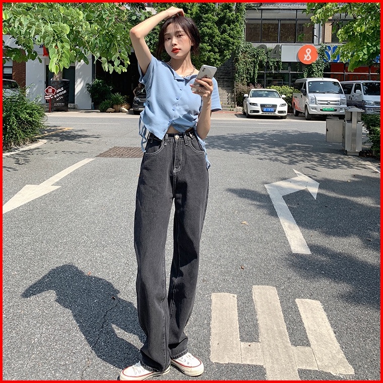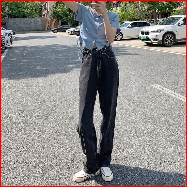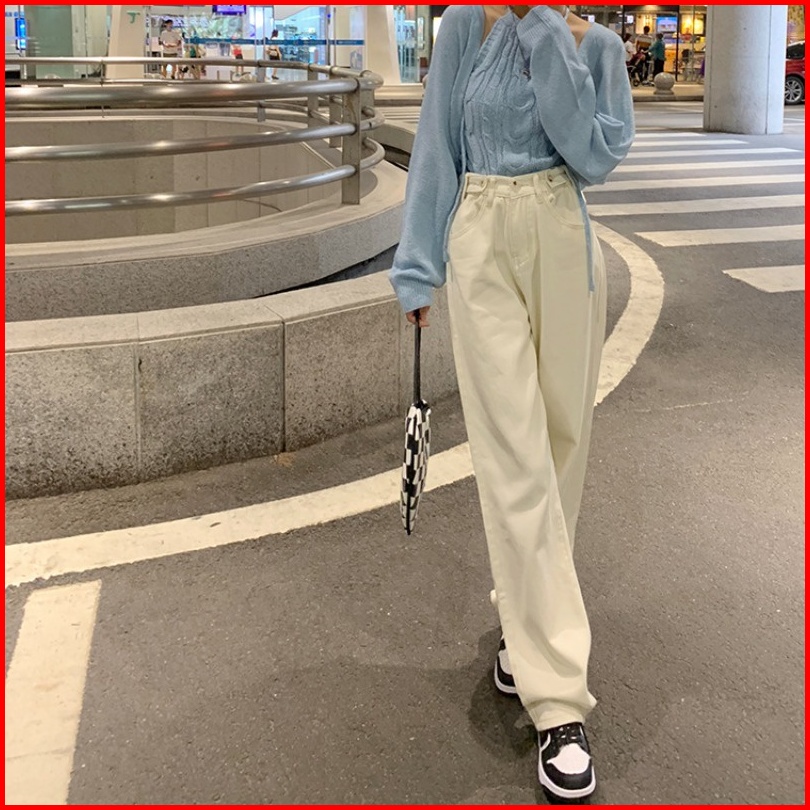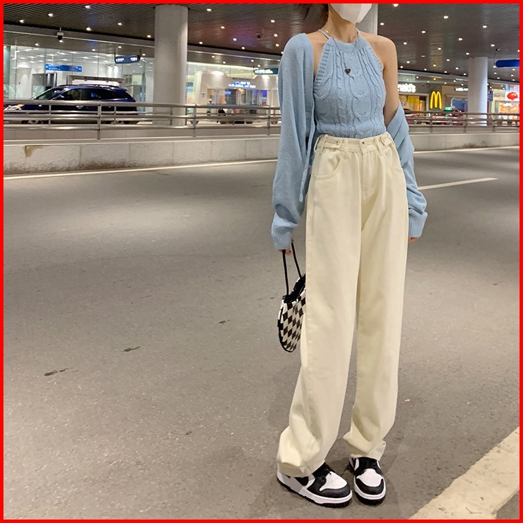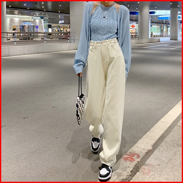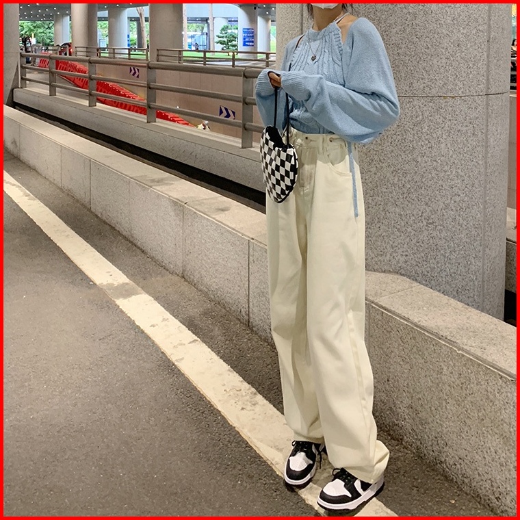 Krem Hitam Celana Panjang Model Longgar Lebar Gaya Korea Retro Bahan Jeans Untuk Wanita