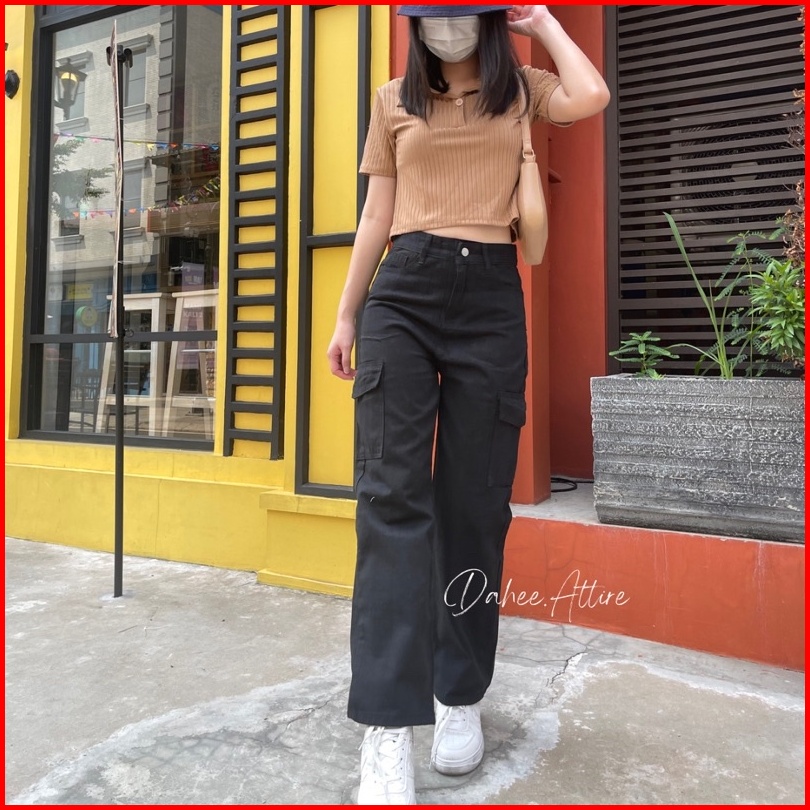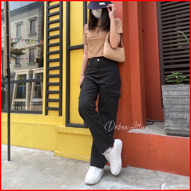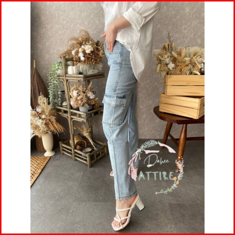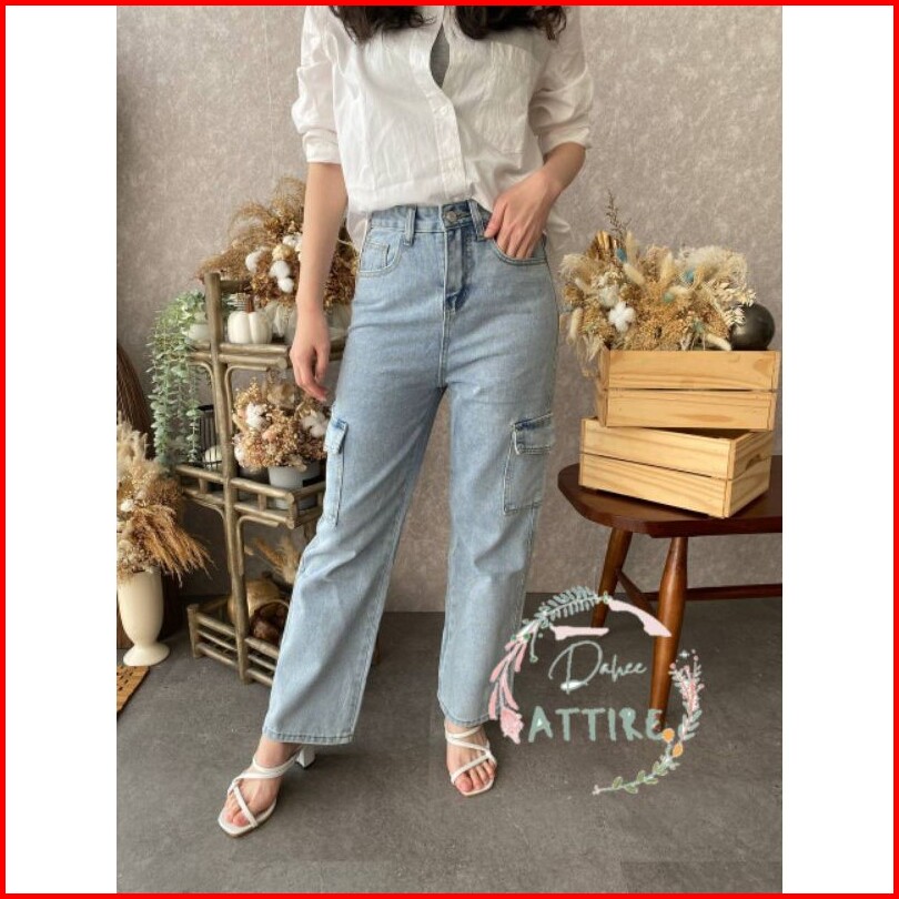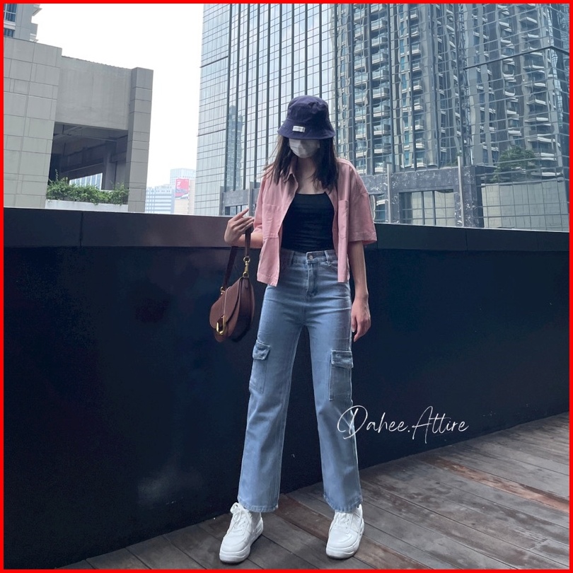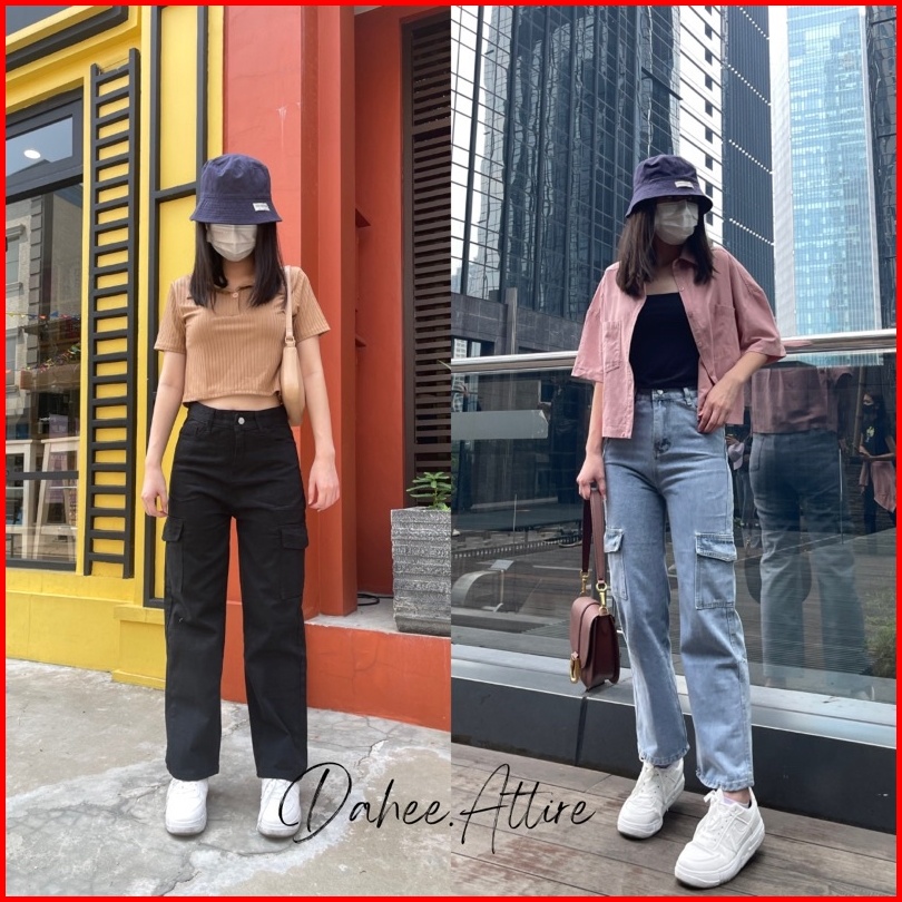 Celana Highwaist Cargo Jeans Baggy Import Wanita Kekinian - Dahee X56