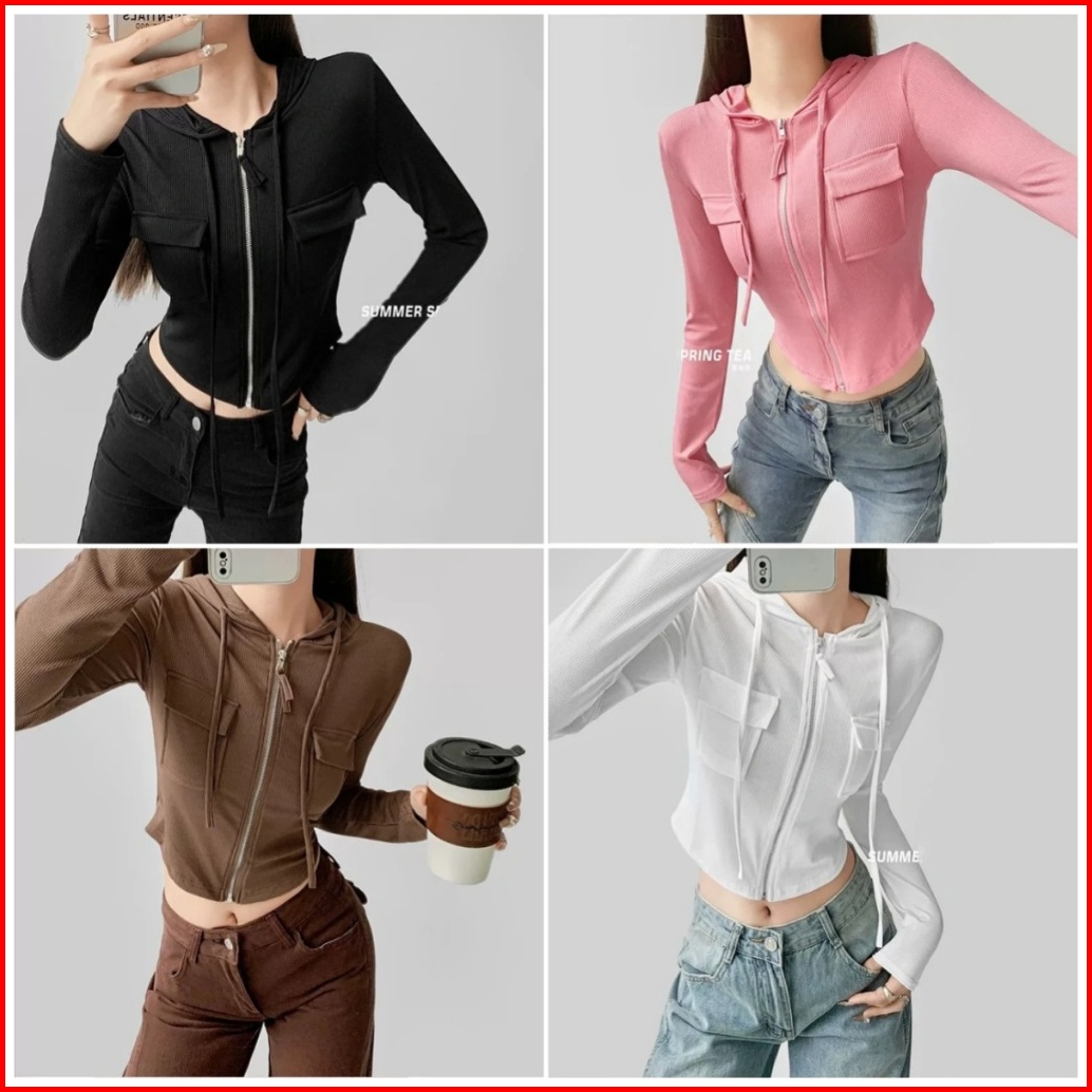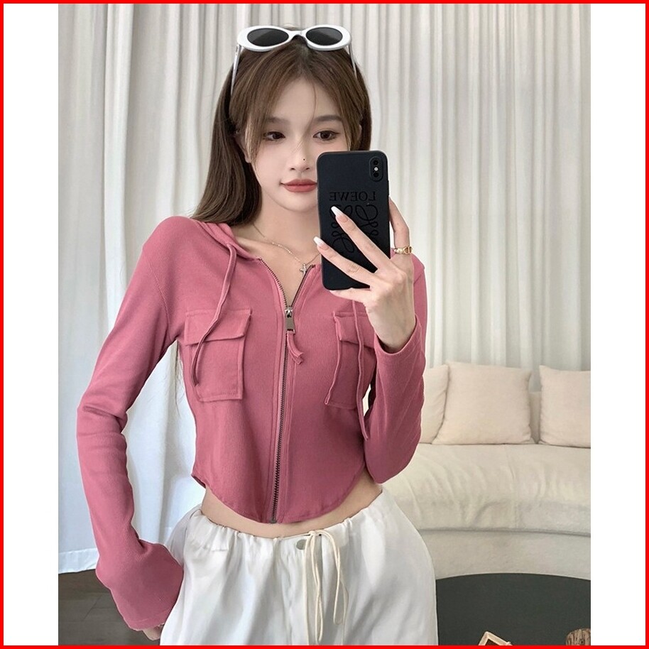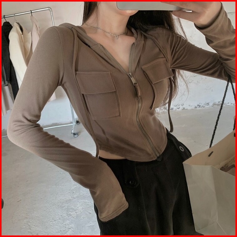Jaket Kardigan Berkerudung Pendek Hoodie Atasan Ritsleting Kardigan Lengan Panjang Ramping Wanita