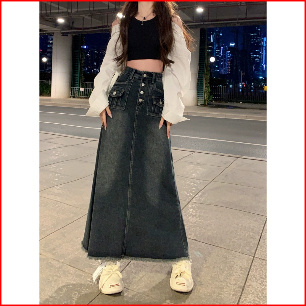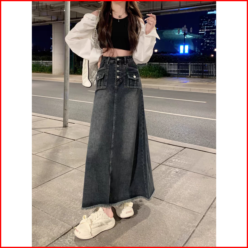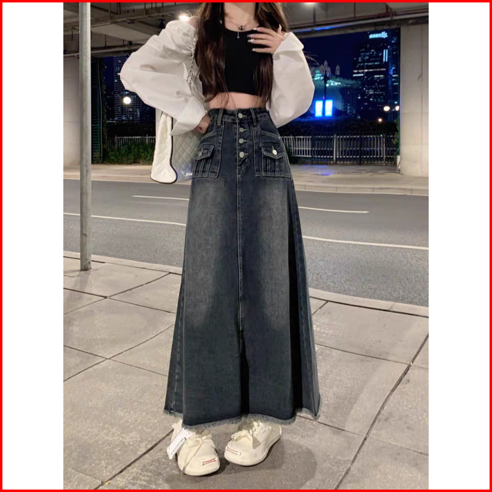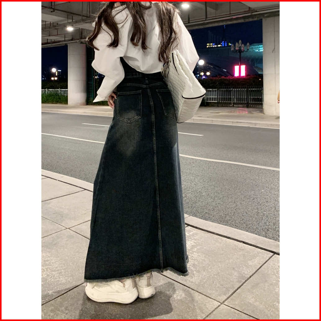 Rok Korean Style Panjang High Waist Slit A-line Skirt Rok Jeans Panjang