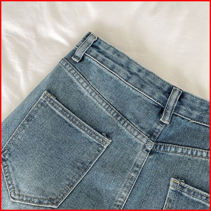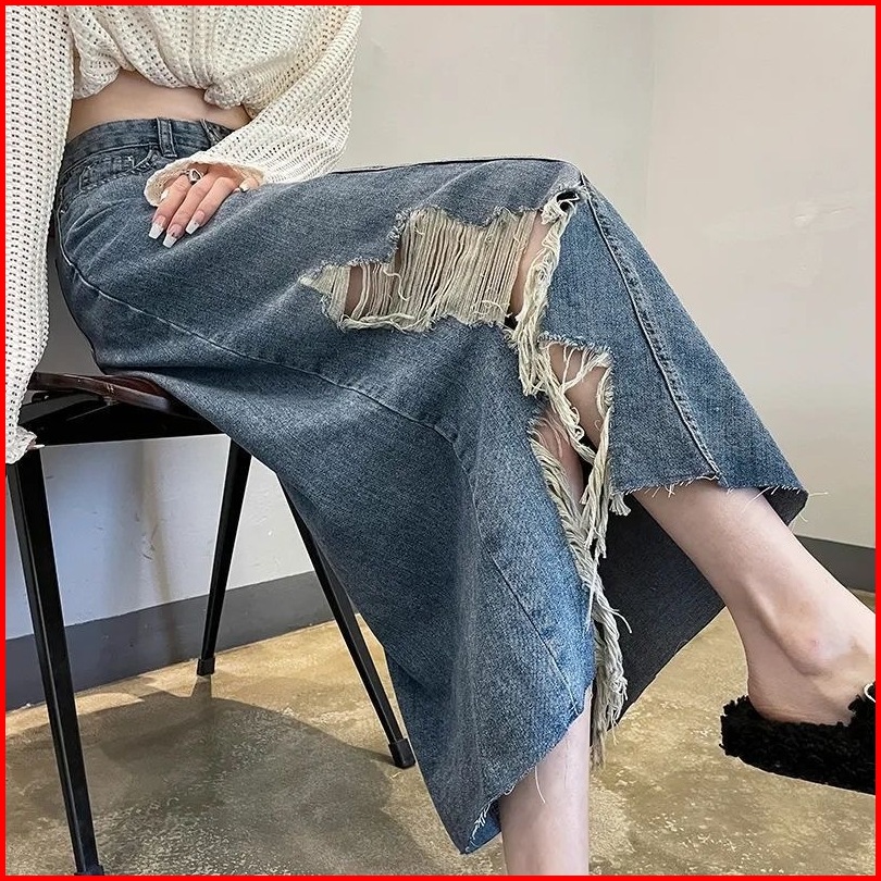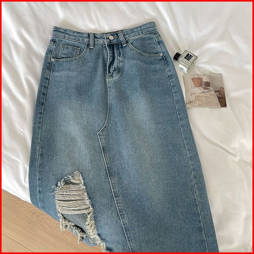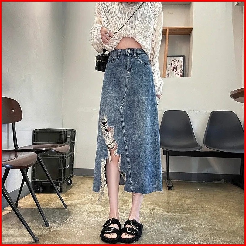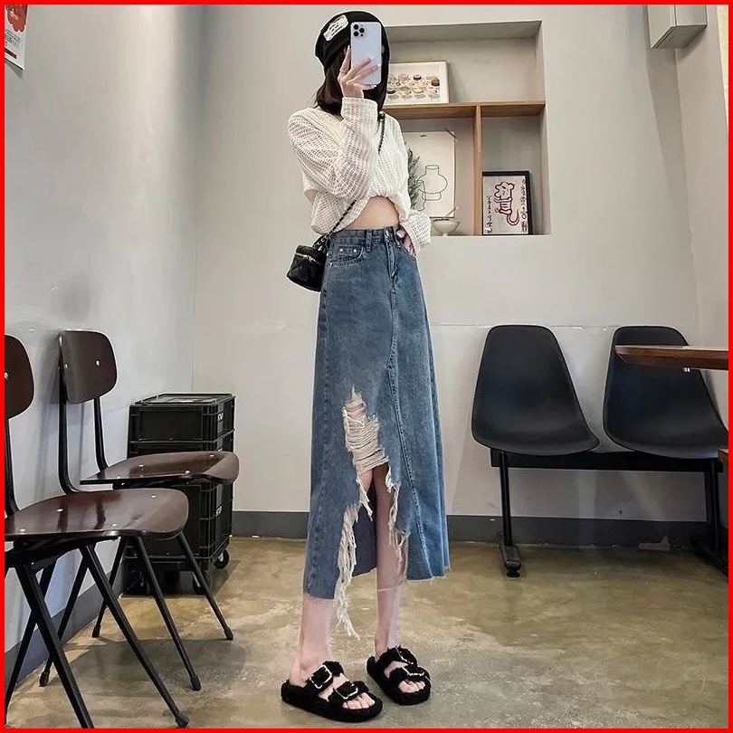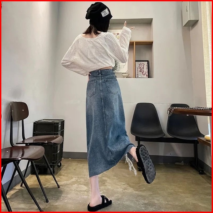Xiaozhainv Highwaist Terbaru Kekinian Rok Jeans Denim Belahan Ukuran Besar Rok Biru Highwaist A-line Skirt Midi Rok Kore