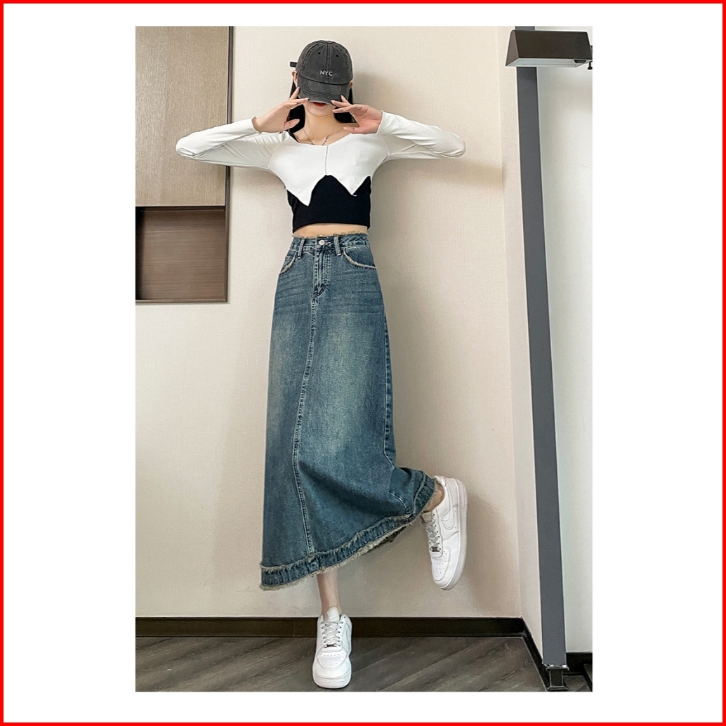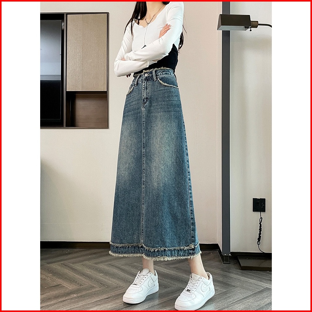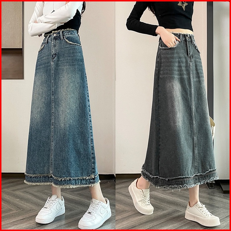 Rok Span Jumbo Highwaist Wanita Korean Style Rok Lepis Denim Pinggang Tinggi Wanita Rok Jeans Cargo Gaun Mid-length Retr