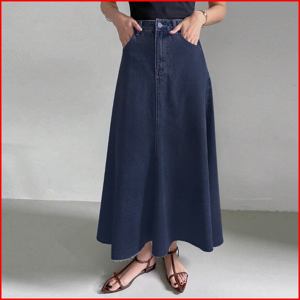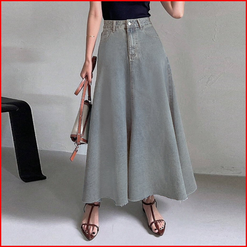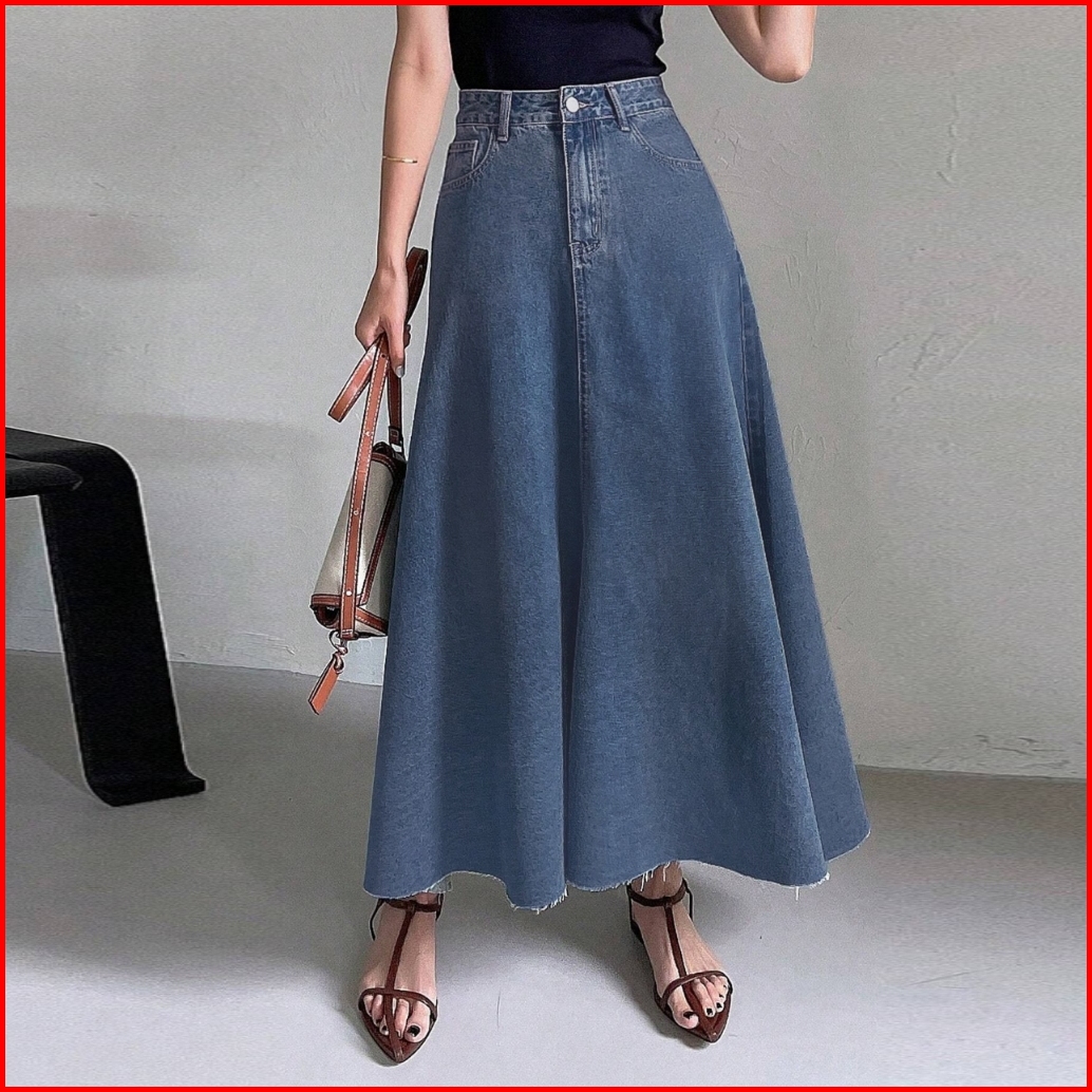 Rok Jeans Wanita Fashion Elegan Korean Style A-line Denim Maxi Skirt