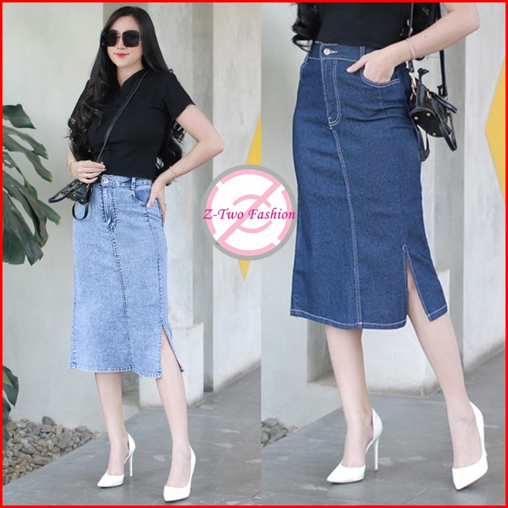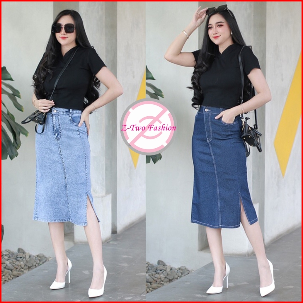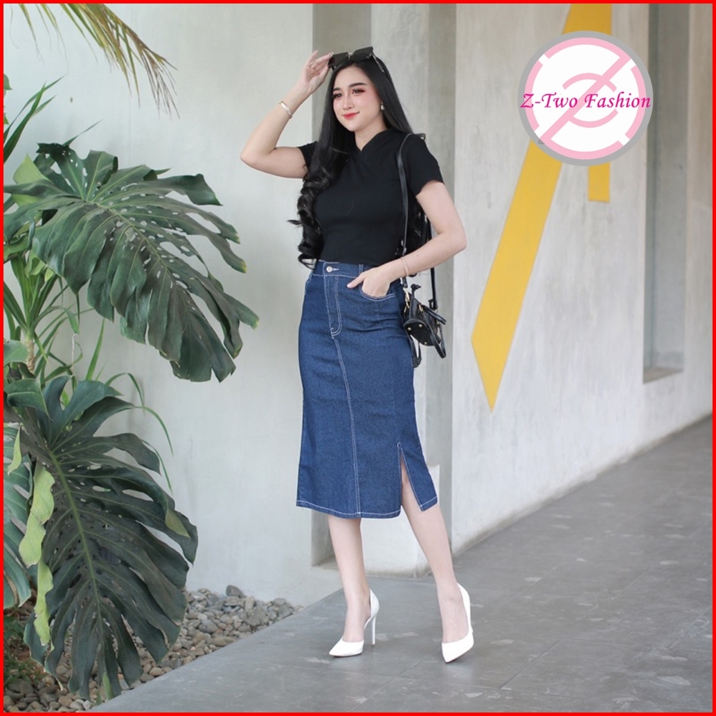 Z-two - Nycta Jeans Skirt Rok Jeans Stretch Pendek Belah Samping Pinggang Karet Jumbo Big Size