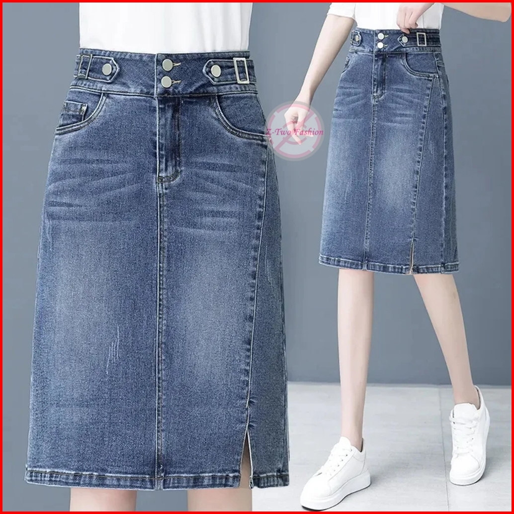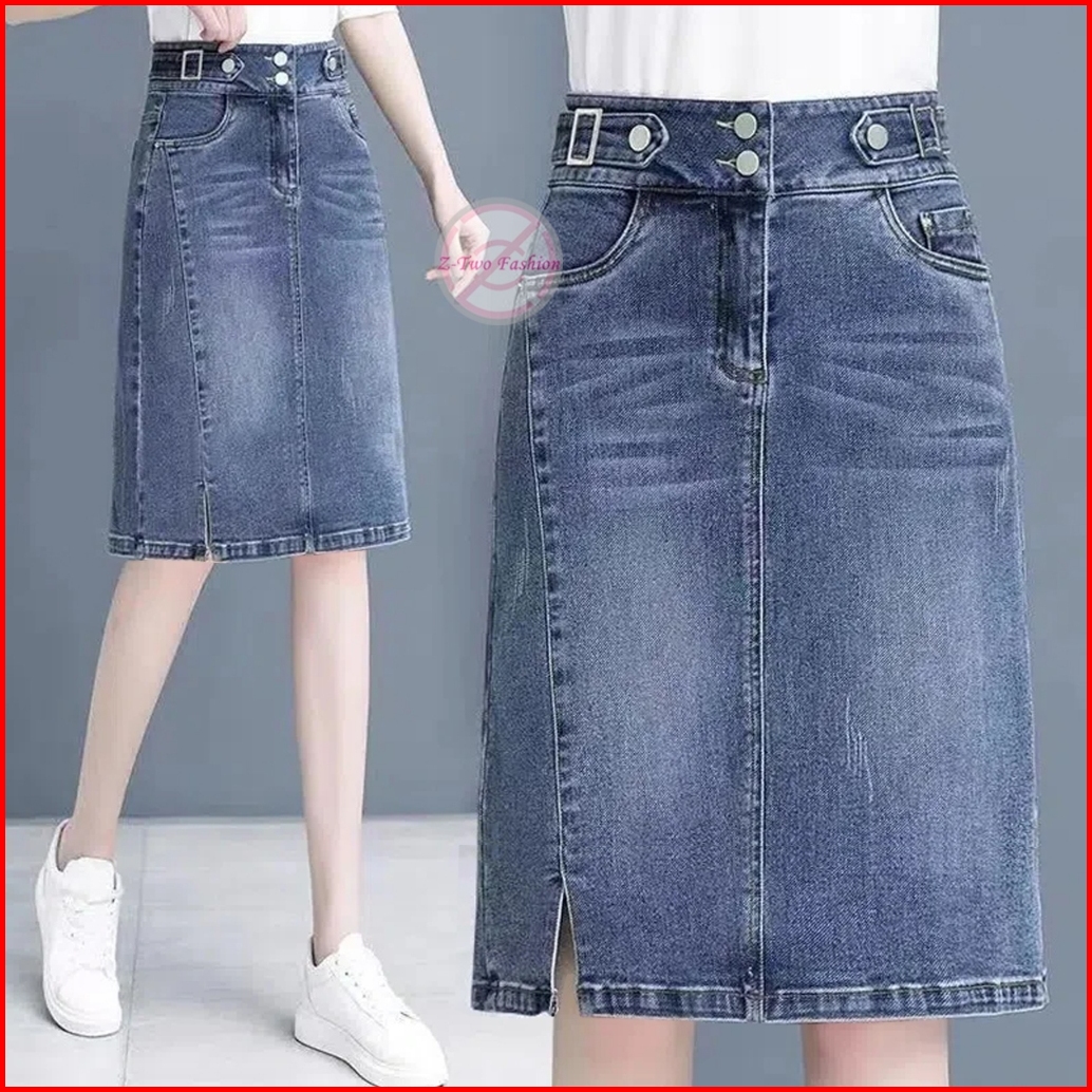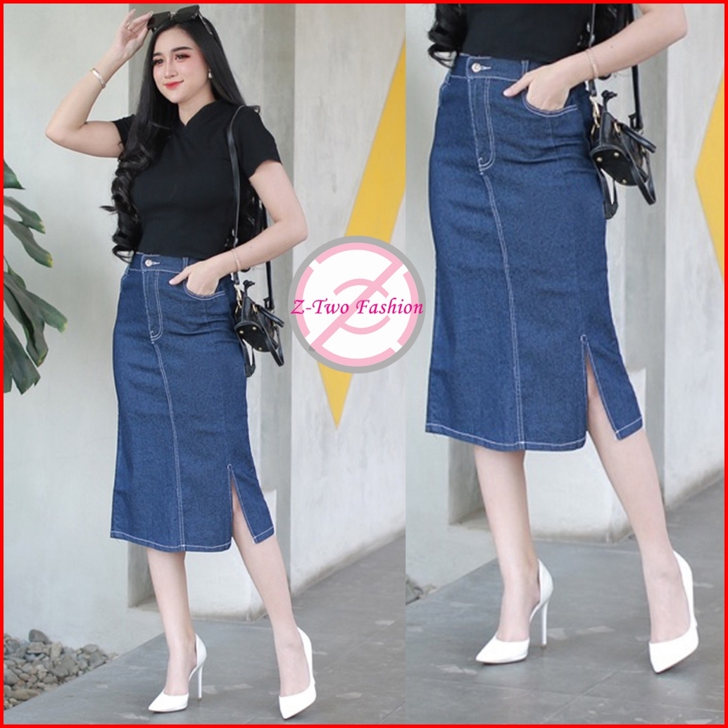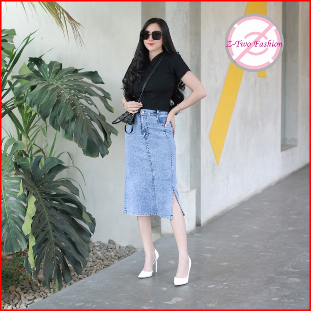 Z-two - Nycta Jeans Skirt Rok Jeans Stretch Pendek Belah Samping Pinggang Karet Jumbo Big Size