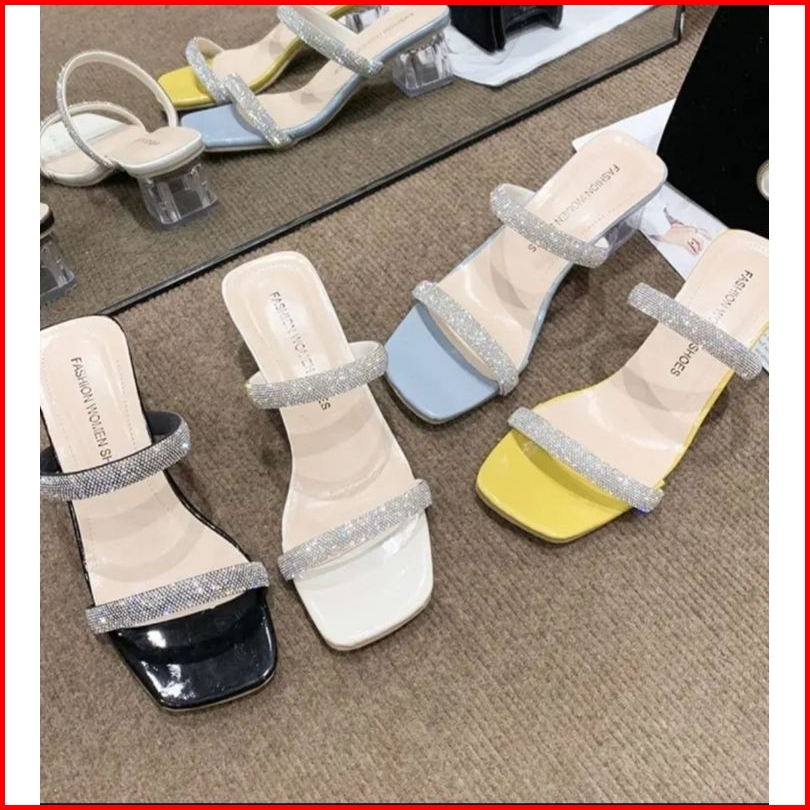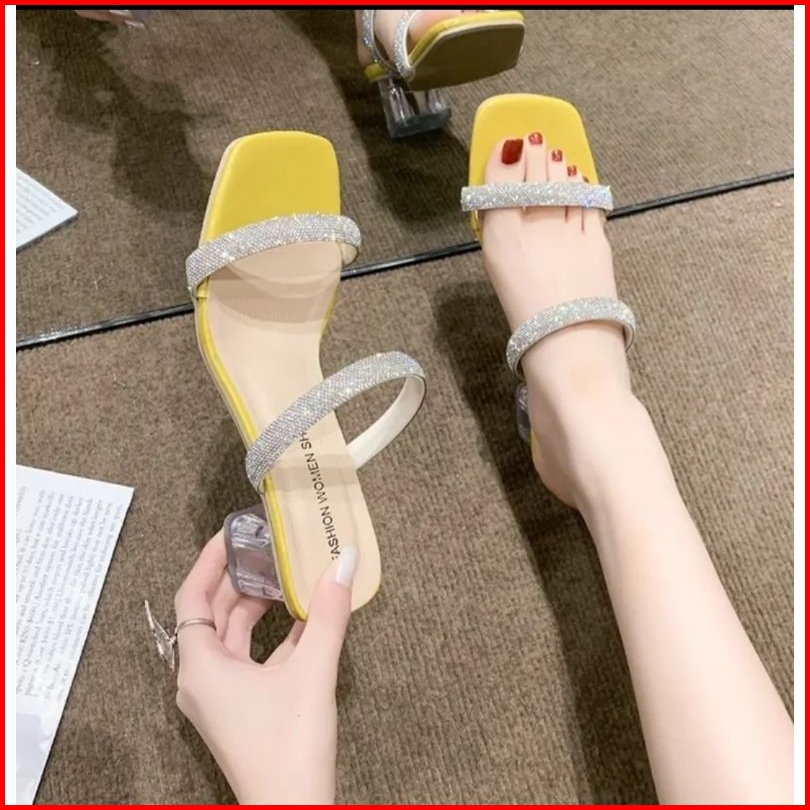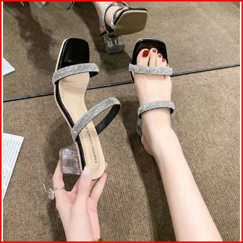 Sendal Sisi Ban Dua Wanita Hak Kaca 5cm Berlian Kekinian Sendal Pesta Sendal Kondangan Formal