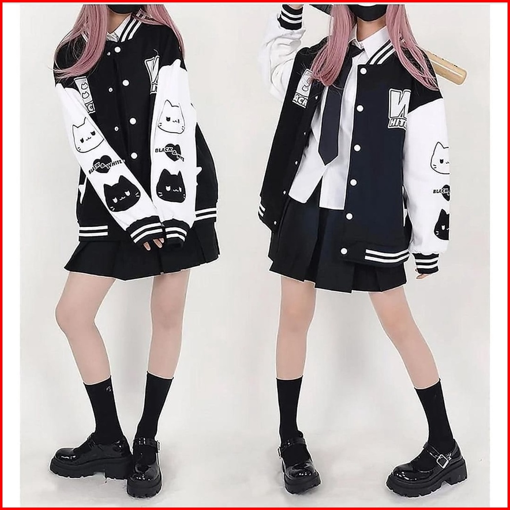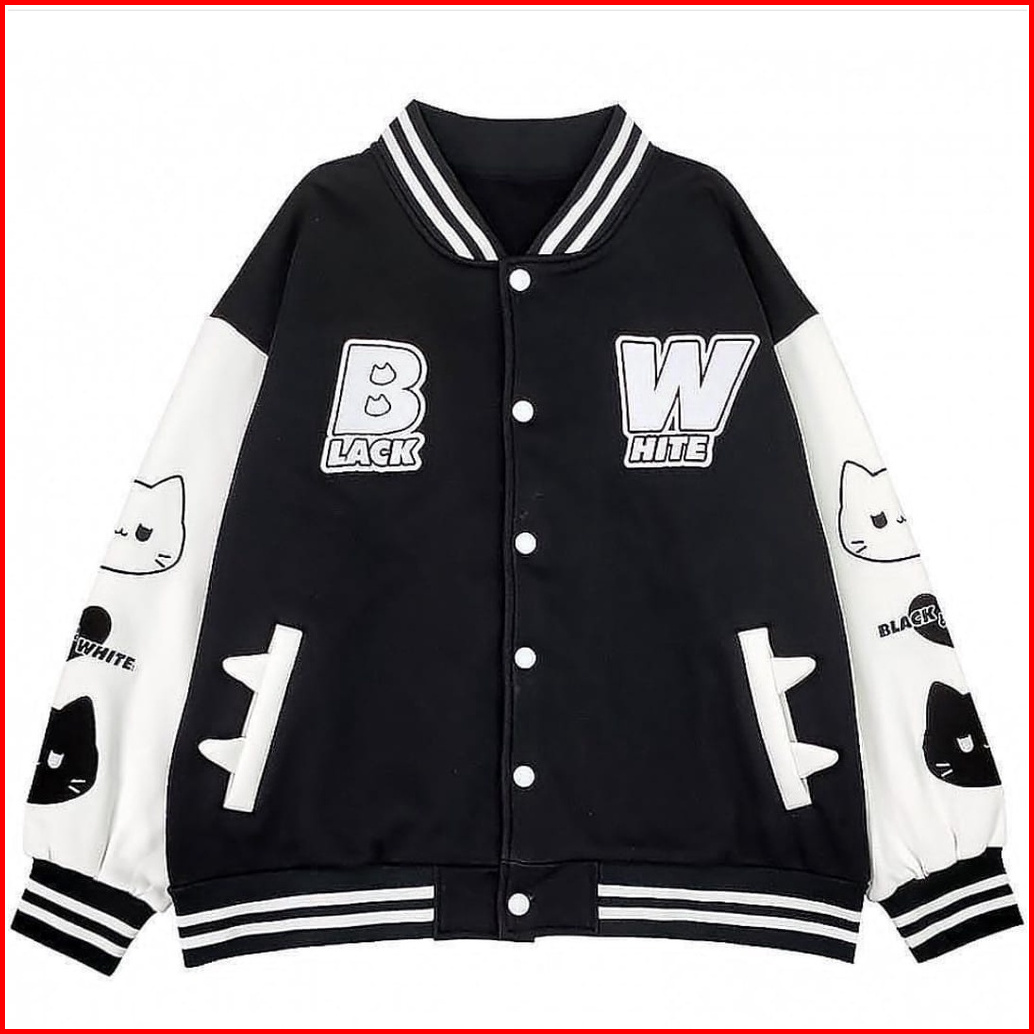 Tf - Black White Cat Jacket Varsity Baseball Wanita Korean High School Style Bw Reguler Size