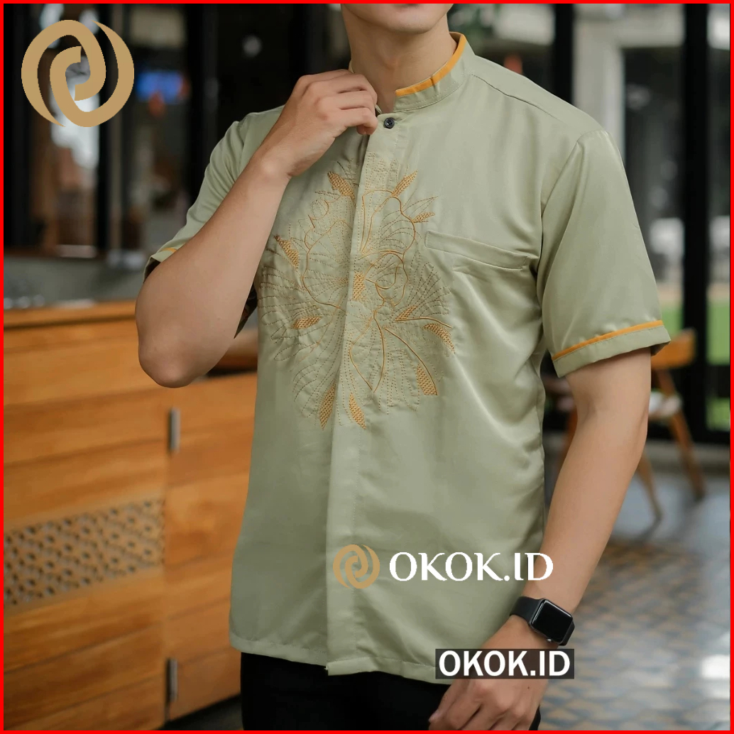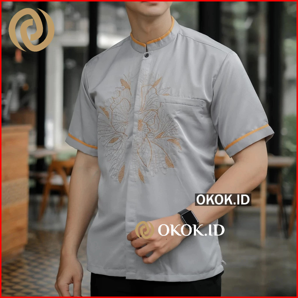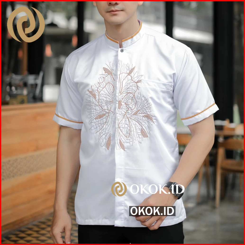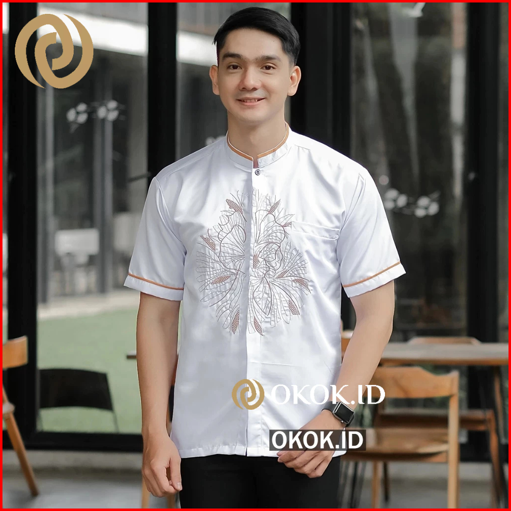 Okok.id Baju Koko Pria Muslim Koko Bordir Lengan Pendek Kerah Mandarin Ukuan M L Xl Xxl