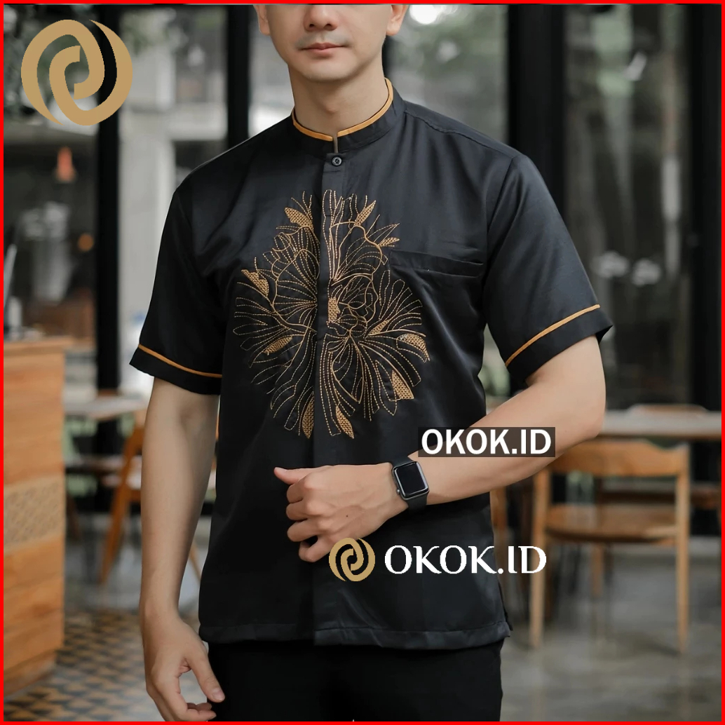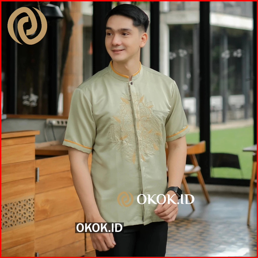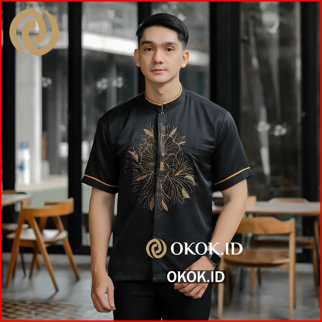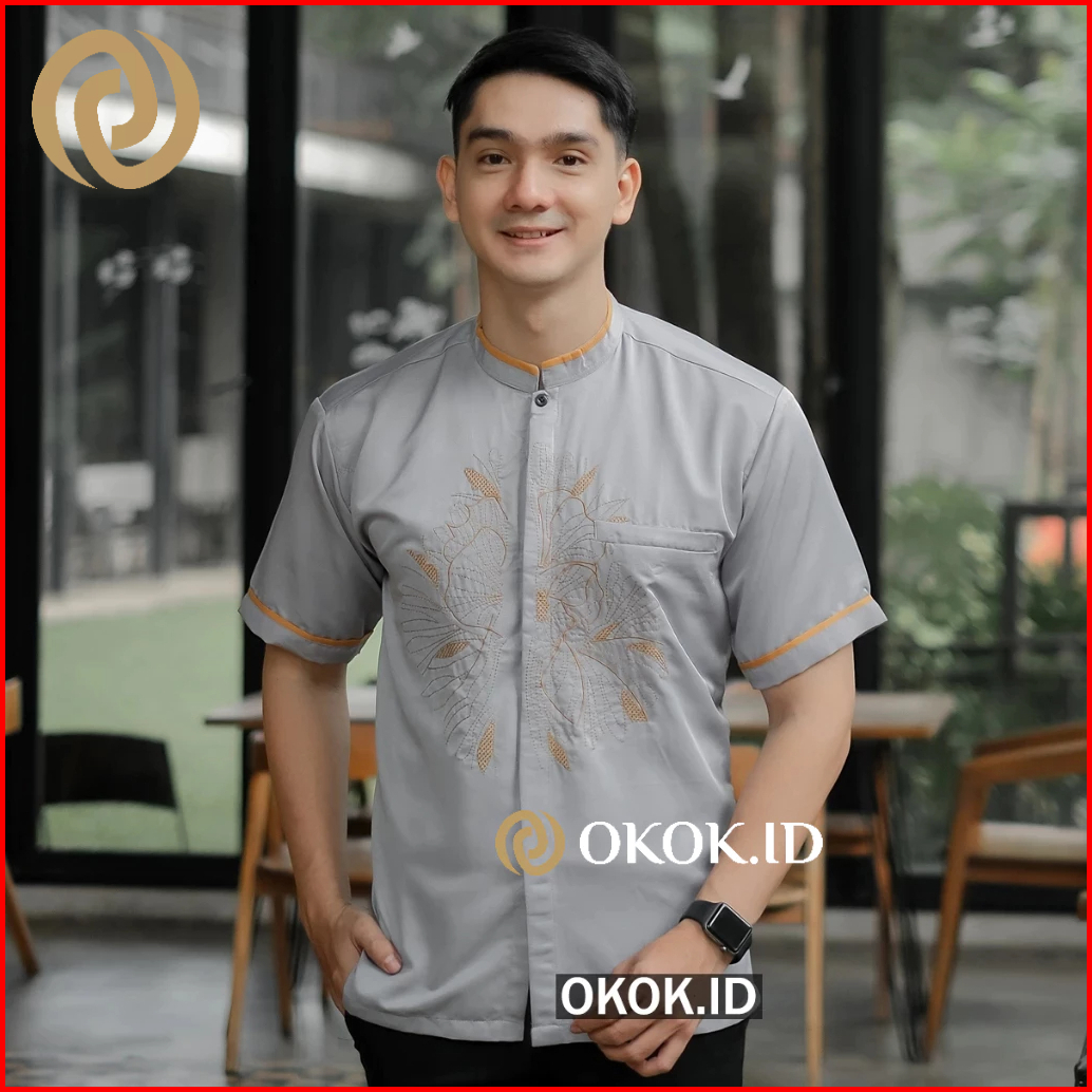 Okok.id Baju Koko Pria Muslim Koko Bordir Lengan Pendek Kerah Mandarin Ukuan M L Xl Xxl
