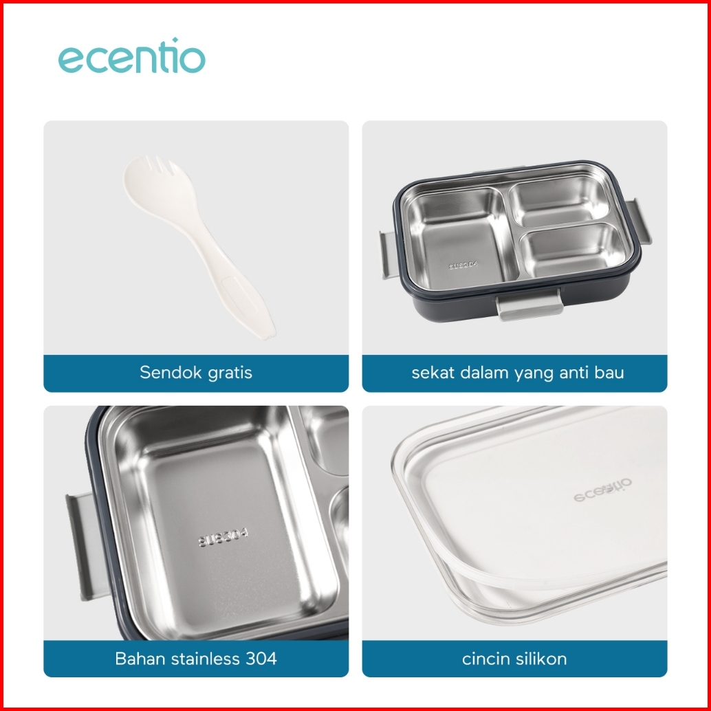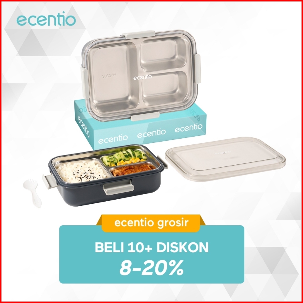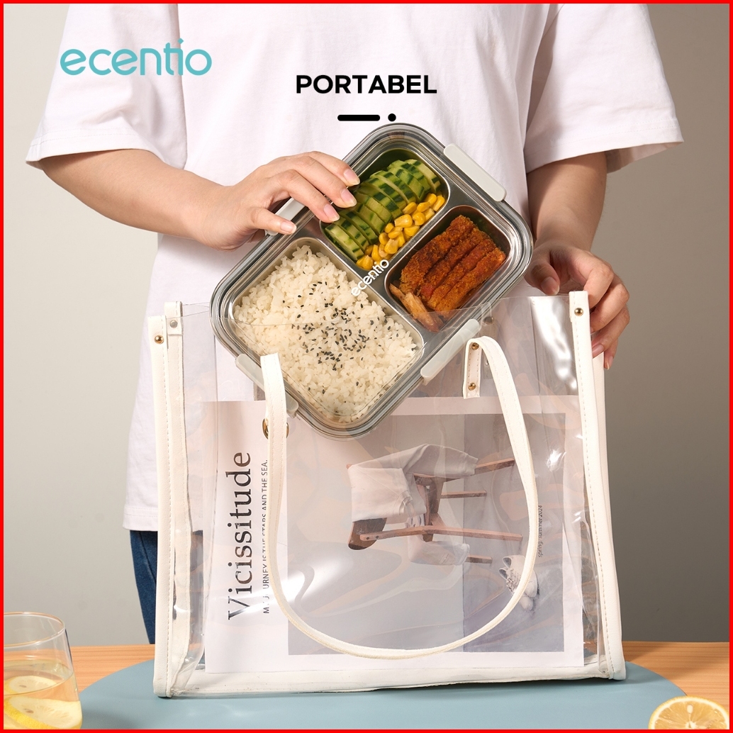 Grosir Ecentio 850ml Tempat Makan Stainless Kotak Makan 3 Grid Lunch Box Anti Tumpah Microwave Dipanaskan With 2-in-1 Fo