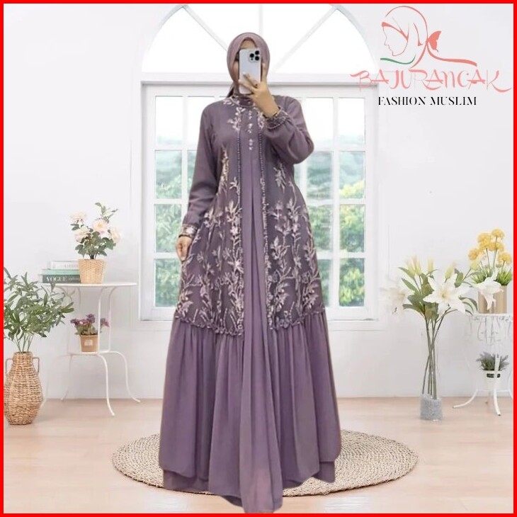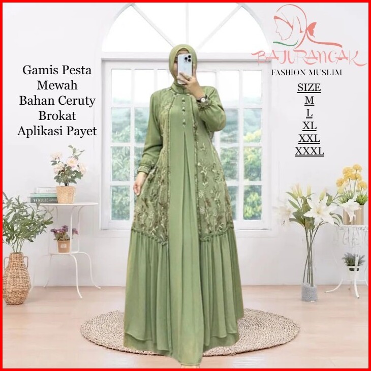 Baju Gamis Raya 2025 Dress Brokat Ceruti Fashion Muslim Pesta Mewah Wanita Aplikasi Payet Brukat
