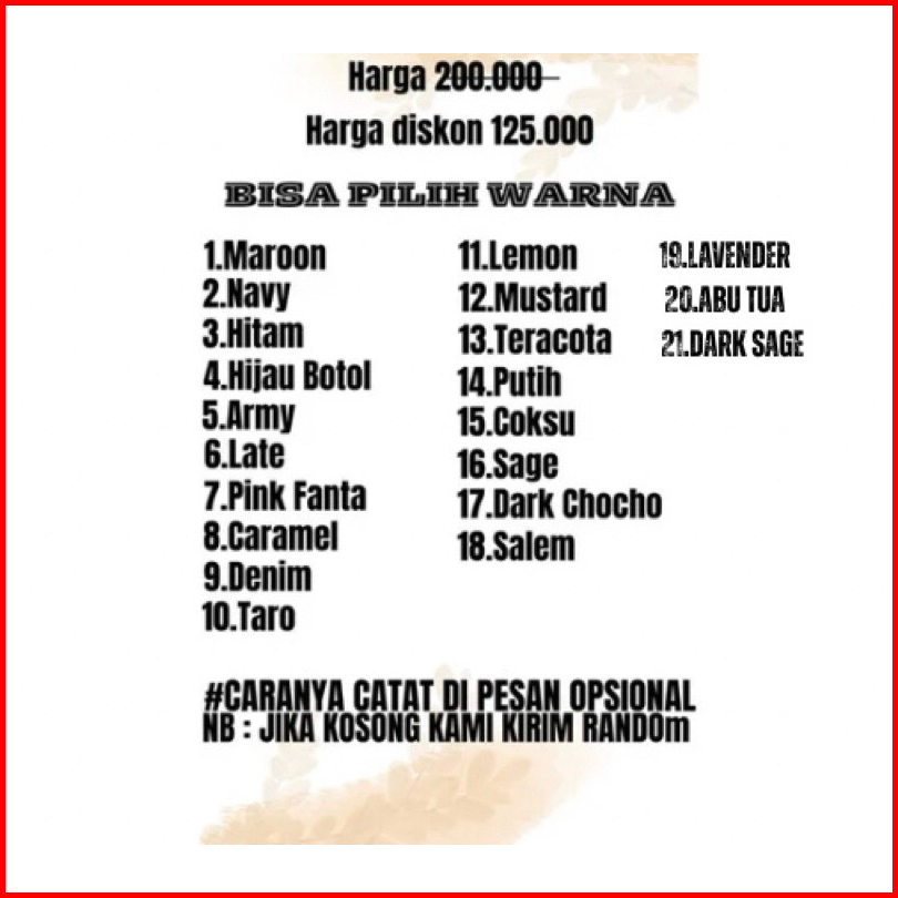 3 pcs pilhan warna, 3 pcs pilihan Random, 2 Pcs pilihan Warna, 2 pcs pilihan Random, 1 pcs pilihan warna, 1 pcs pilihanRandom, Teracota+Grey+Dusty, Peach+Lumut+Birel, Putih+Mustard+Army, Wardah+Cream+Sage, Hitam+Emerlad+Denim, Violet+Choco+Dusty, Grey+Navy+Mustard, Late+Sage+Lavender, Lemon-Teracota-Coksu, Army-Maroon-Lavender, Maroon-Teracota-Coks, Army-Maroon-Hitam, Dusty-Teracota-Coksu, Army-Maroon-Denim, Denim-Teracota-Coksu, Army-Hitam-Denim, Jotol-Teracota-Coksu, Sage-Hitam-Denim, Jotol-Maroon-Coksu, Hitam-Maroon-Coksu, Sage-Maroon-Dusty, Hitam-Maroon-Lemon, Denim-Maroon-Dusty, Hitam-Coksu-Lemon, Denim-Teracota-Dusty, Hitam-Teracota-Lemon, Denim-Sage-Dusty, Hitam-Dusty-Lemon, Denim-Hitam-Dusty, Denim-Army-Dusty, Hitam-Birel-Lemon, Hitam-Jotol-Dusty, Hitam-Sage-Lemon, Hitam-Army-Lemon, Hitam-Jotol-Lemon, Army-Maroon-Lemon, Lemon-Navy-Teracota, Navy-Maroon-Lemon, Coksu-Navy-Teracota, Navy-Army-Lemon, Hitam-Navy-Teracota, Hitam-Navy-Lemon, Hitam-Navy-Army