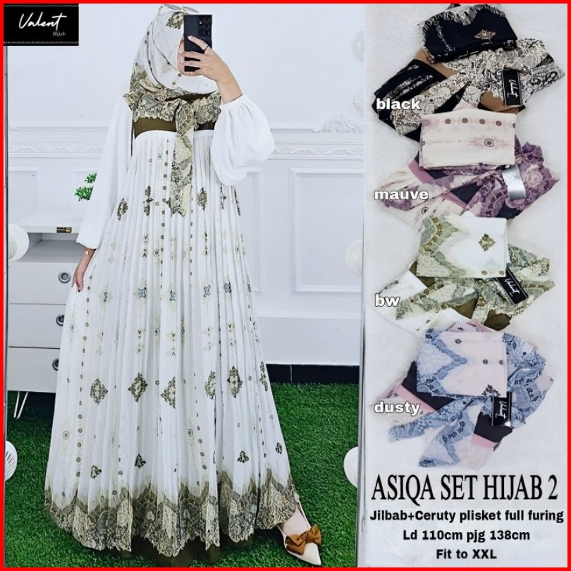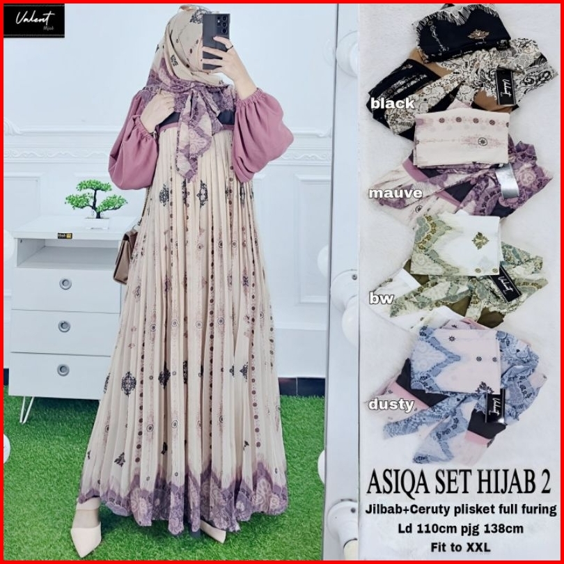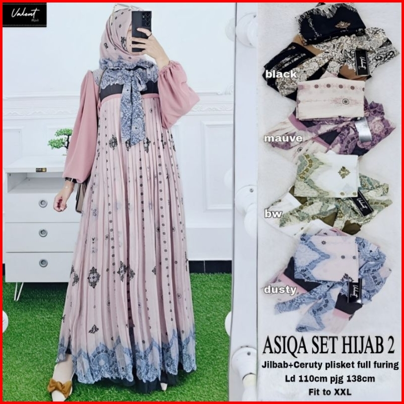 Asiqa Set Hijab 2 Busui Resleting Depan Ld 110cm Gamis Plisket Motif Mewah Bahan Ceruty Plisket Full Furing By Valent