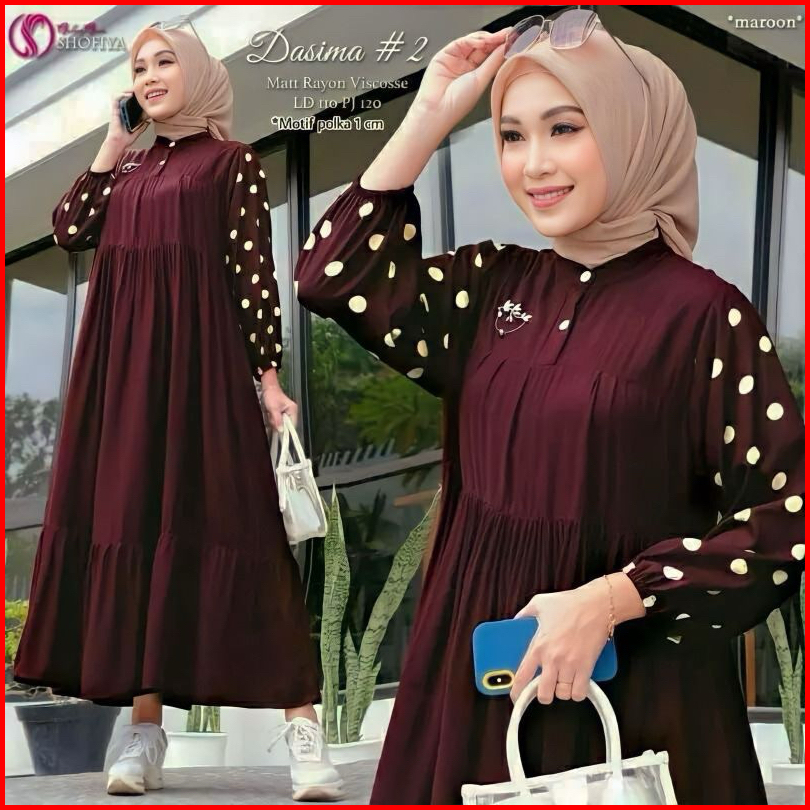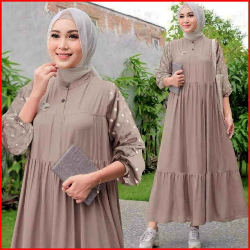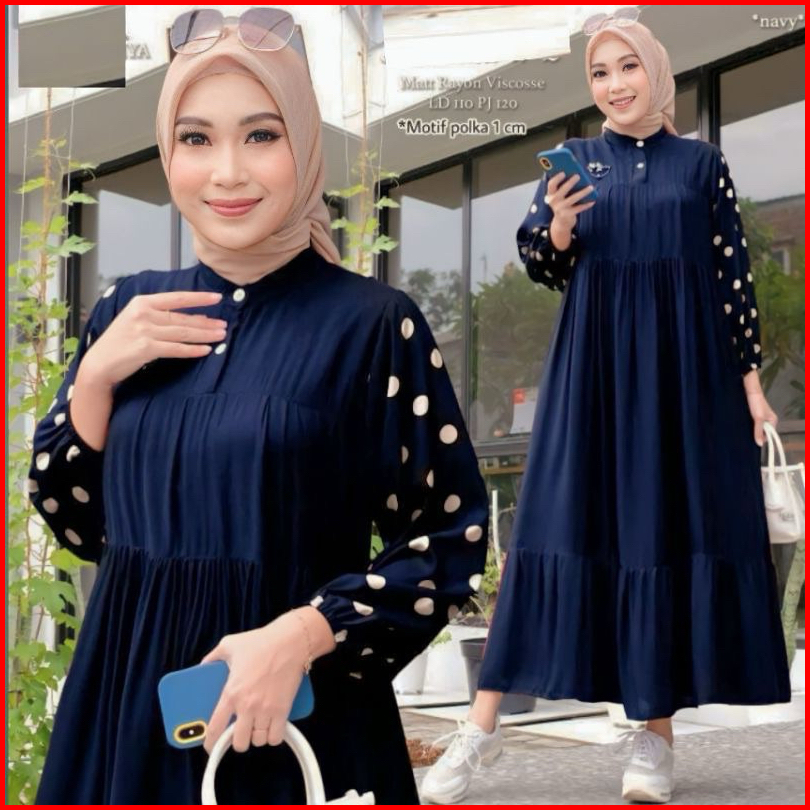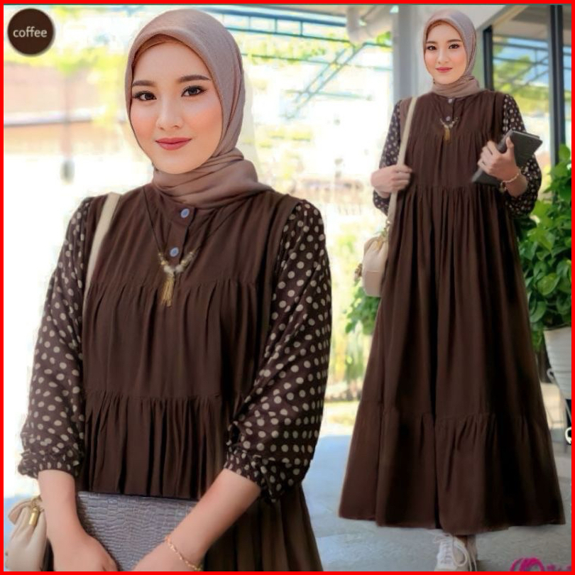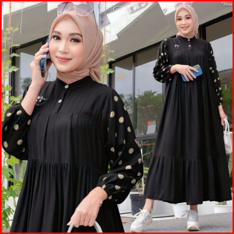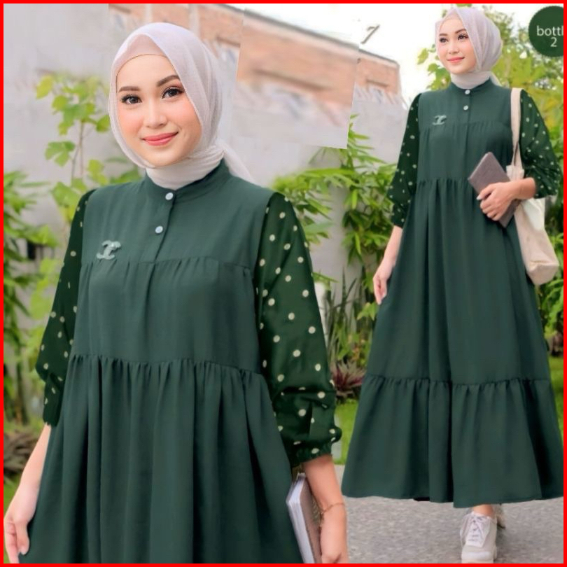 Gamis Polos Terbaru 2024 Wanita Muslimah Kombinasi Polkadot Kancing Depan Midi Dres Rayon Premium