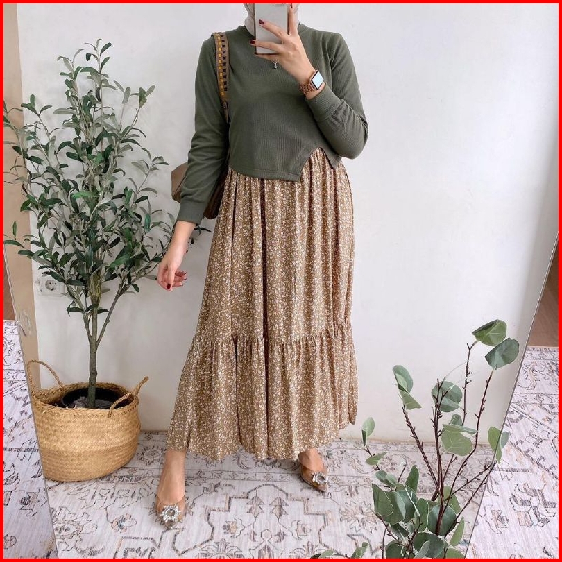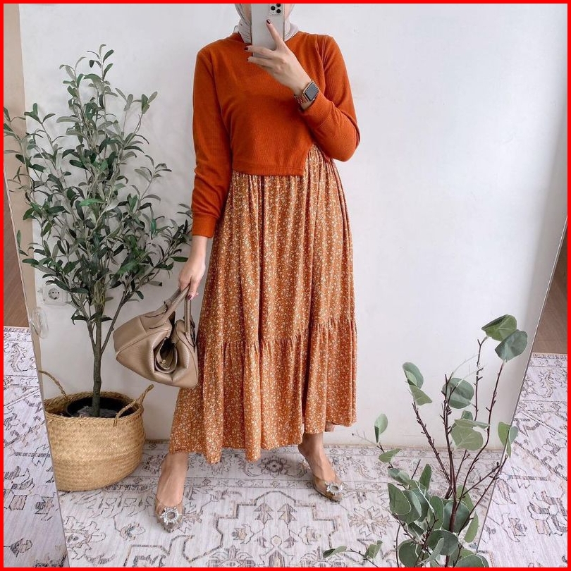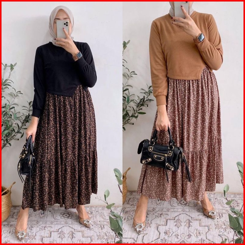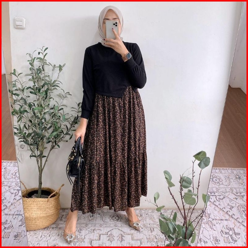 Ellone Fashion - Yunita Dress Premium Knit Setelan Kombinasi Motif Bunga Kekinian