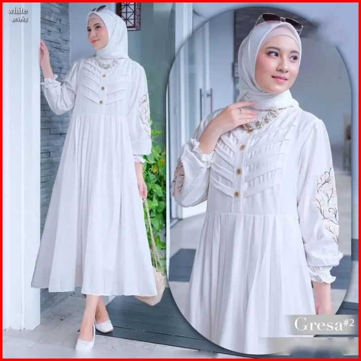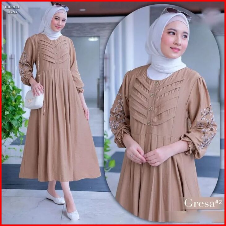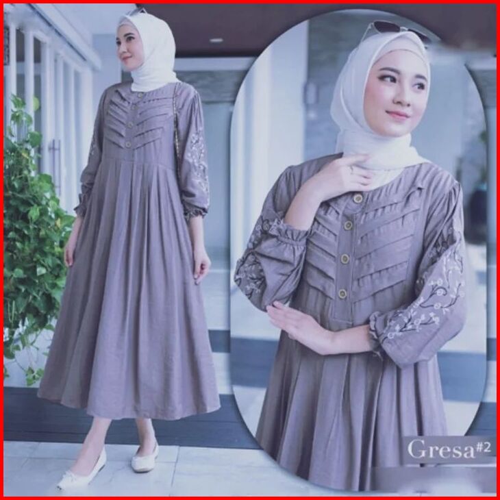 Gresa Midi Dress Muslim Bahan Linen Crespo Dress Kondangan Baju Gamis Lebaran 2024 Gamis Terbaru Elf