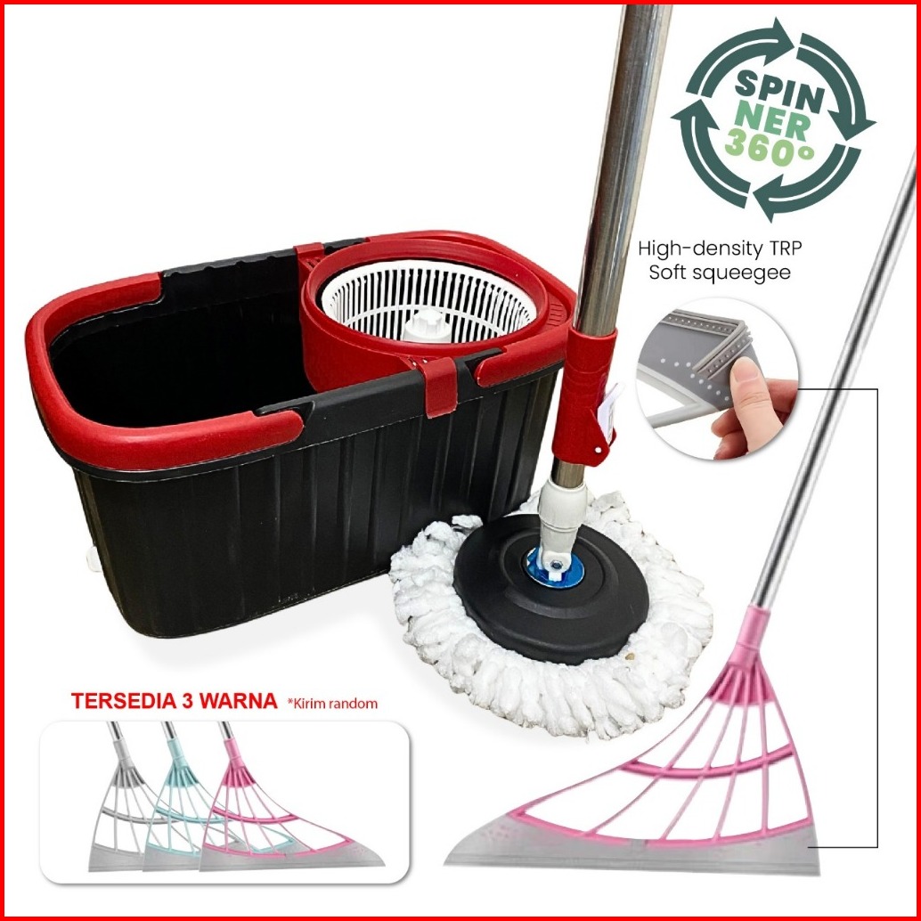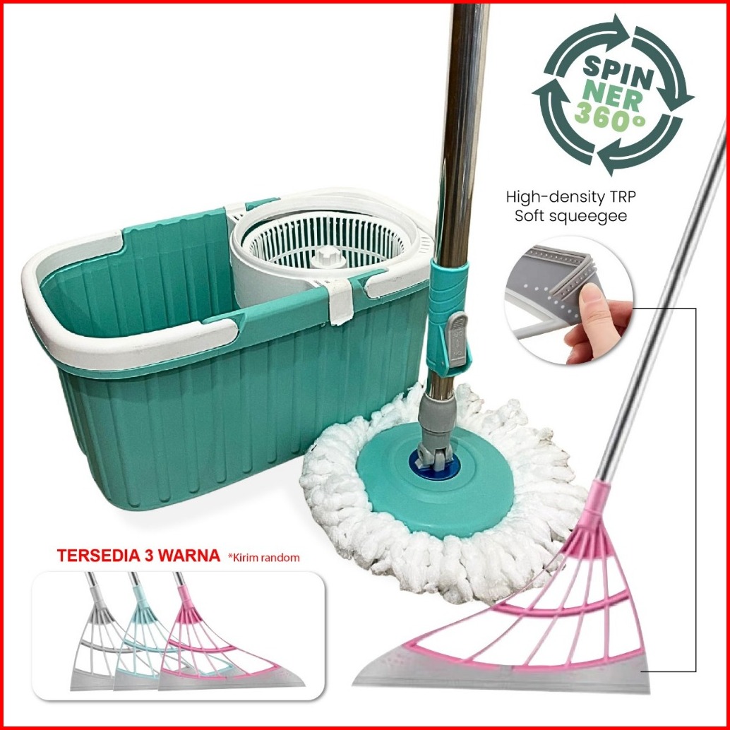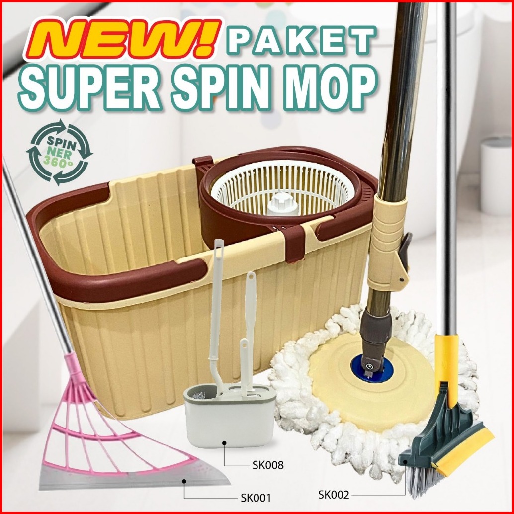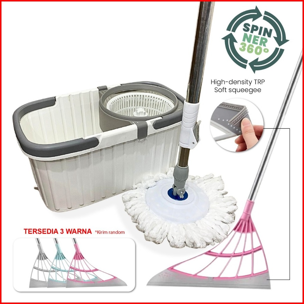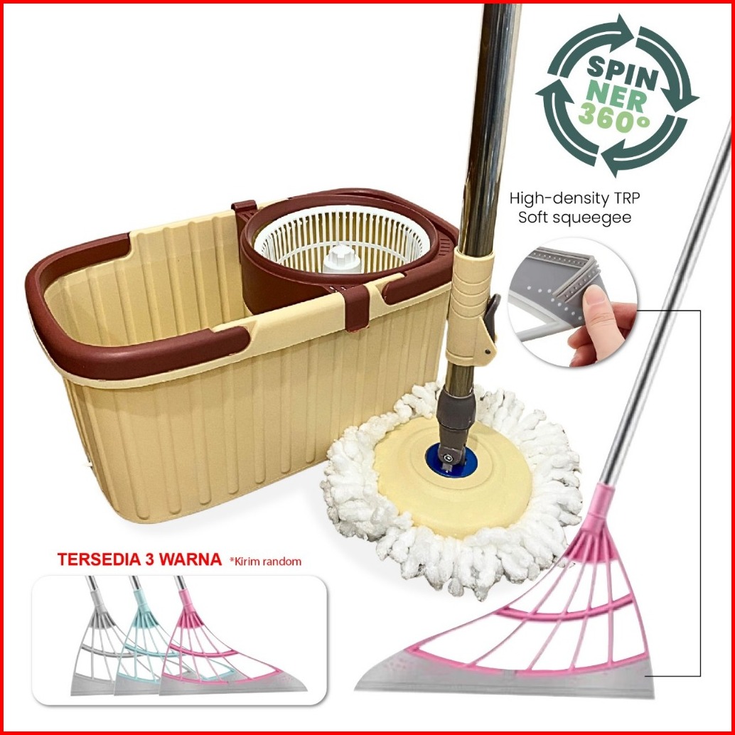 1 Set Paket Alat Pel Spin Mop Dan Sikat 2in1 Kamar Mandi Mop Magic Spin Pel Lantai Dengan Ember Plastik