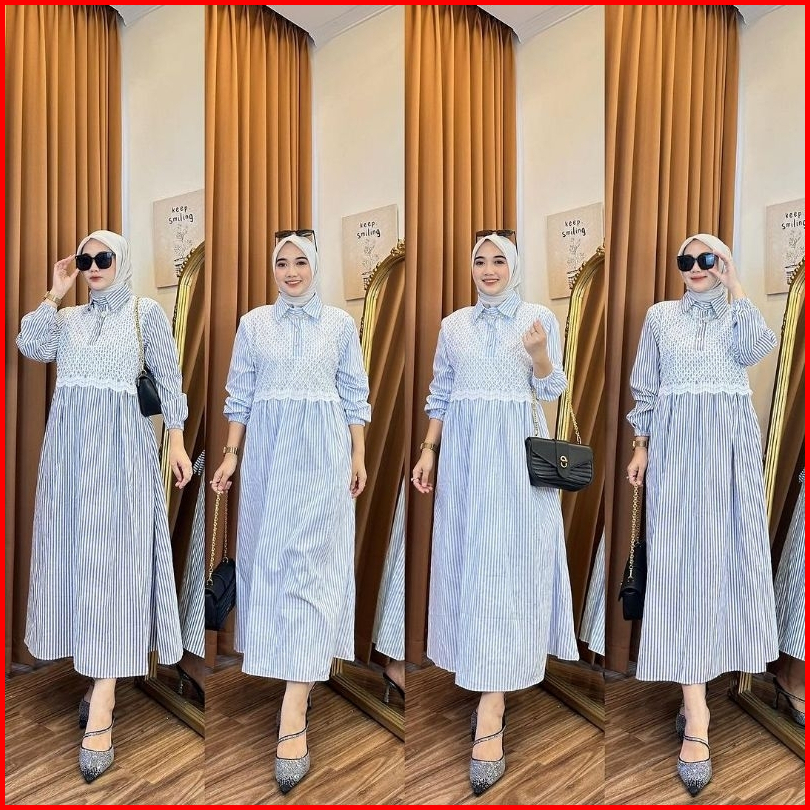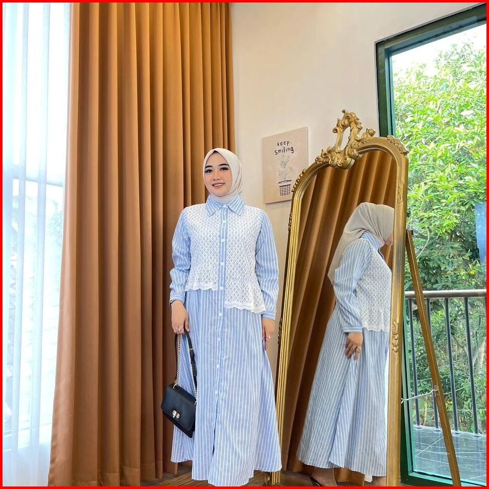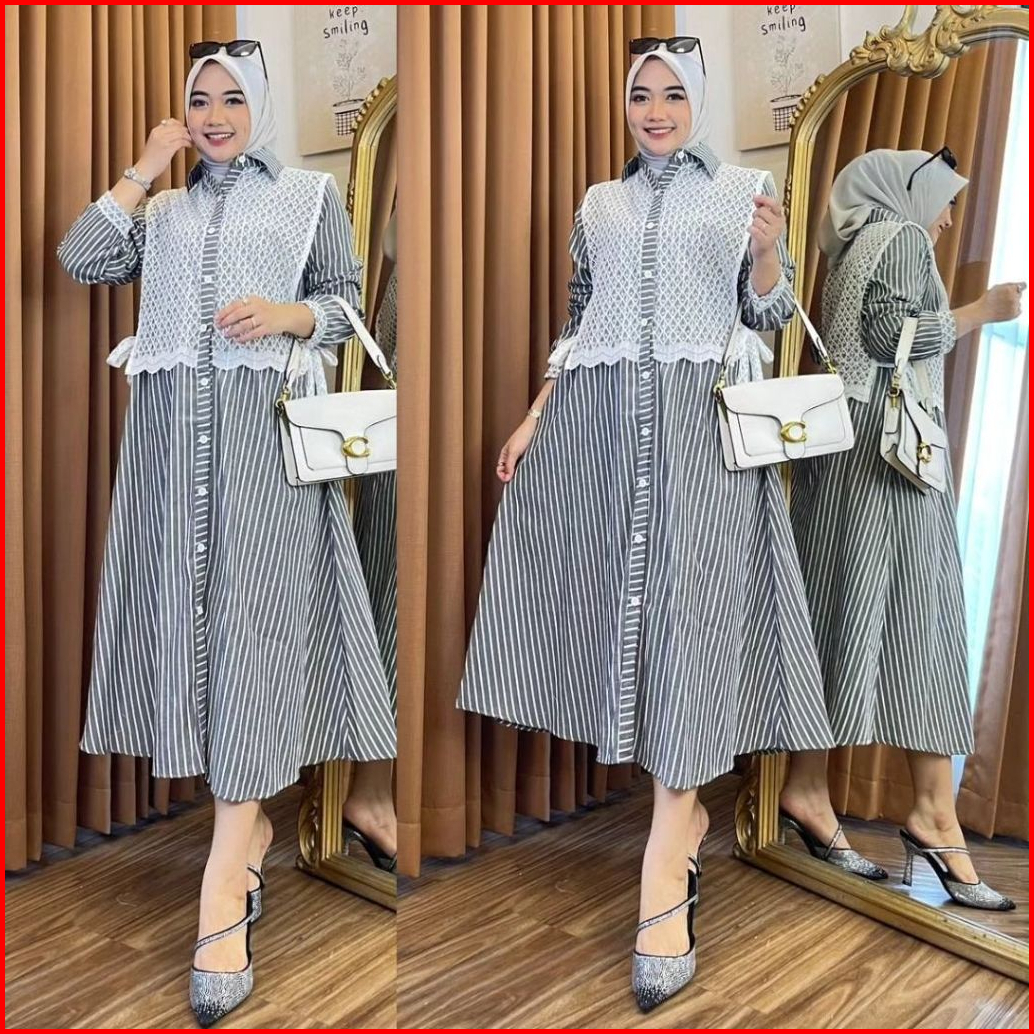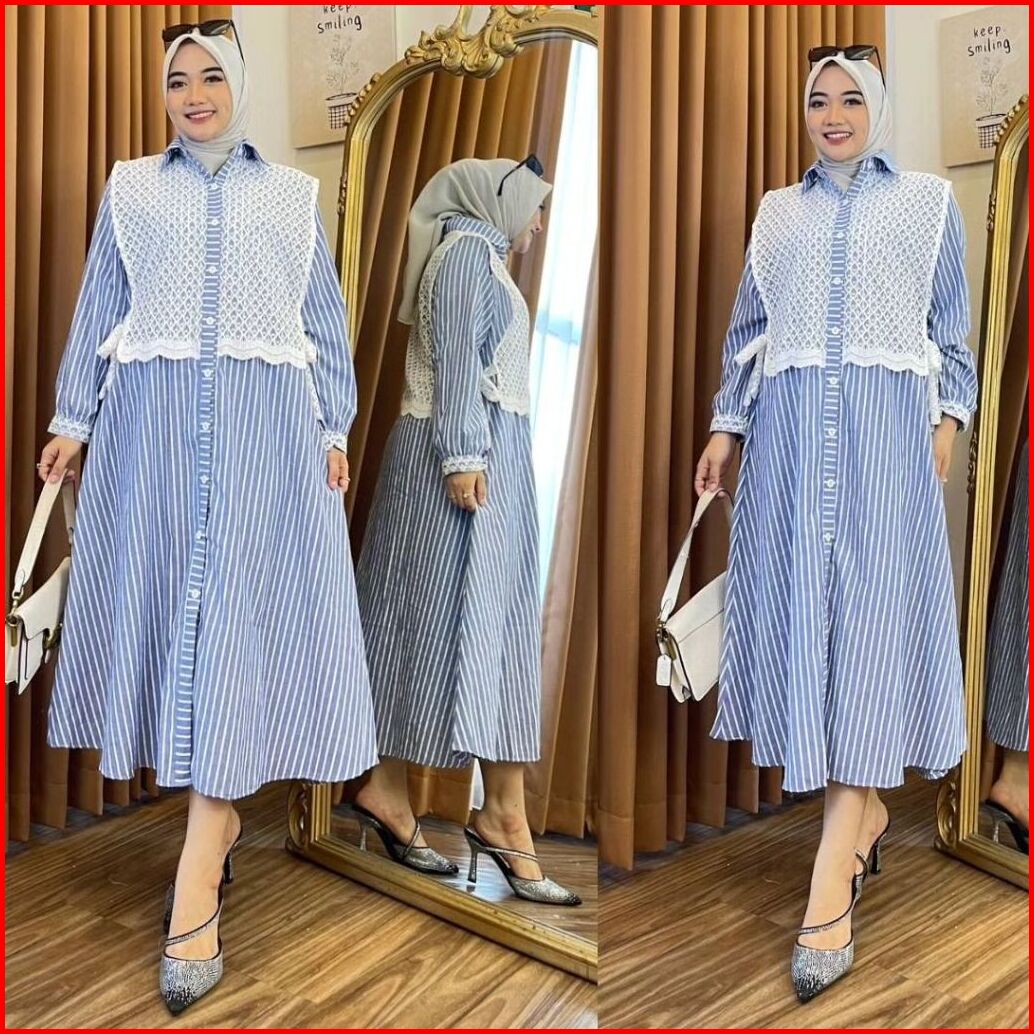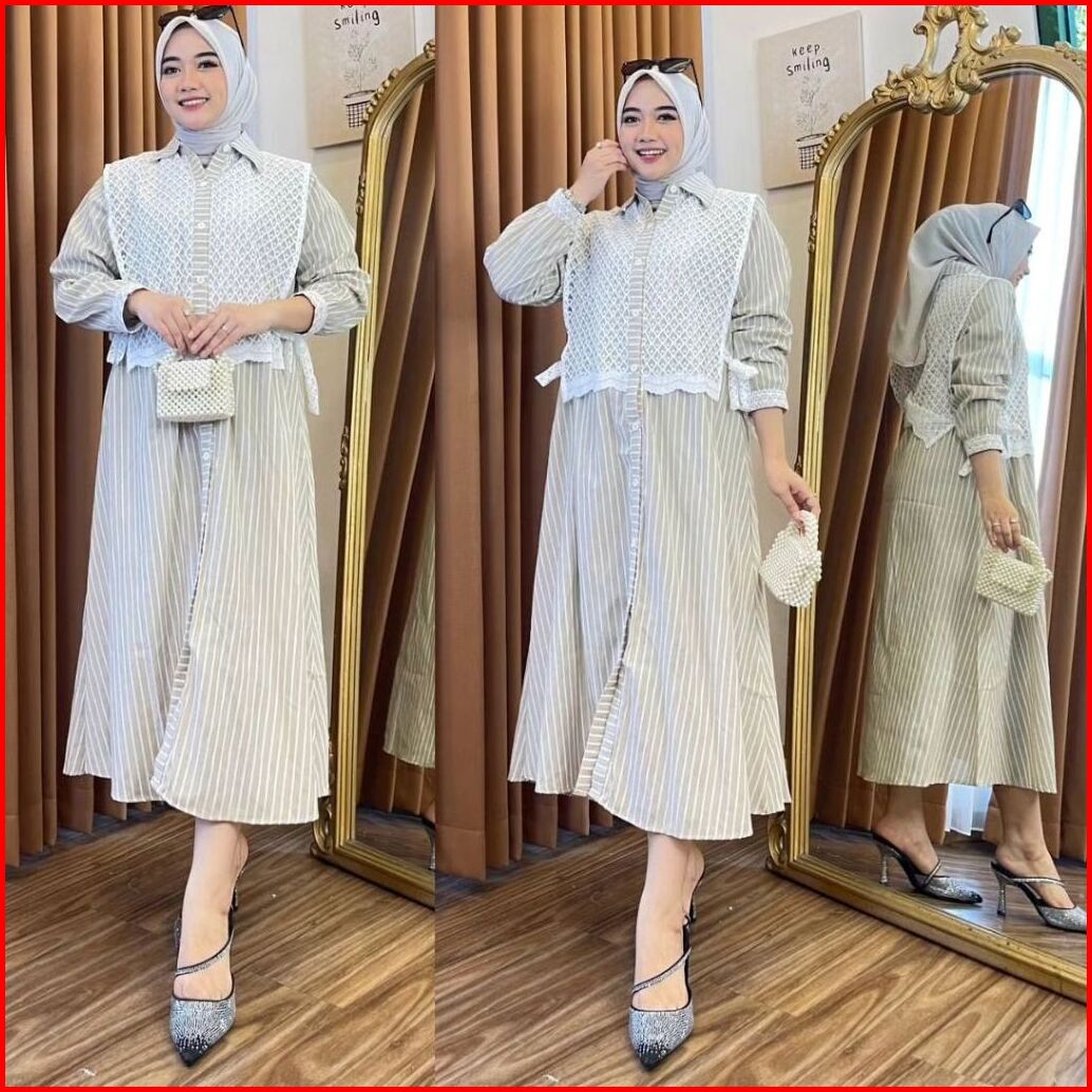 Renata Midi Dress Salur Mix Brukat Depan Belakang Gamis Salur Busui Friendly
