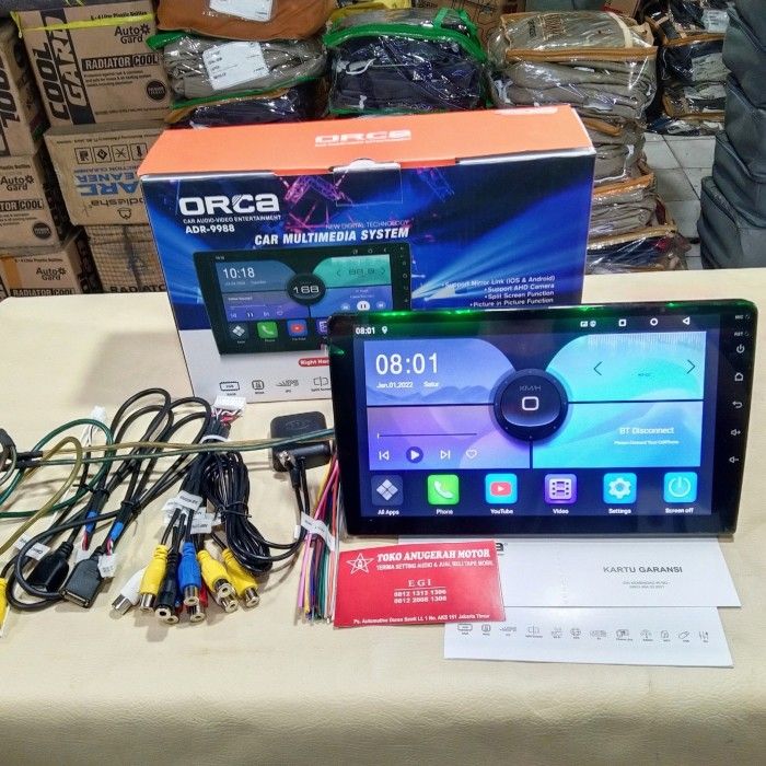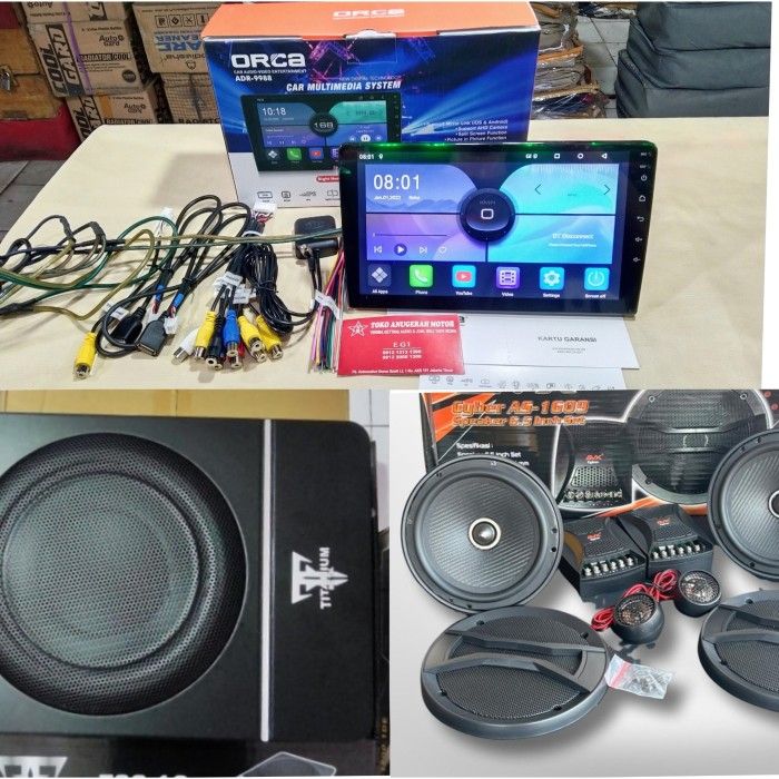 paket audio mobil . head unit android 9 inc + subwoofer kolong split