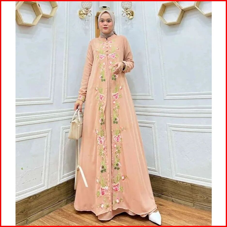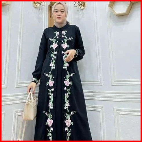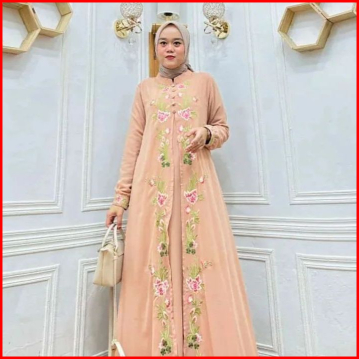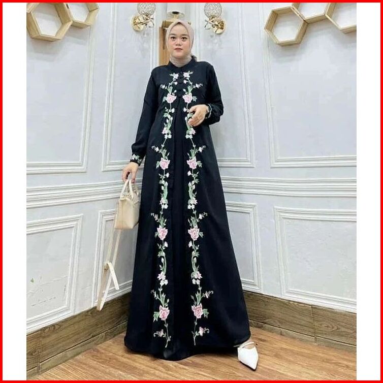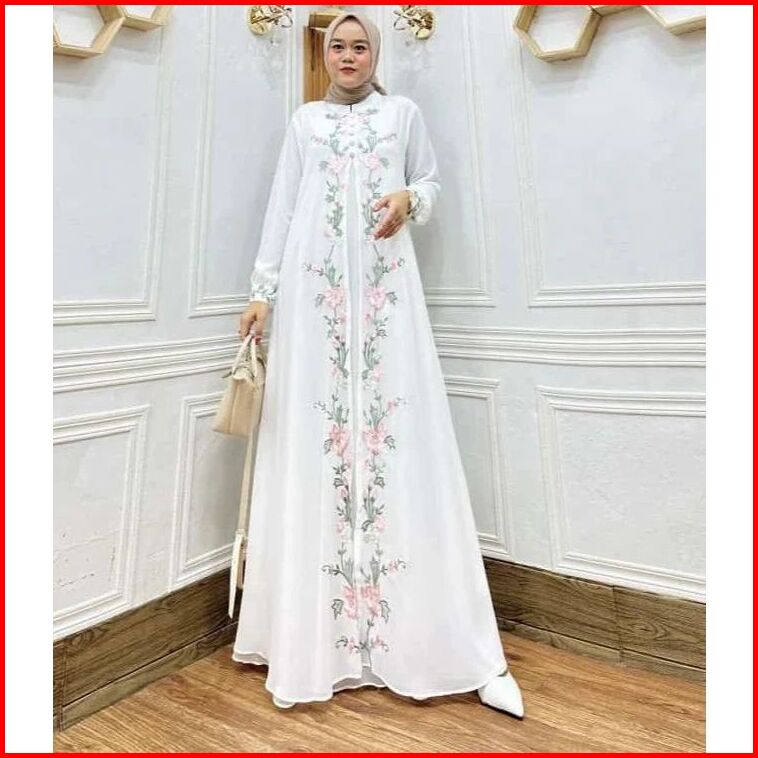 Bunga Dress Bordir Timbul Bahan Ceruty Babydoll Full Puring Layer Depan Gamis Wanita Terbaru Mewah