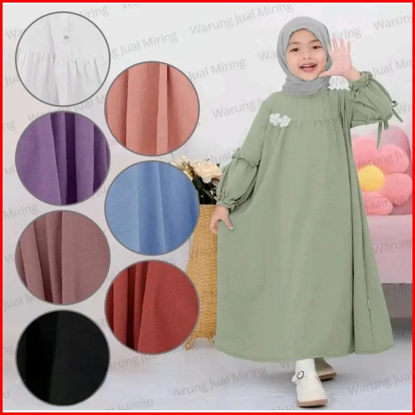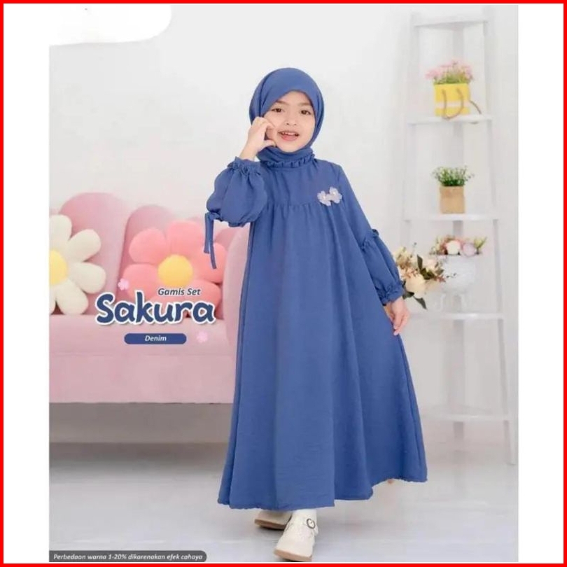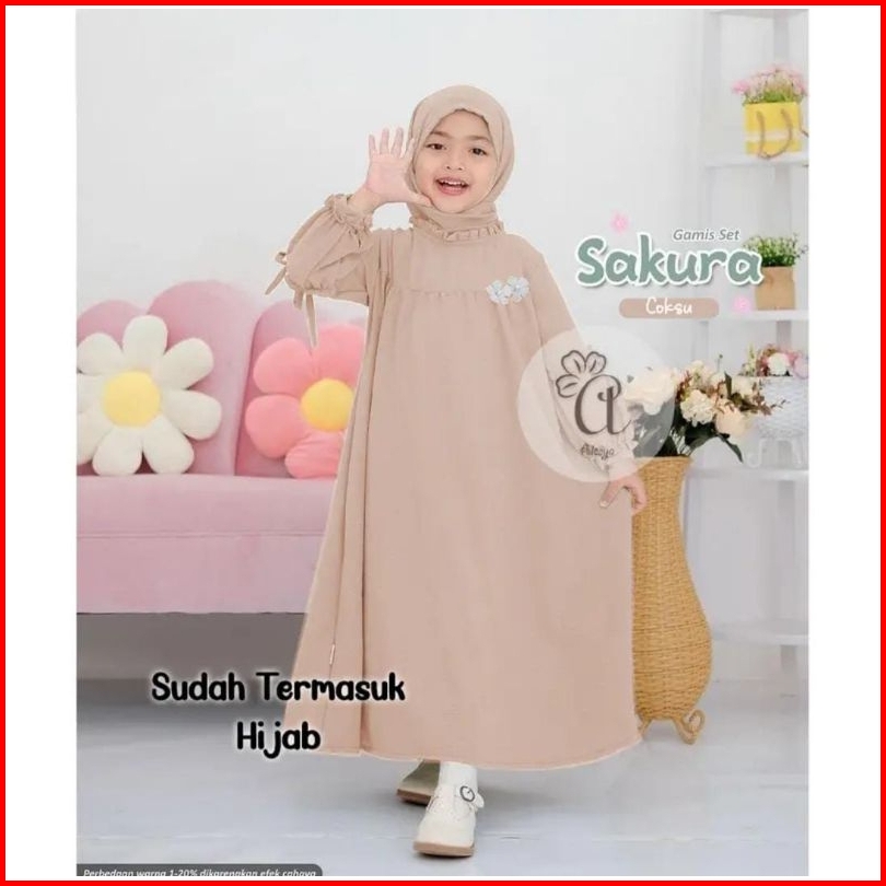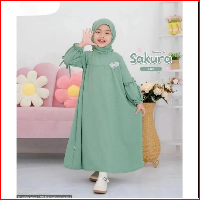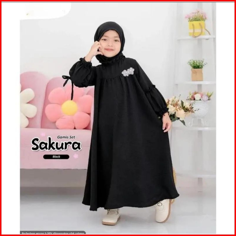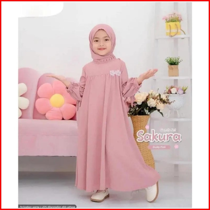 Gamis Set Anak Perempuan 2-12 Tahun Hijab Pashmina Bahn Crinkle Airflow Baju Dress Gamis Sakura