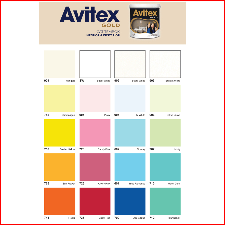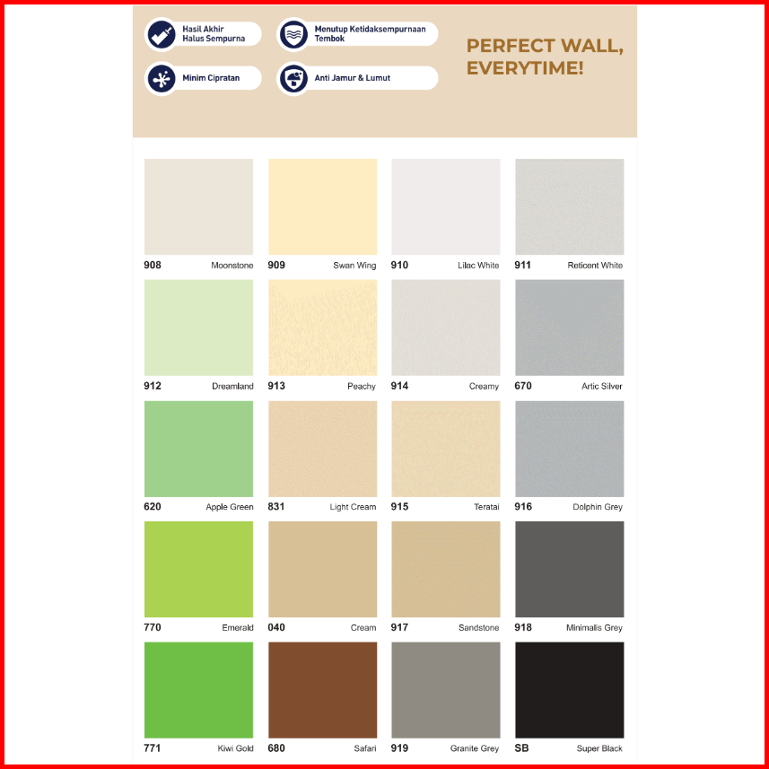 901 MARIGOLD, SW SUPER WHITE, 902 SUPRA WHITE, 752 CHAMPAGNE, 905 M WHITE, 755 GOLDEN YELLOW, 602 SKYWAY, 765 SUN FLOWER, 601 BLUE ROMANCE, 745 FIESTA, 700 AZURE BLUE, 908 MOONSTONE, 910 LILAC WHITE, 912 DREAMLAND, 914 CREAMY, 620 APPLE GREEN, 915 TERATAI, 770 EMERALD, 917 SANDSTONE, 771 KIWI GOLD, 919 GRANITE GREY, PUTIH BASE B, PUTIH BASE A, SB SUPER BLACK, 680 SAFARI, 918 MINIMALIS GREY, 040 CREAM, 916 DOLPHIN GREY, 831 LIGHT CREAM, 670 ARTIC SILVER, 913 PEACHY, 911 RETICENT WHITE, 909 SWAN WING, 712 TELUR BEBEK, 735 BRIGHT RED, 710 MOON GLOW, 725 CHERY PINK, 907 MINTY, 720 CANDY PINK, 906 CITRUS GROVE, 904 PINGKY, 903 BRILLIANT WHITE, 736 RED CHILI, BGG 1759T SWEET ESCA, N8 003 LAIDBACK SUND, N12 004 QUIET VILLAG, N 1831P ALMOND CHIP