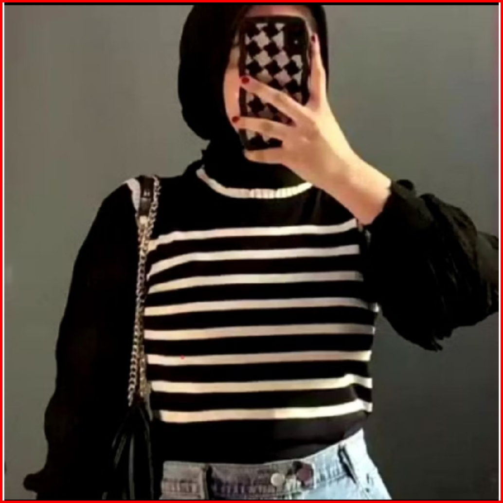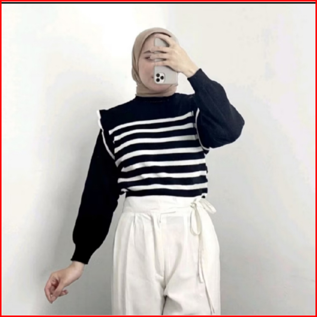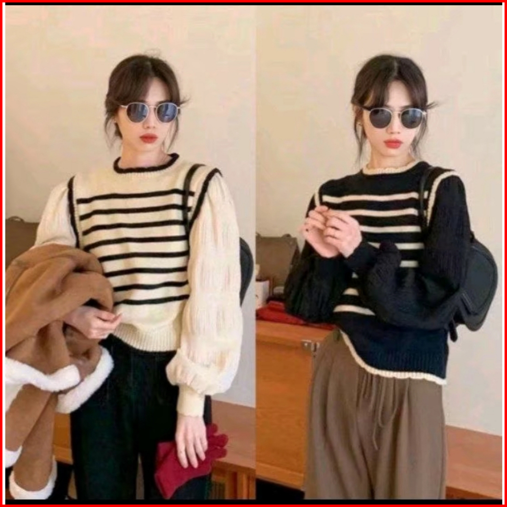 Atasan Knit Wanita Lengan Balon - Sweater Rajut Korean Style Motif Garis