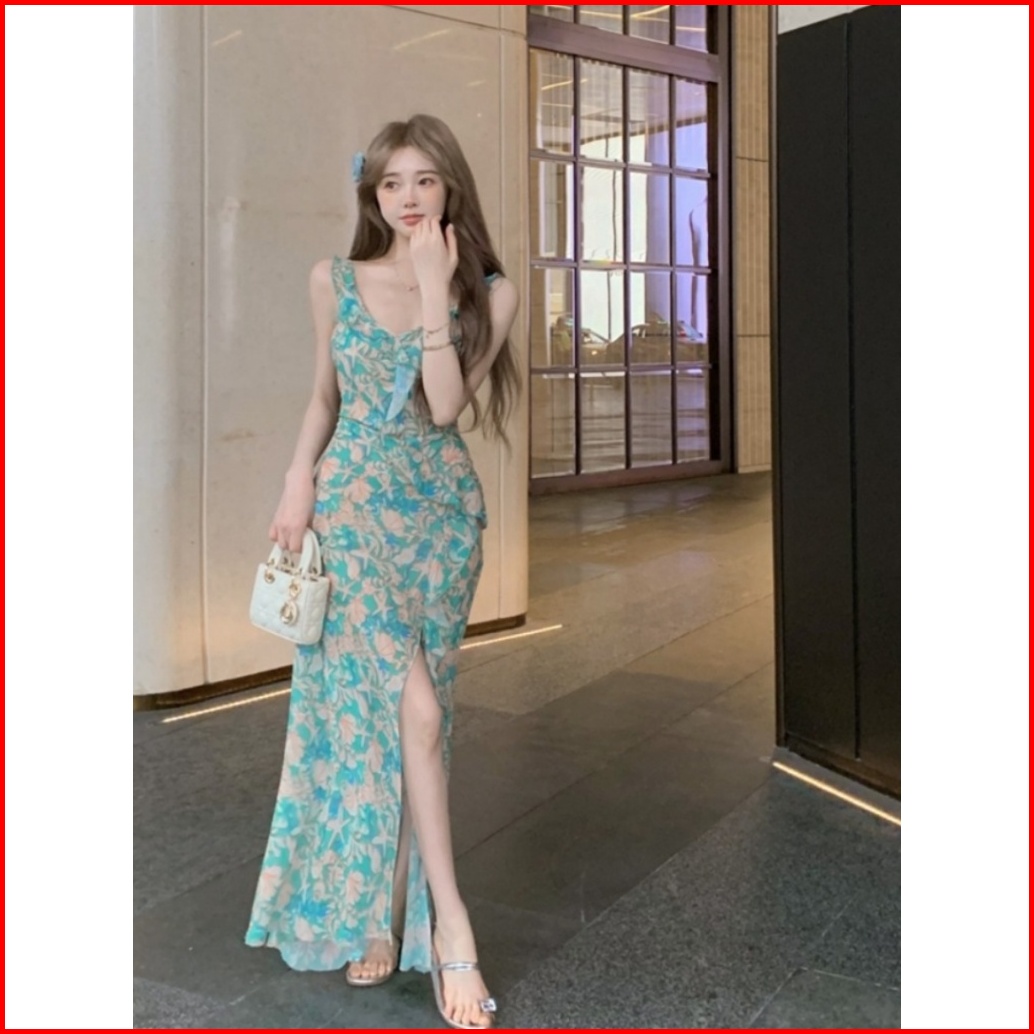 Emita Bloom Flowy Long Dress Motif Bunga Pantai Korean Style Dress Wanita Kekinian Hijau Sage Dress Press Body Terbaru 2