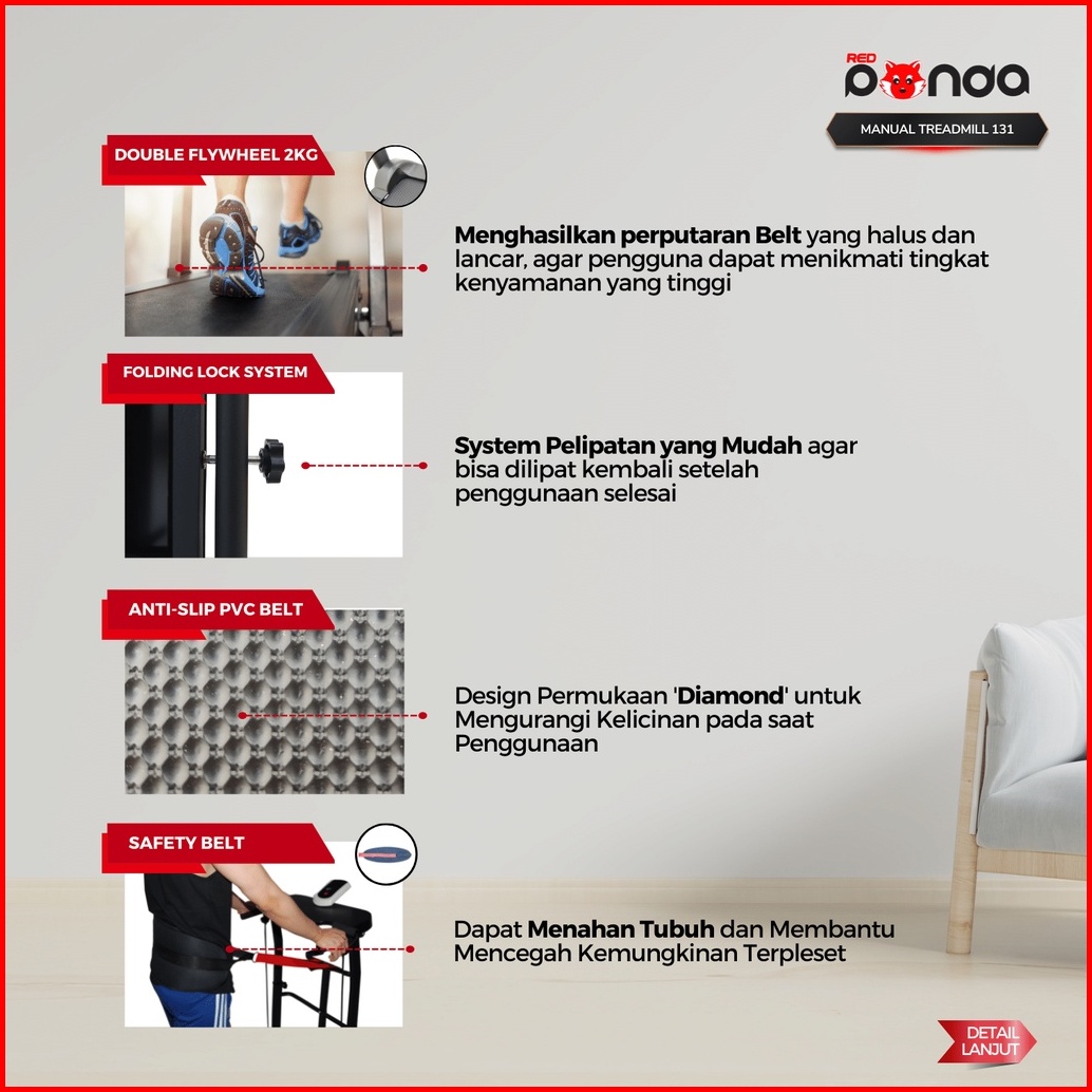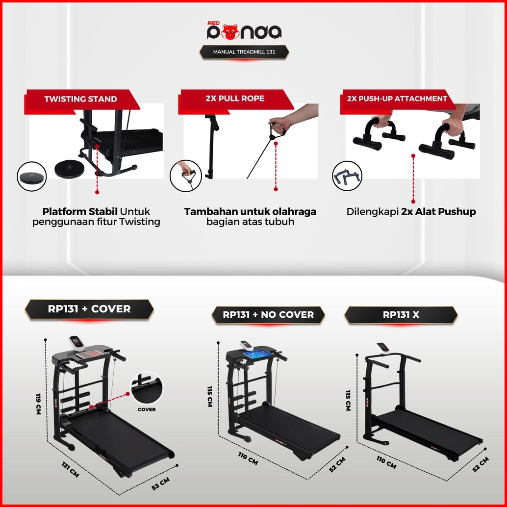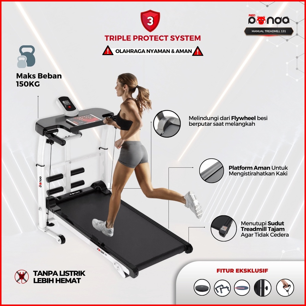 Treadmill Manual Redpanda 131 Multifungsi Tanpa Listrik Lipat Portable Low Watt Fitness Gym