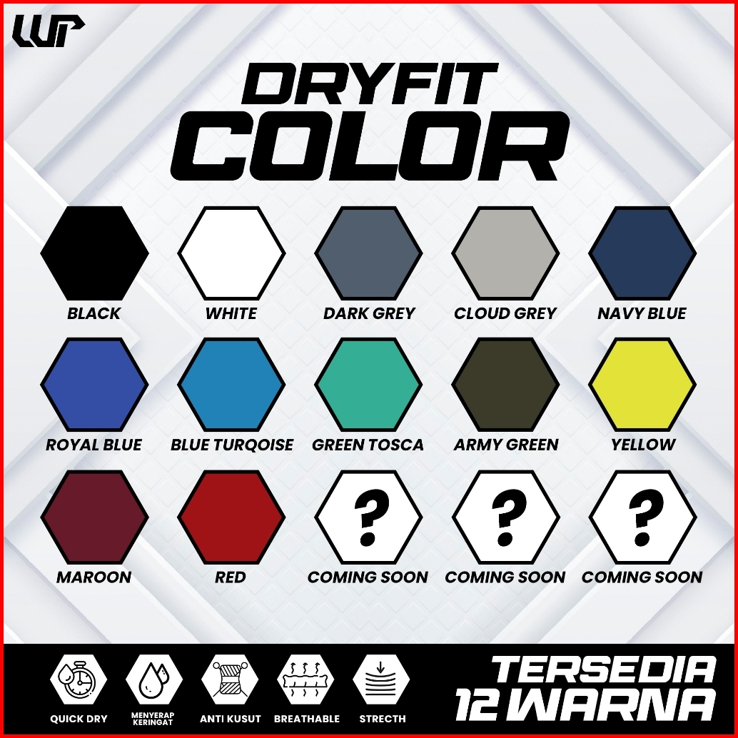 Black, White, Dark Grey, Cloud Grey, Navy Blue, Royal Blue, Maroon, Red, Blue Turqoise, Yellow, Green Tosca, Army Green