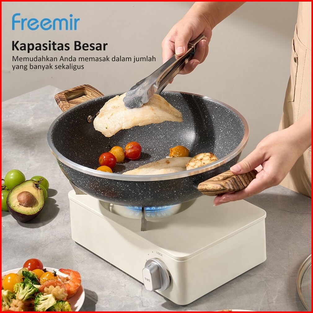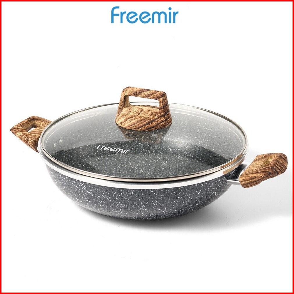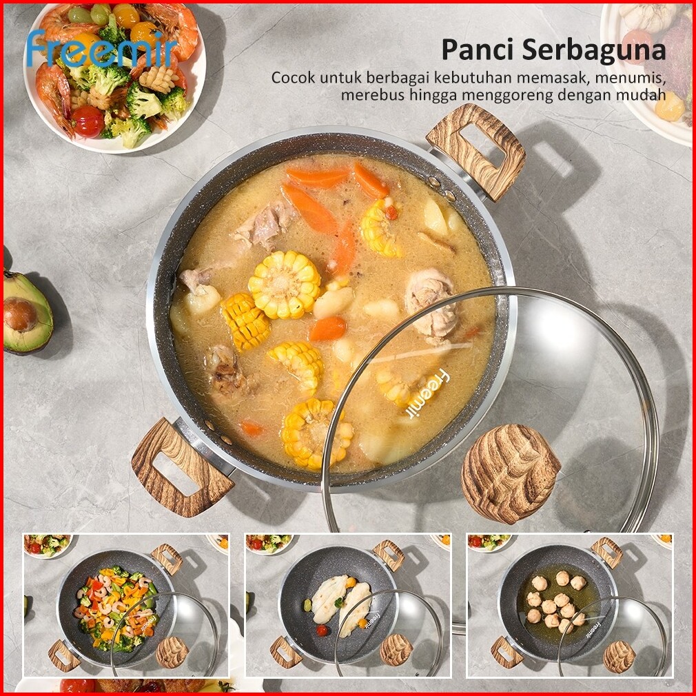 Wajan Kuping 28cm Double Bottom Tutup Kaca Hitam Marble Coating Anti Lengket