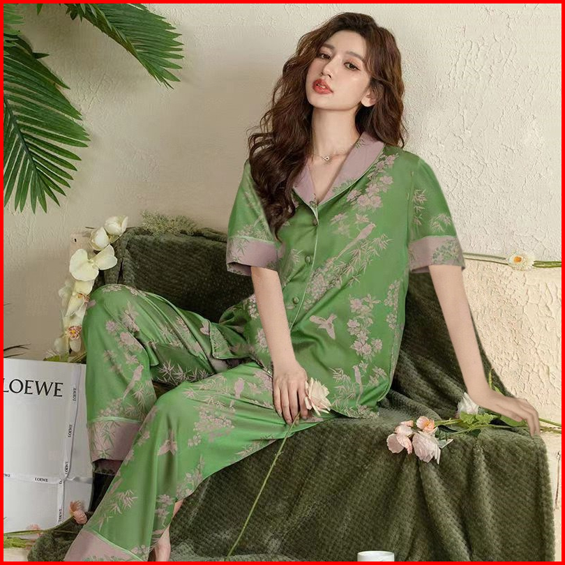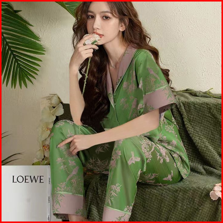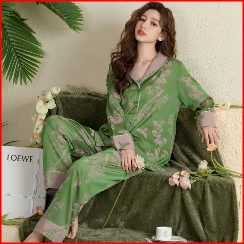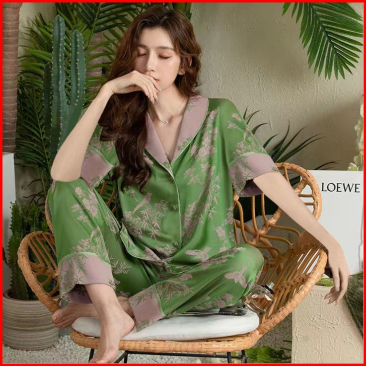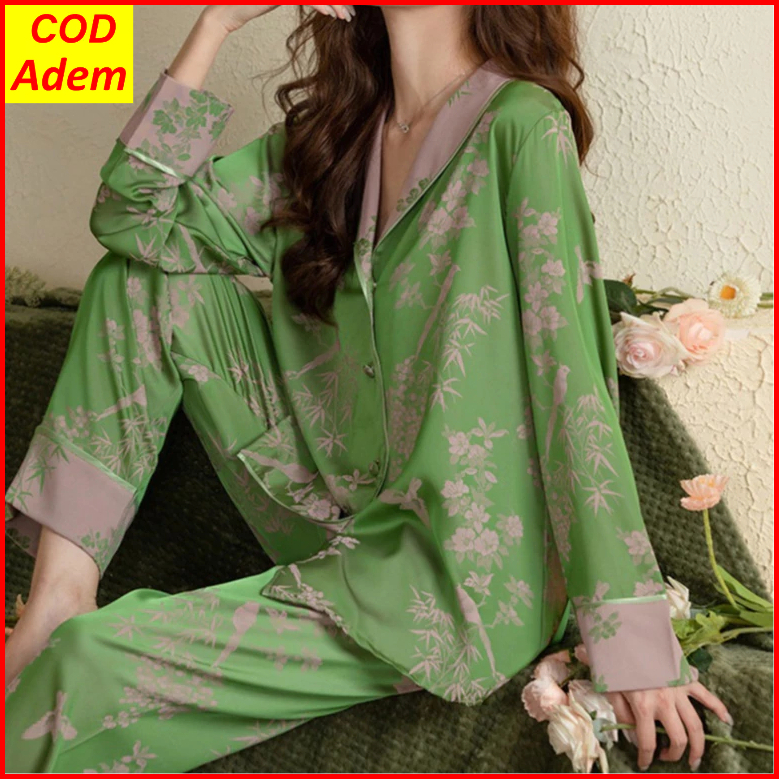 Codpiyama Wanita Setelan Lengan Panjang Rumah Nyaman Baju Tidur Satin Dewasa Hijau Korean Style