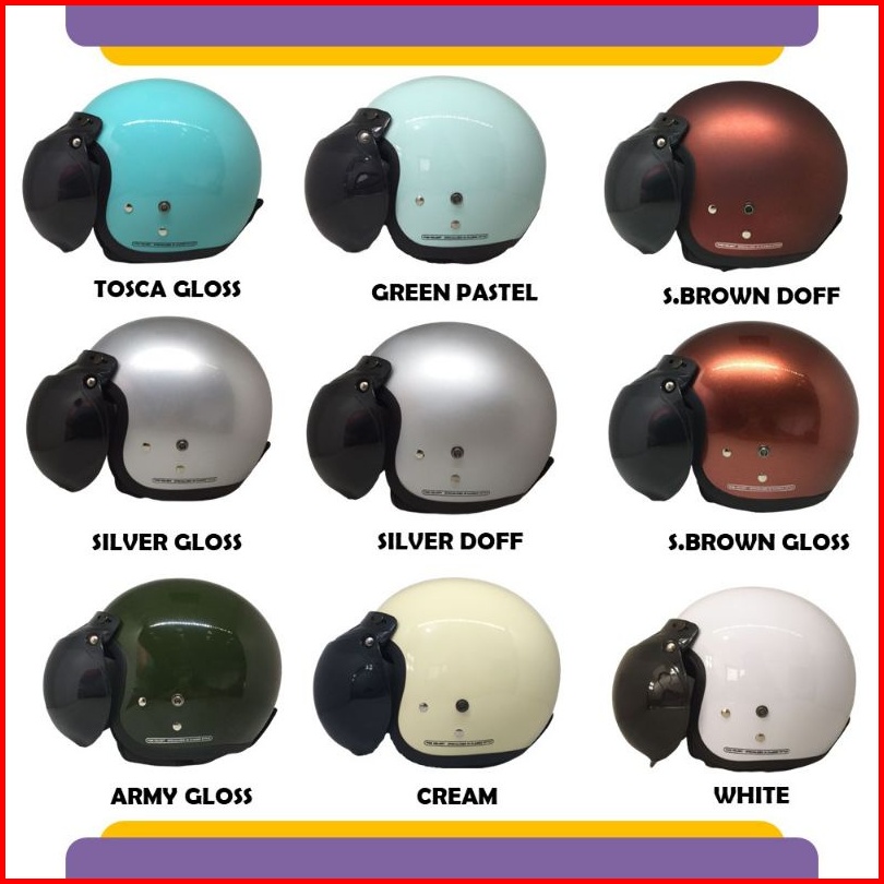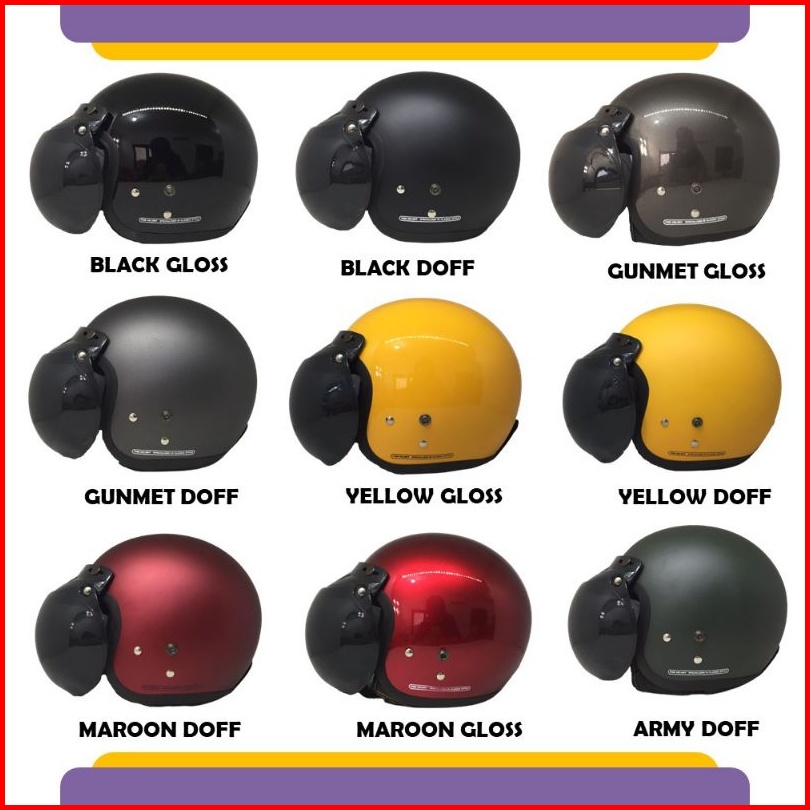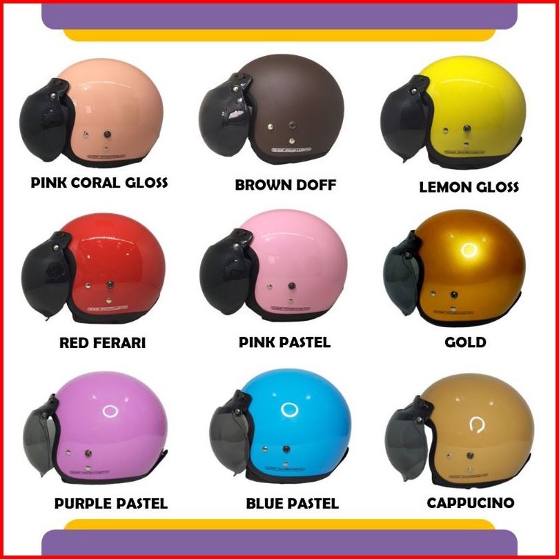 Hitam doff, Hitam glosy, Maroon doff, Abu doff, Cream Glosy, spark brown glosy, cappucino, lilac glosy, abu glosy, Pink glosy, Pink coral, Coklat doff, Putih glosy, green pastel, Navy glosy, Navy doff, army doff, pink coral doff, yellow doff, coklat glosy, Biru glosy, Kuning glosy, Tosca doff, Maroon glosy, Army glosy, Ice blue, Soft lilac, Hitam glosy chrom