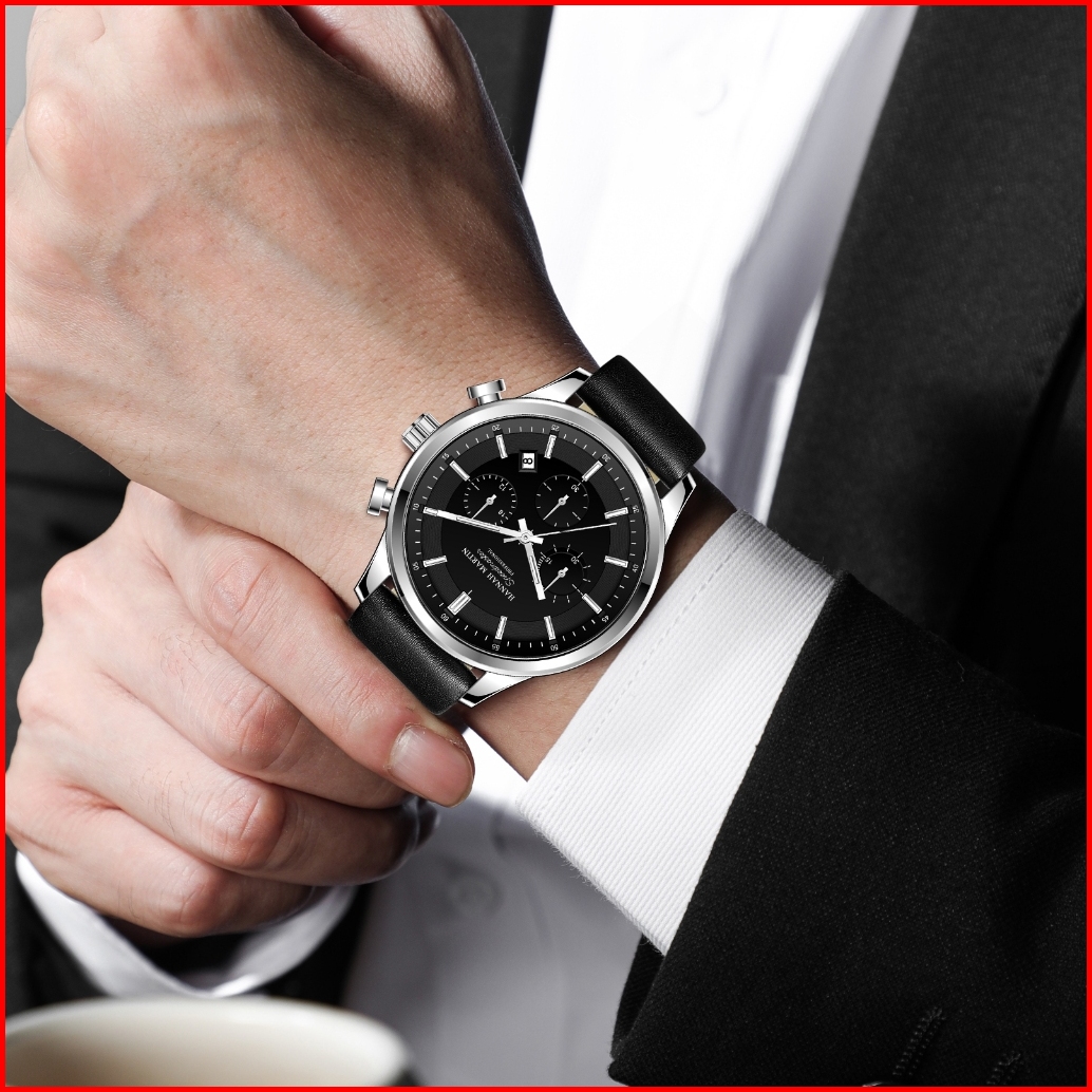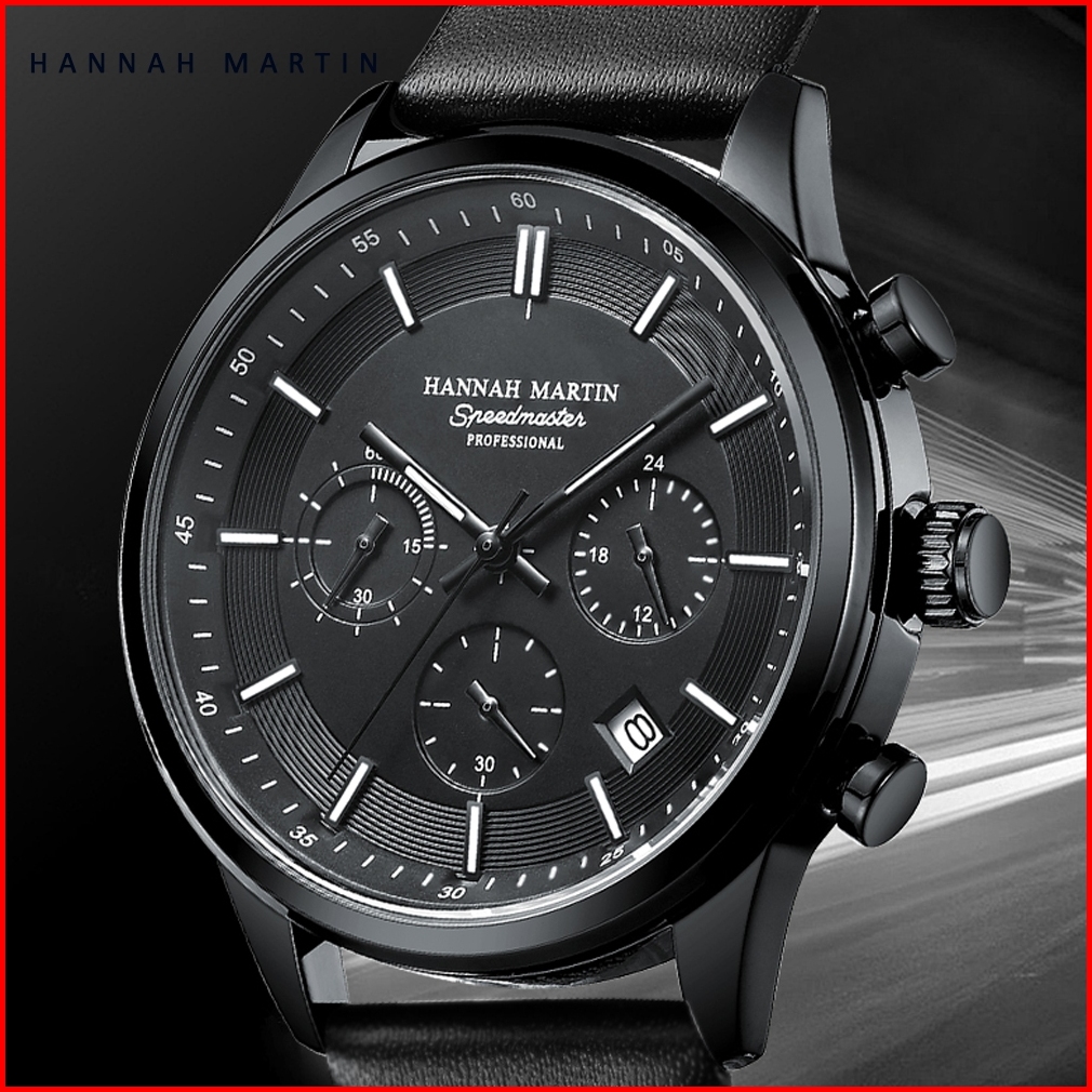 Hannah Martin Jam Tangan Pria 100 Original Kronograf Premium Hitam Kulit Tahan Air Quartz Analog Laki Jam Cowok Anti Air