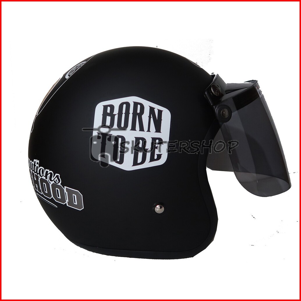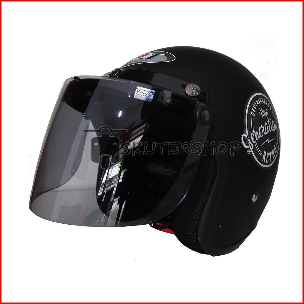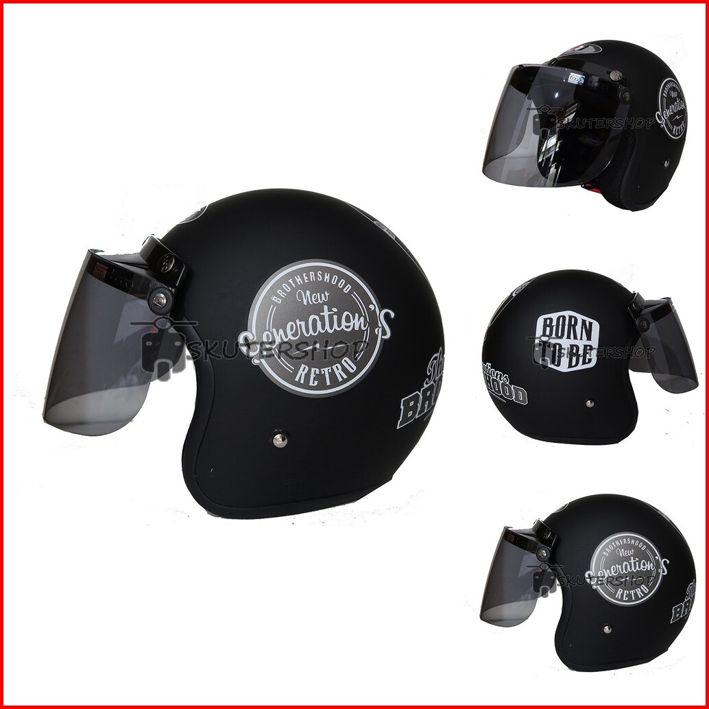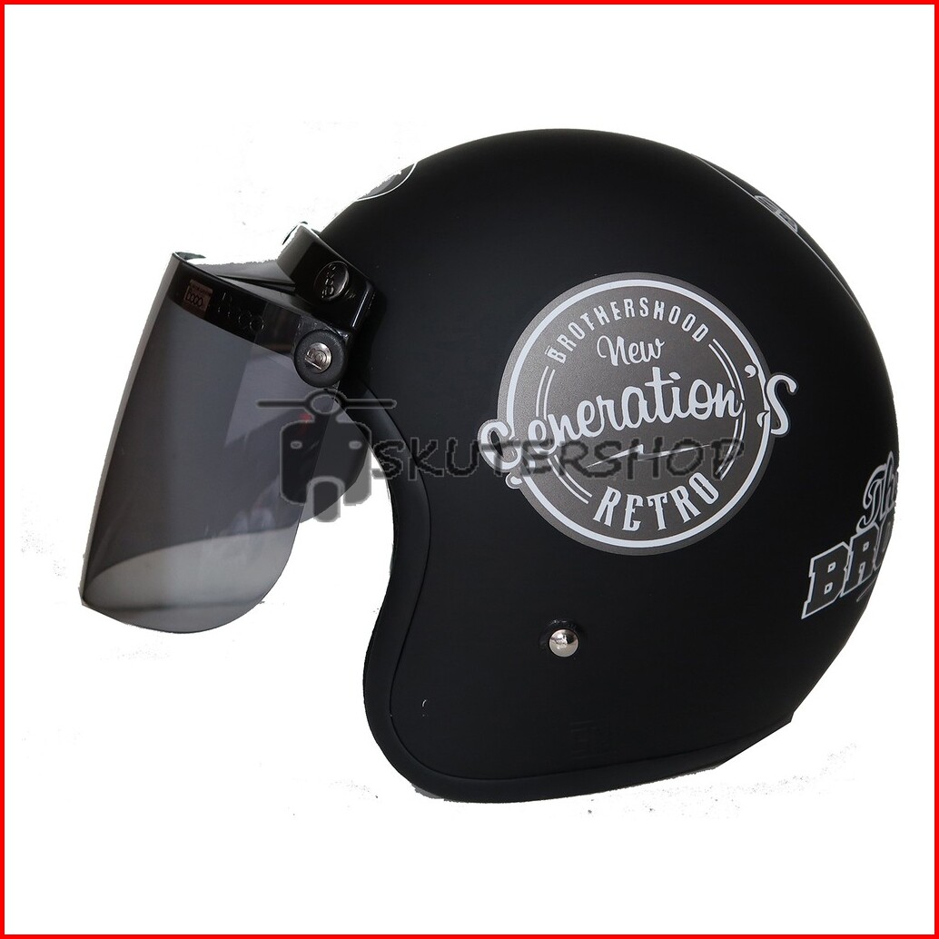 Helm Bogo Jpn Retro Brotherhood New Generation Hitam Doff Motif Silver With Kaca Bogo Datar Smoke