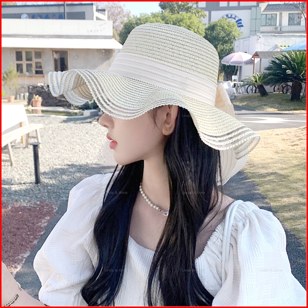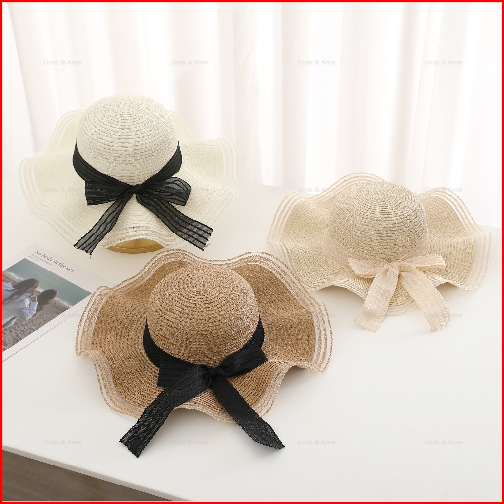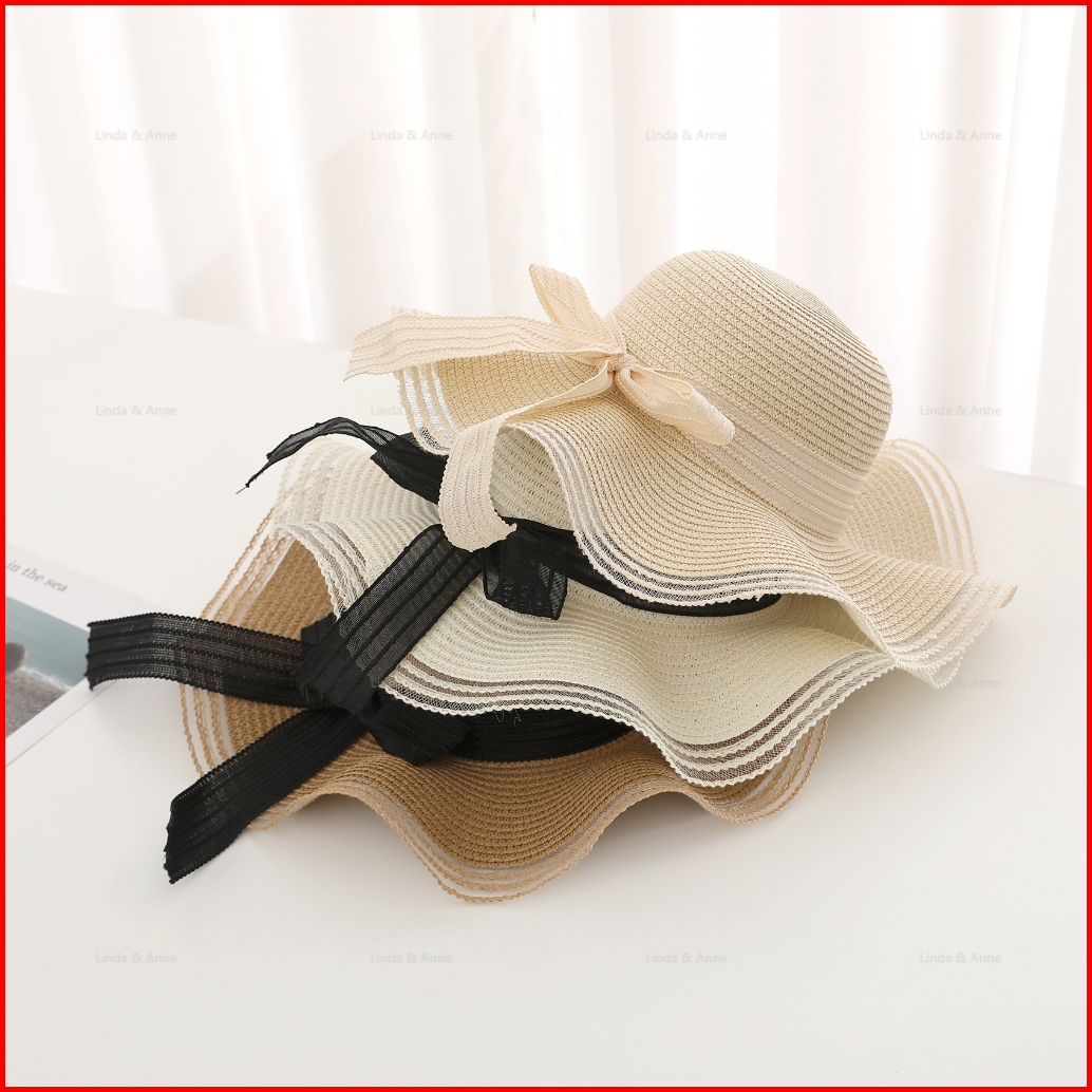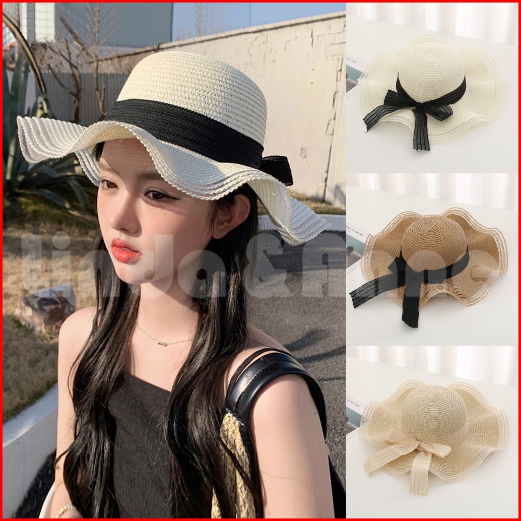 L A - Topi Pantai Wanita Gelombang Topi Bundar Aksen Pita Cantik