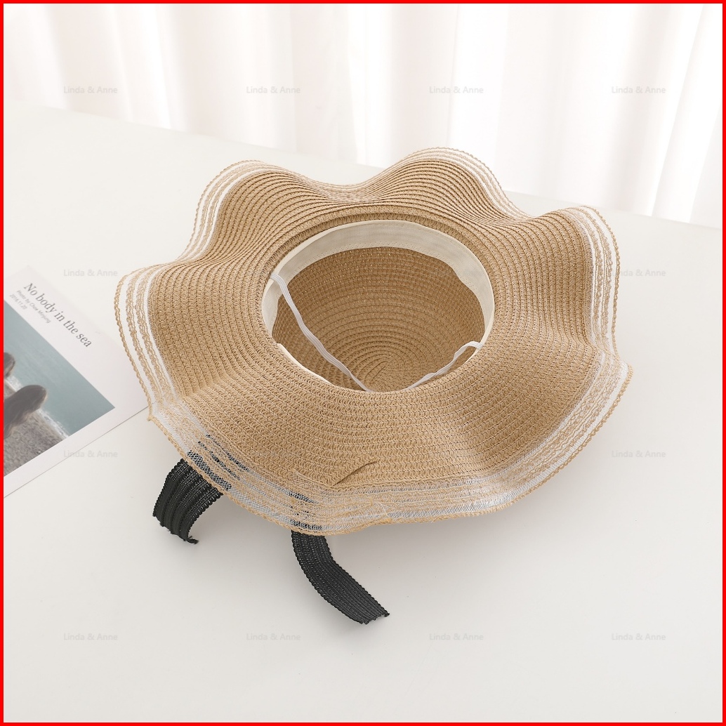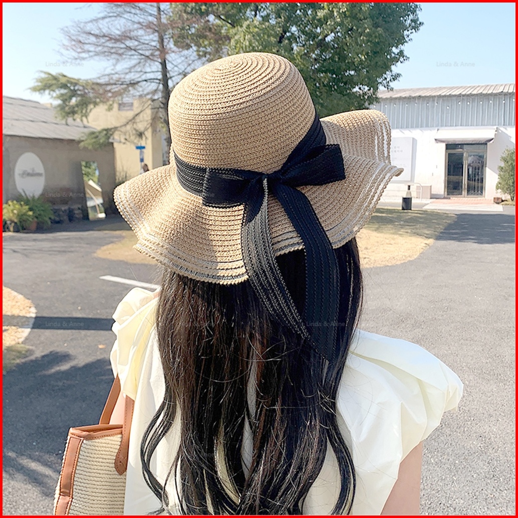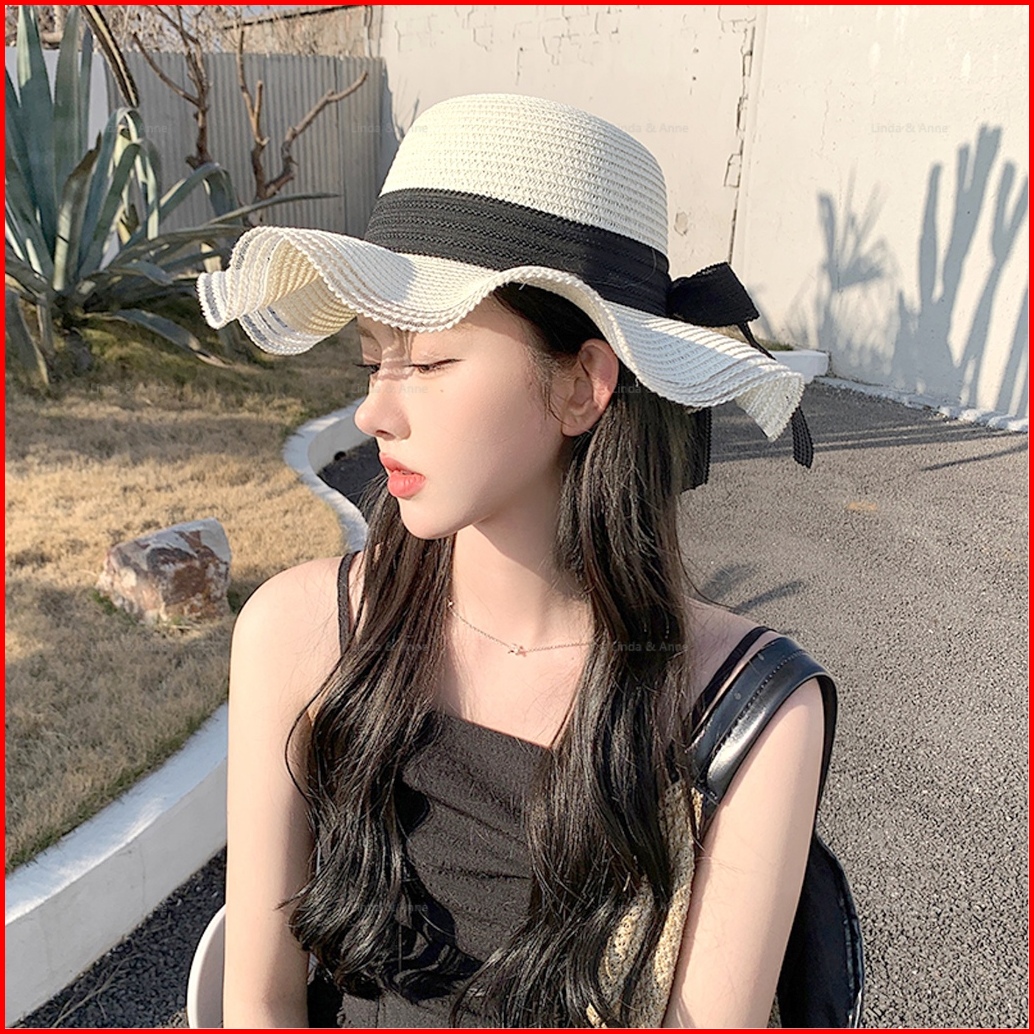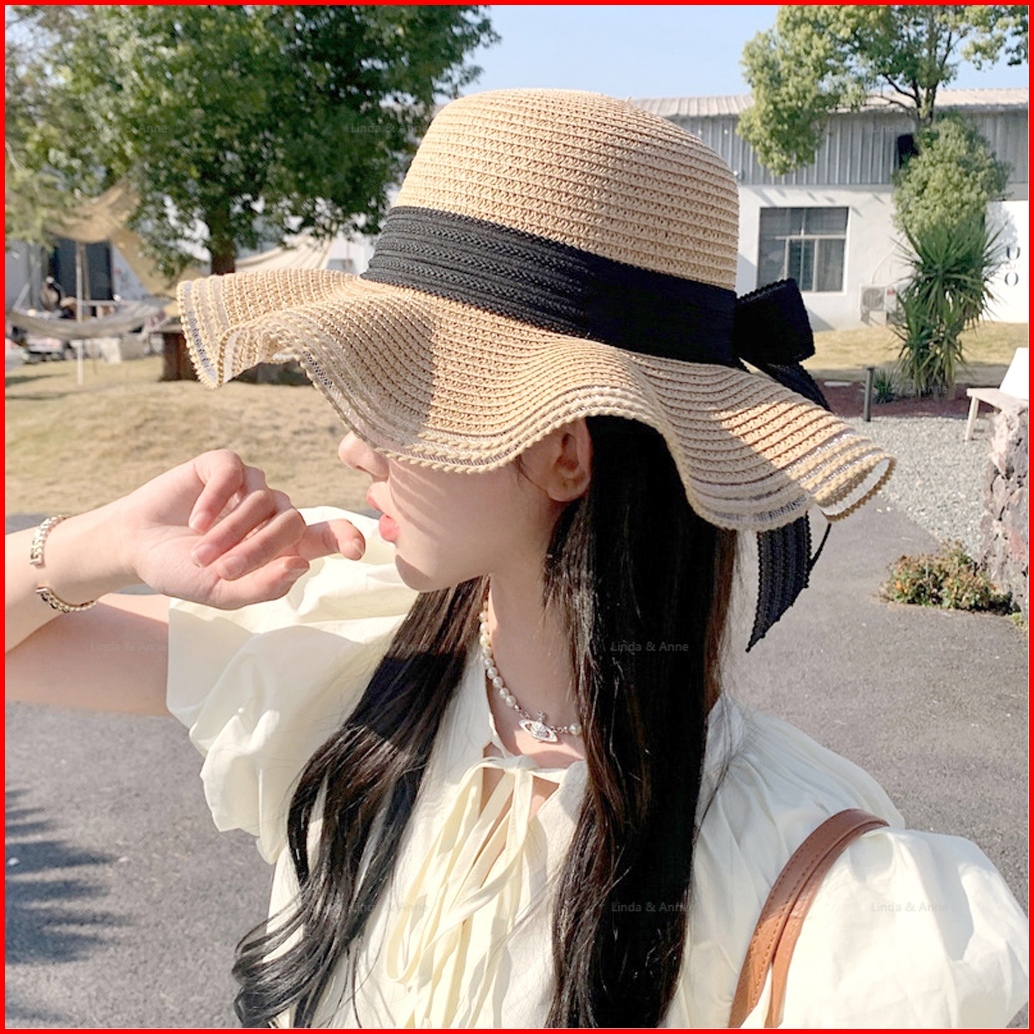 L A - Topi Pantai Wanita Gelombang Topi Bundar Aksen Pita Cantik